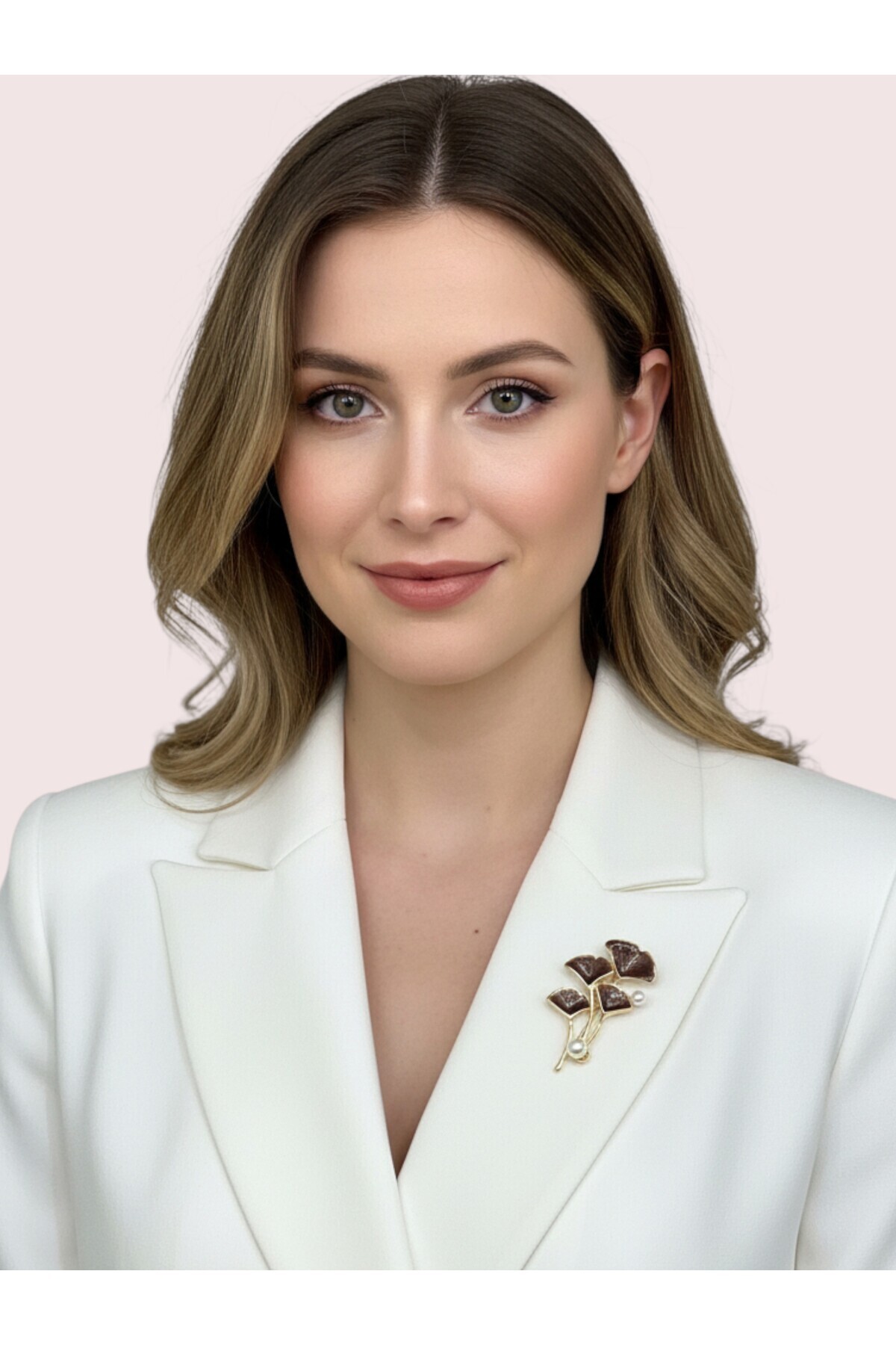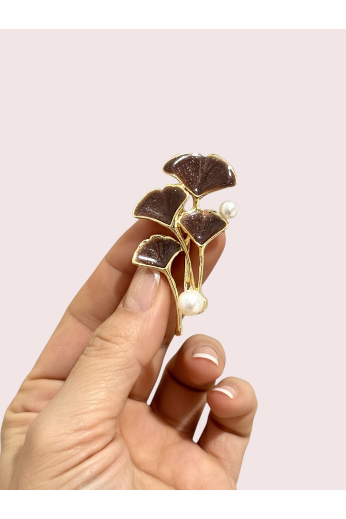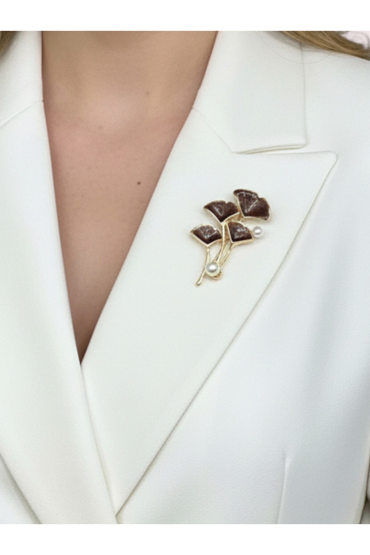 The leaf / flower design, which combines elegance and naturalness, dazzles with its brooch, golden-toned branches and pearl detail.