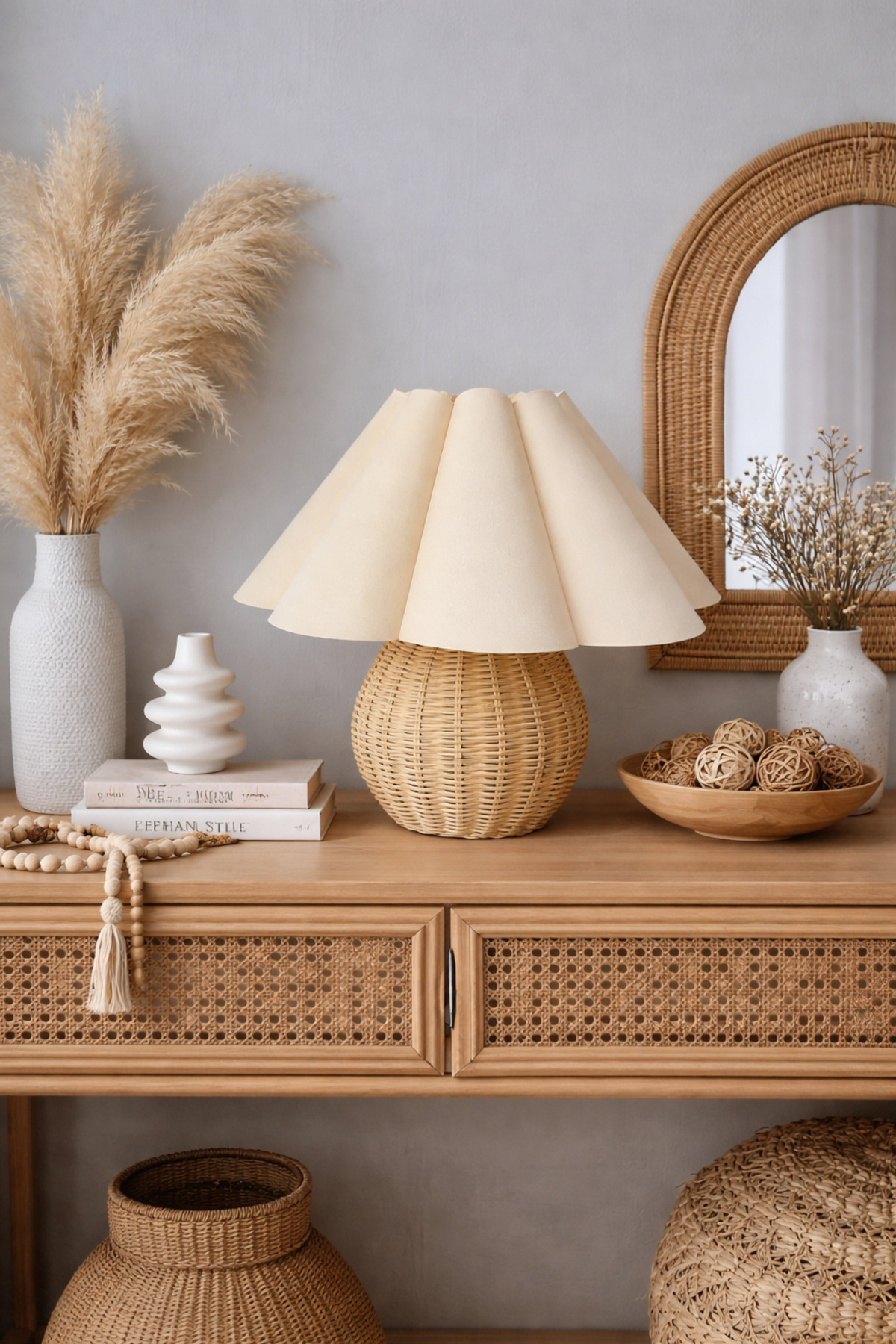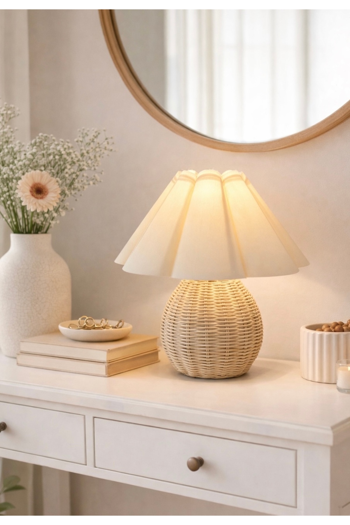 Modern Lampshade Fico Cream Fabric Wicker Rattan Bamboo Body Table Lamp