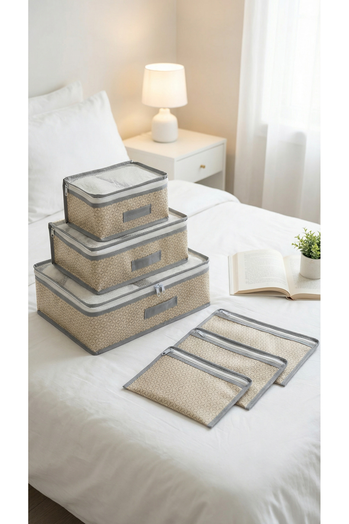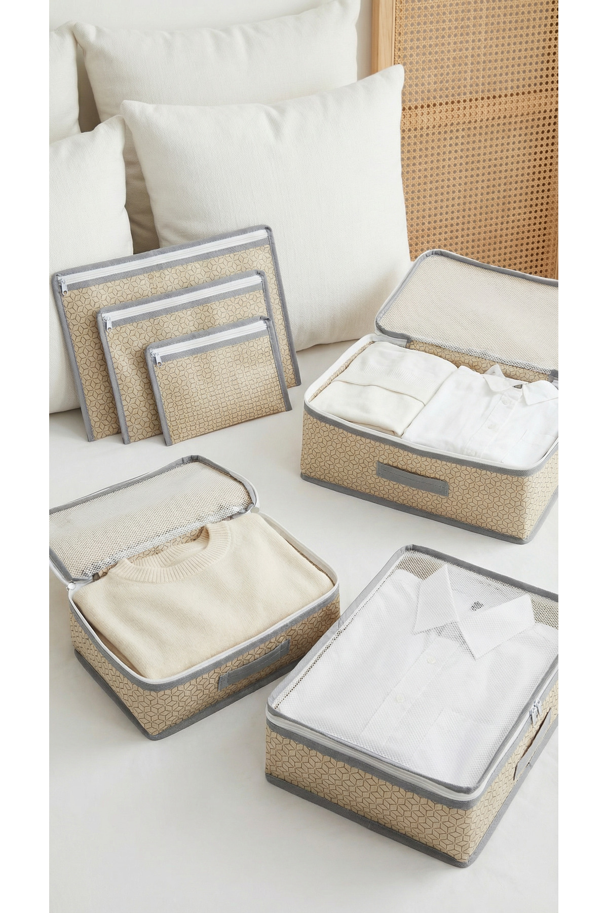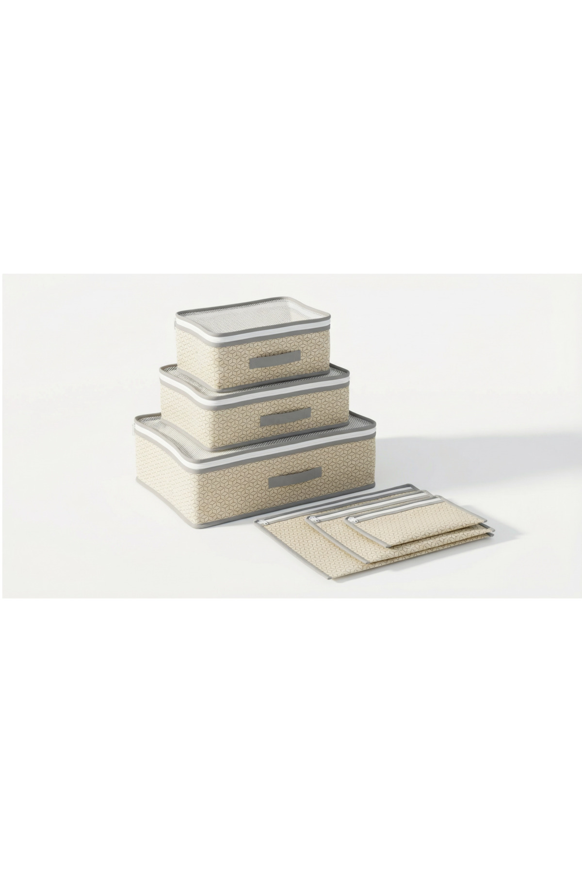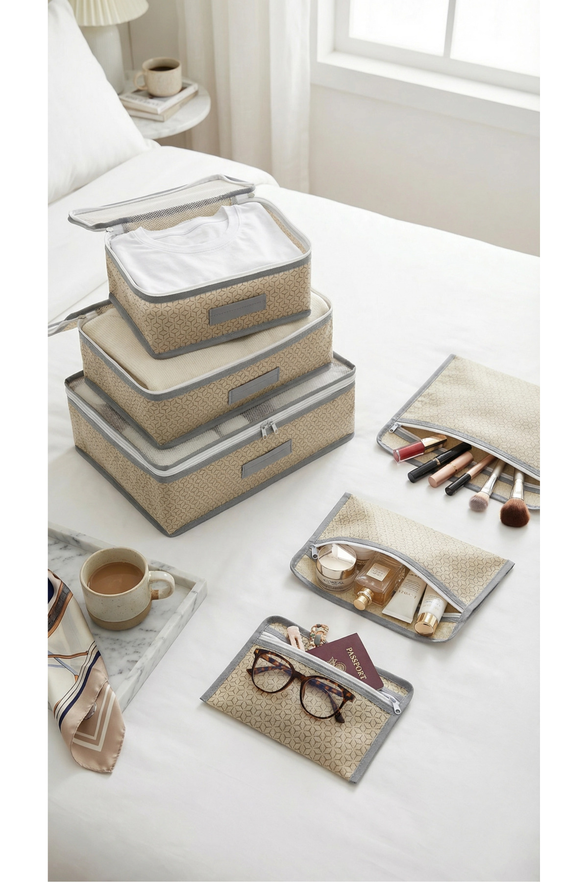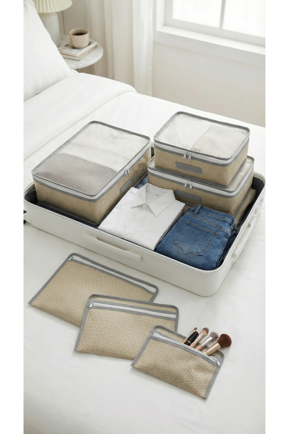 Evsella 6-Pack Beige Luggage Organizer In-Luggage Organizer Product Color: Beige - Geometric Pattern Package Content: Catch the Perfect Layout in Your Travels with 6 Pieces of Luggage and Luggage Organizer Travel Organizer Set! Stop ransacking the entire suitcase to find the item you're looking for! Your travels are now much more enjoyable and practical with our 6-piece suitcase organizer set, which is eye-catching with its stylish geometric patterned beige color.