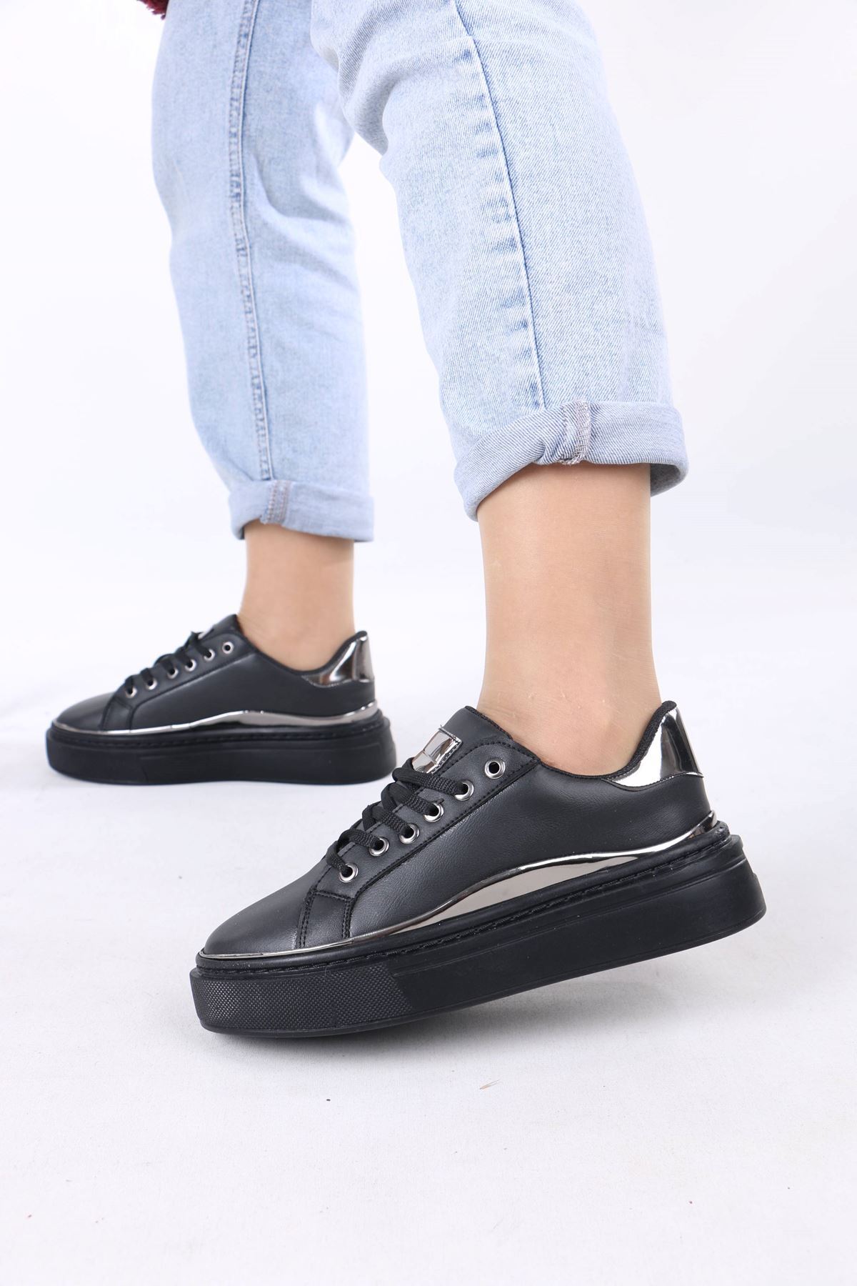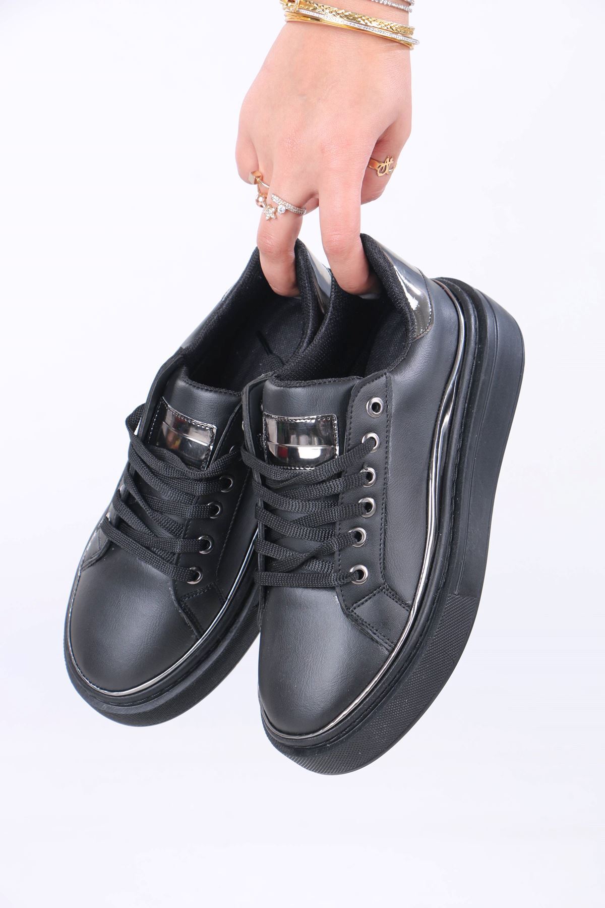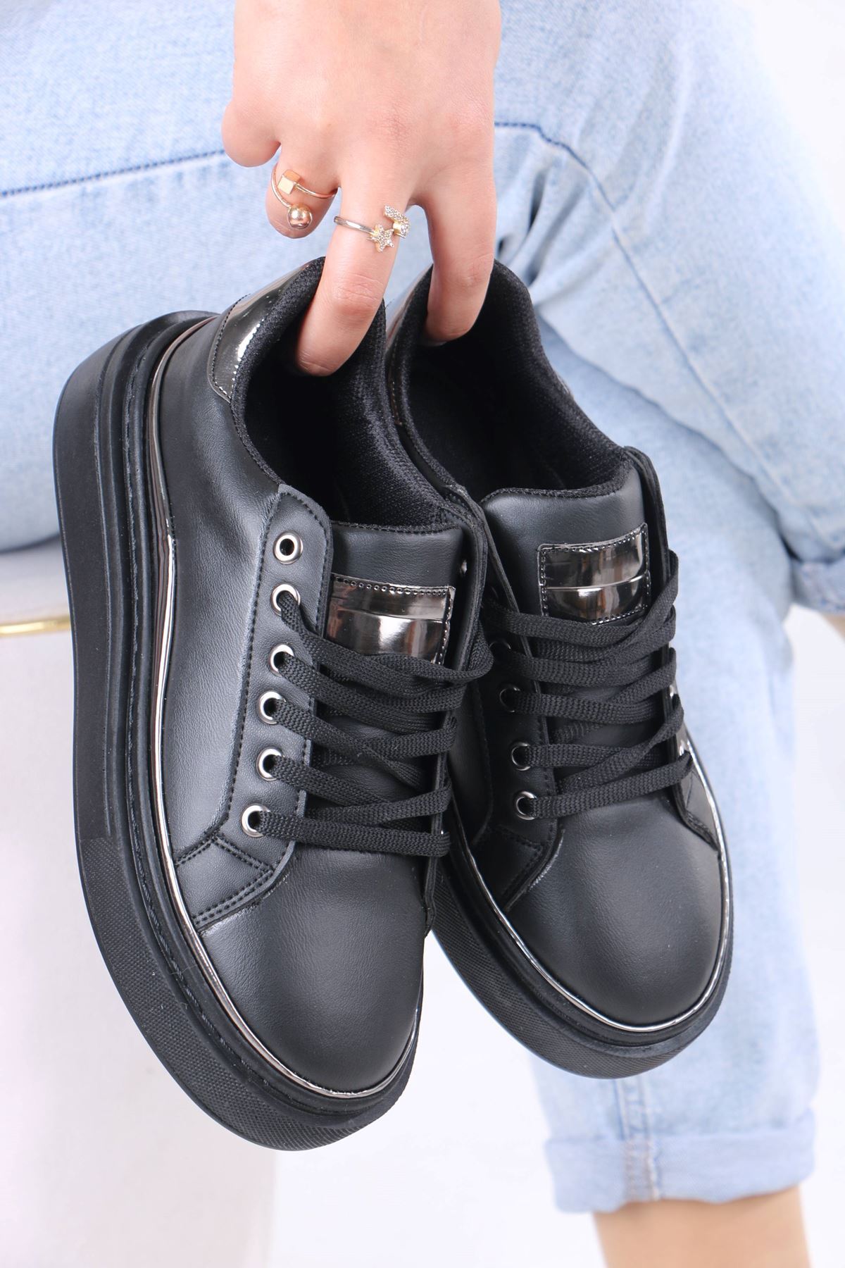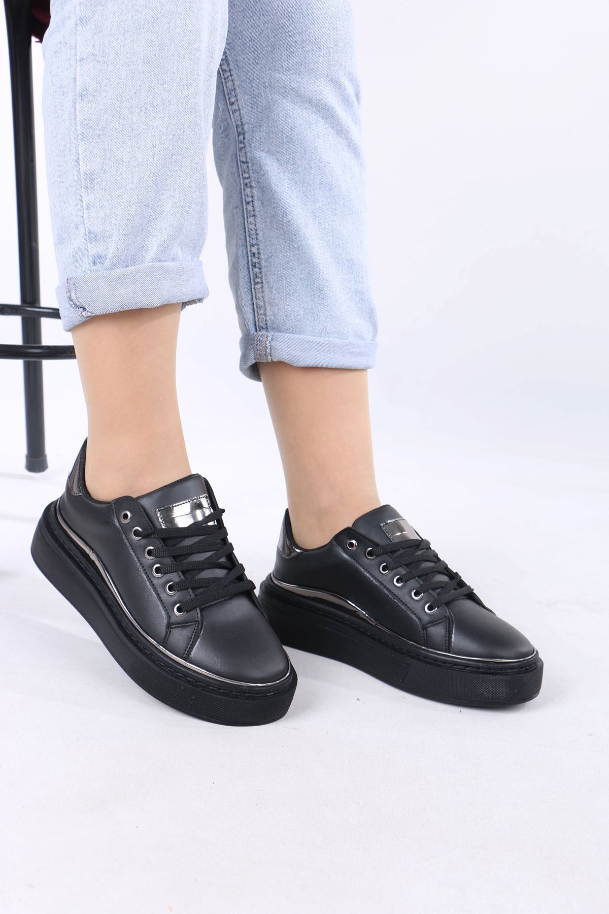 sefayol Kalle Black Matte Leather Lace-Up Women's Sports Shoes | ByTR