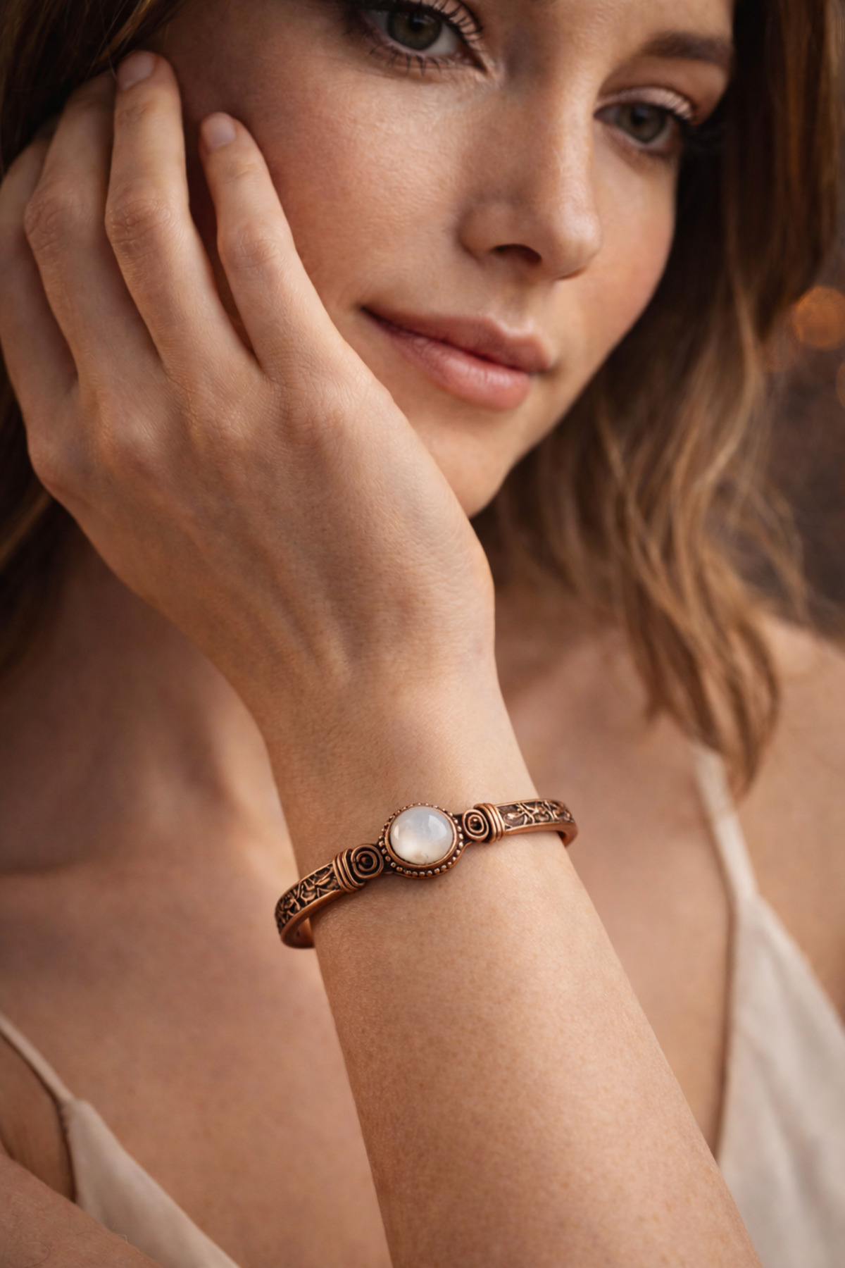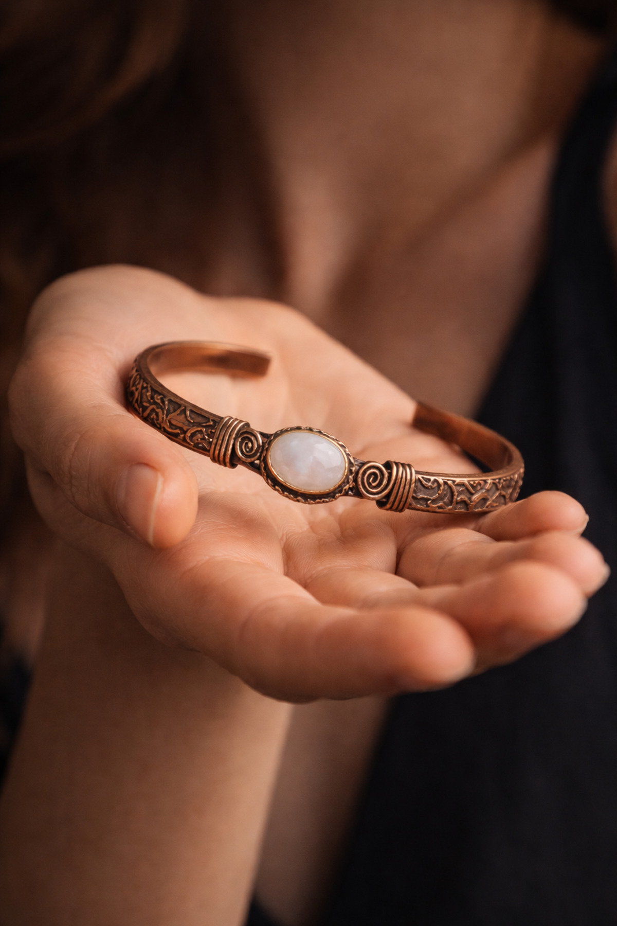 This bracelet, each hand sculpted with care, offers a unique look on your wrist with the soft glow of natural stone and the warm tone of copper.