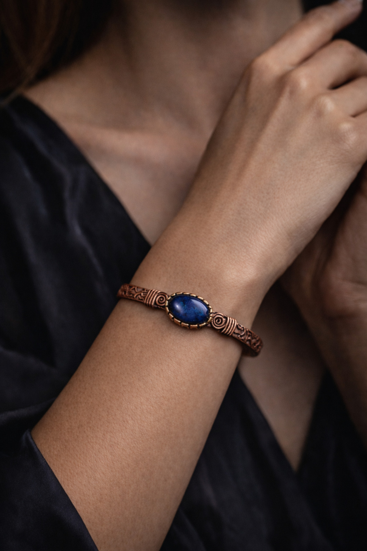 Antique Motif Navy Blue Gemstone Copper Bracelet – Adjustable