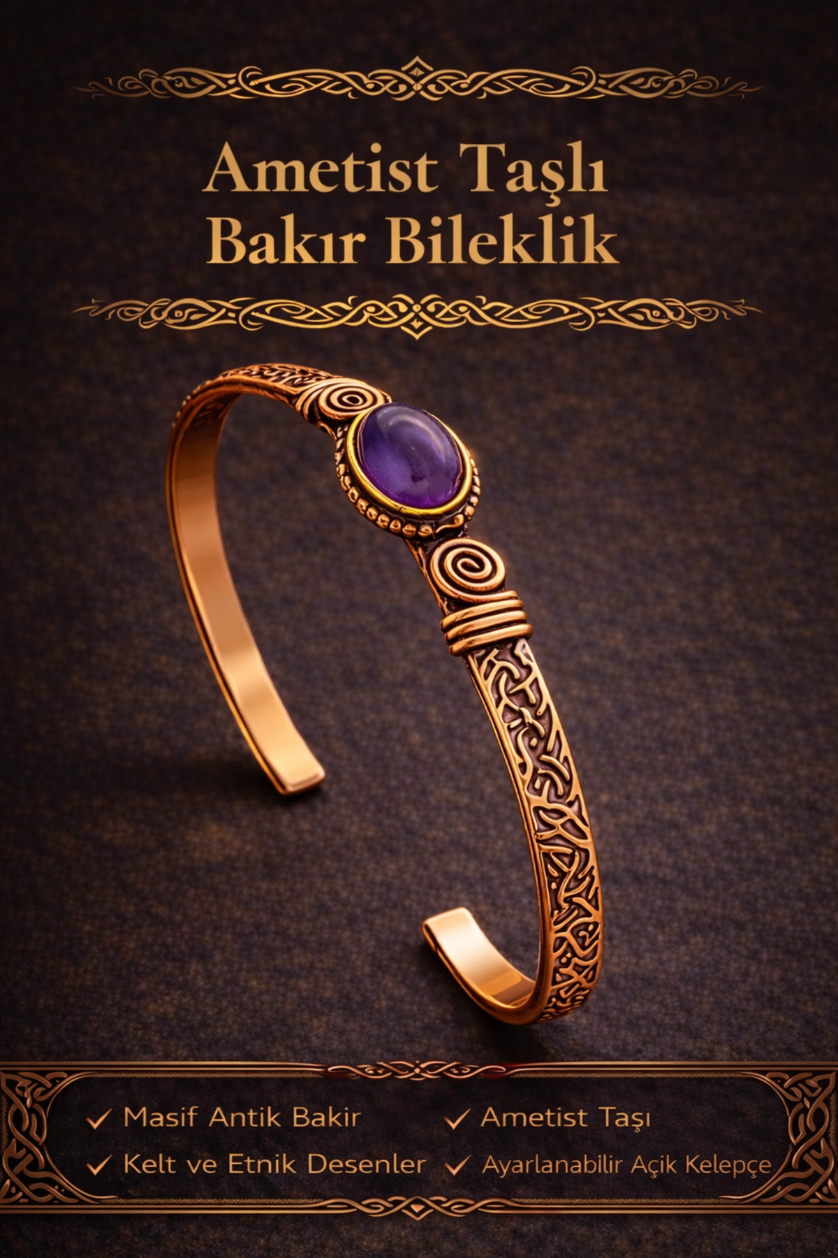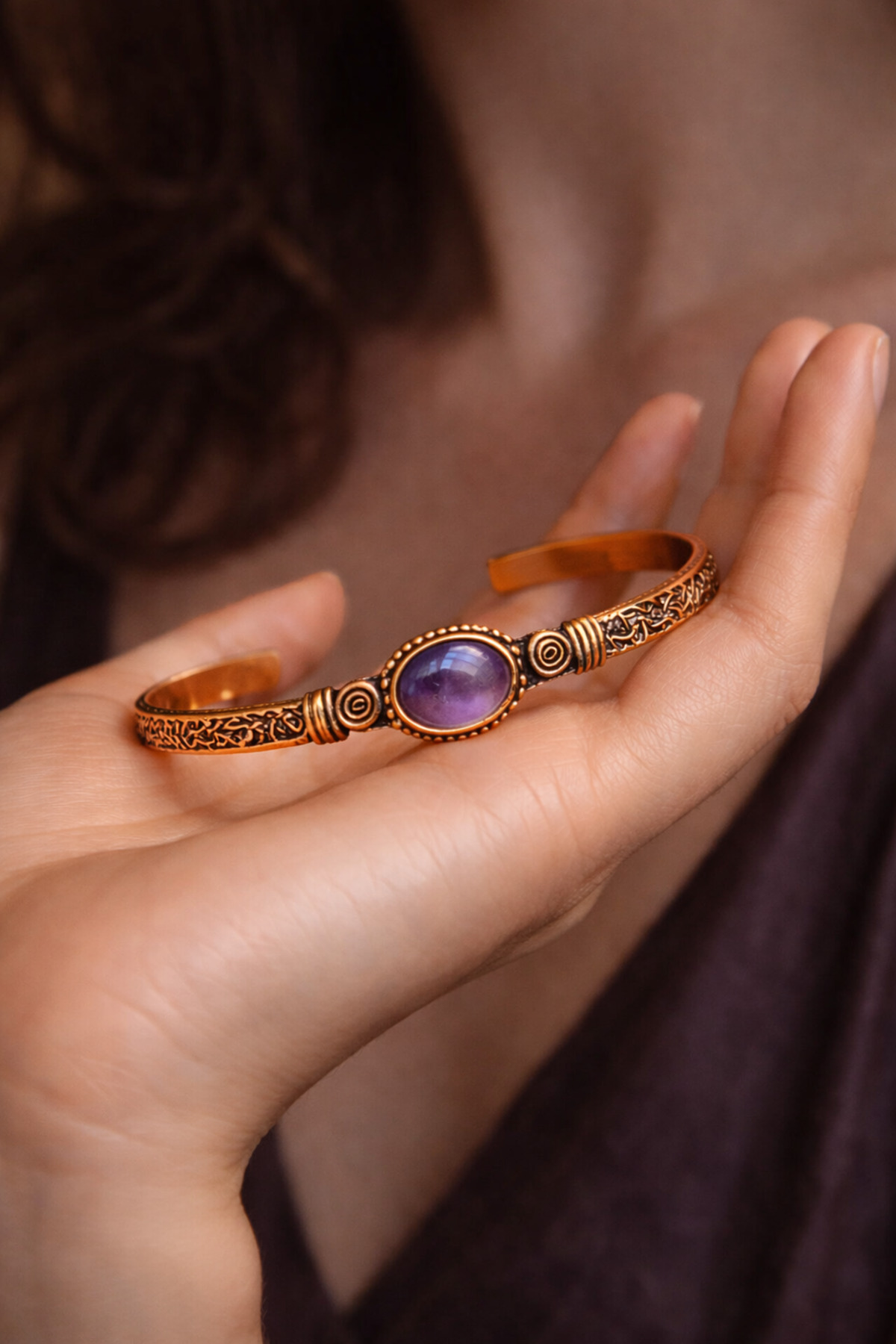 Combining the elegance of natural amethyst stone and the warm texture of copper, this special bracelet is designed to complement your style in everyday wear and special moments.