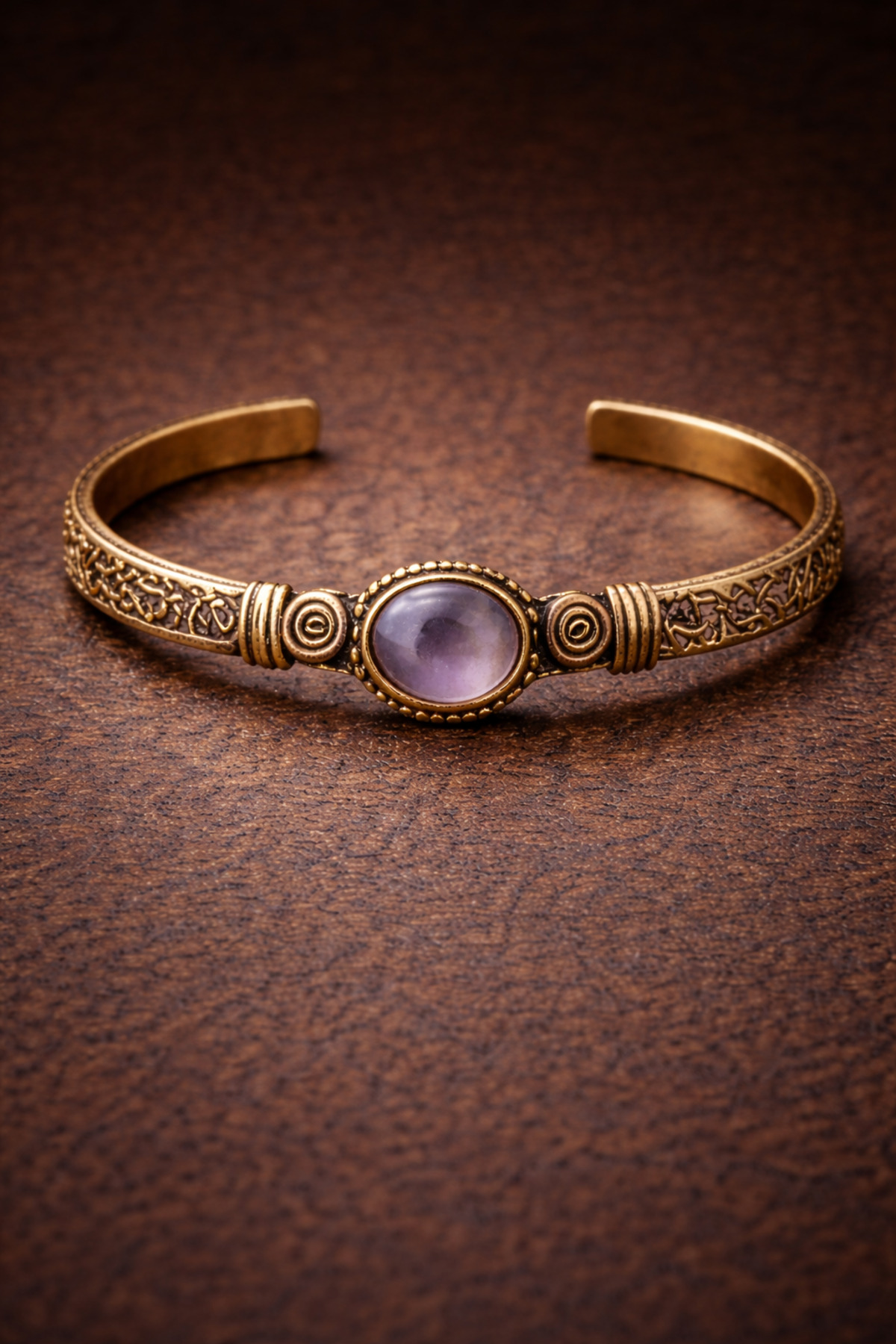 The copper body with handcrafted details is enriched with ethnic and Celtic inspired patterns and gives a simple but impressive appearance with the amethyst stone in the center.
