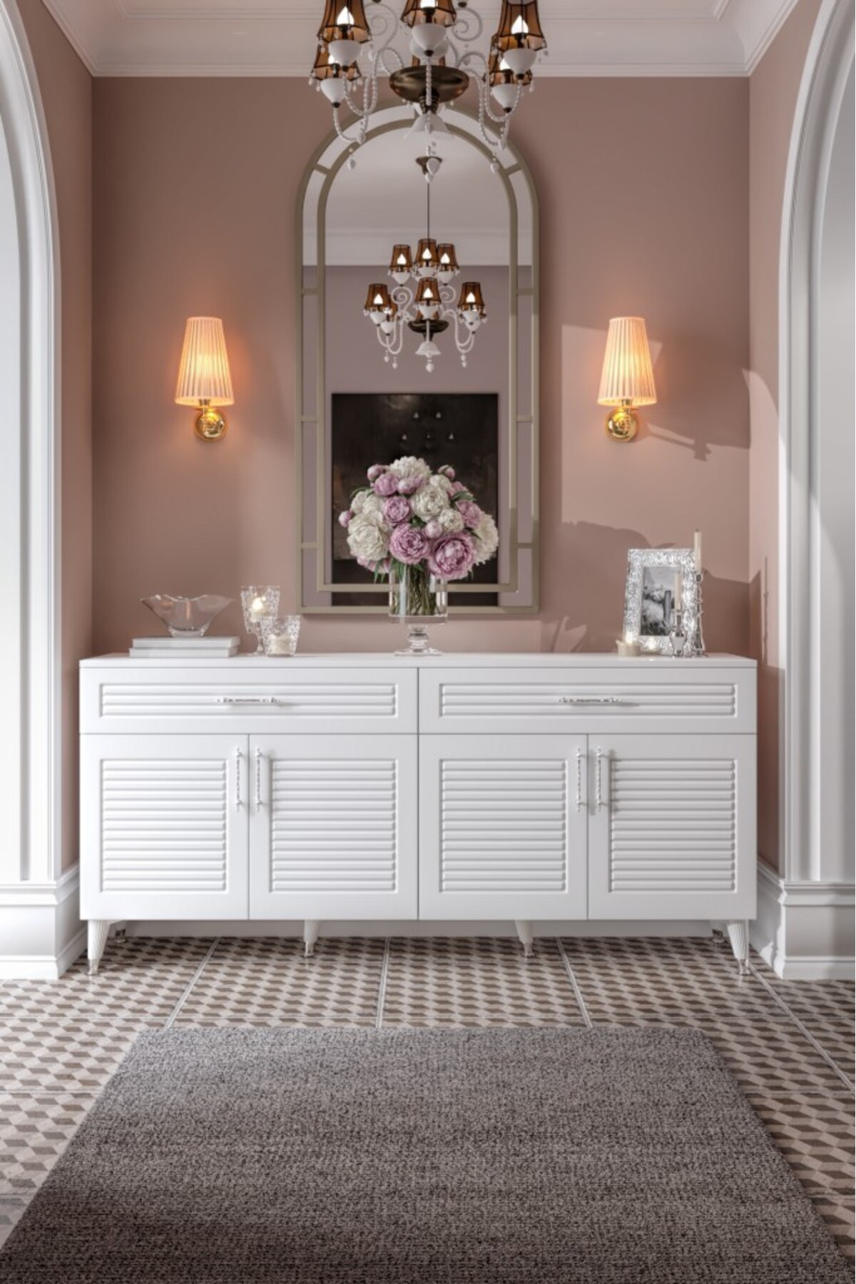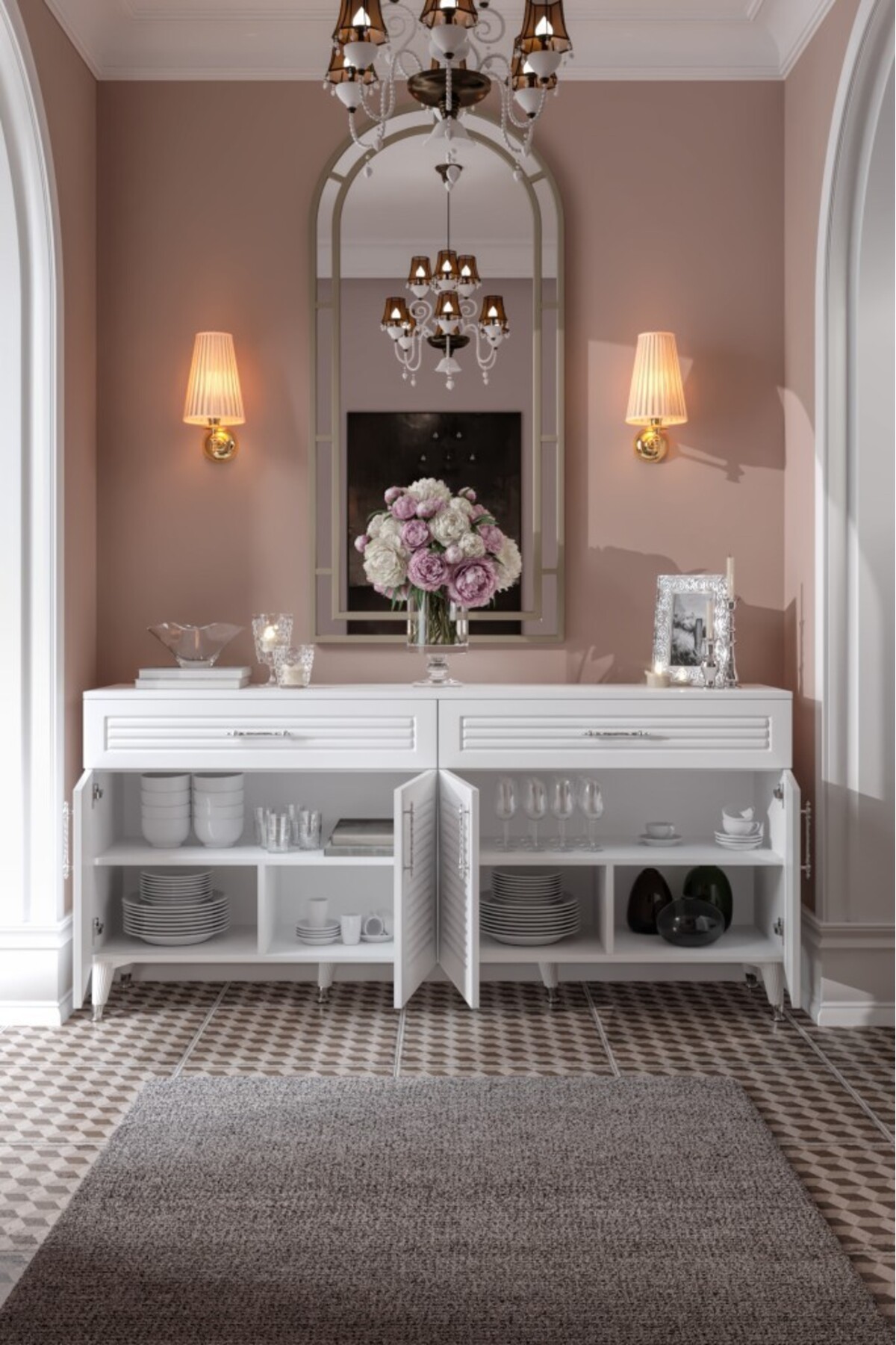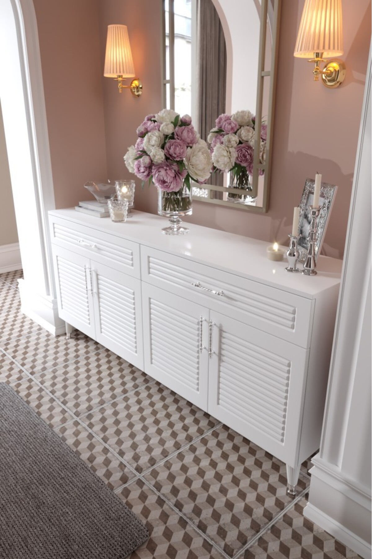 The console with 4 doors and 2 drawers creates the ideal space for daily use and guest tables thanks to its spacious interior.
