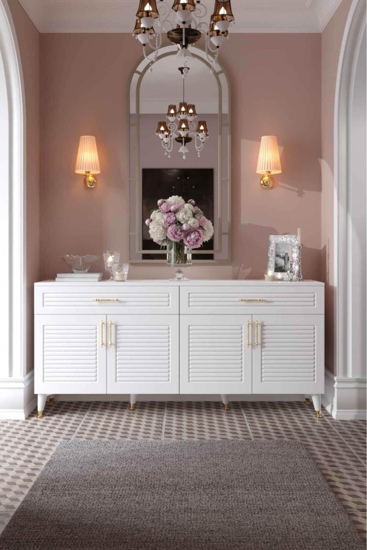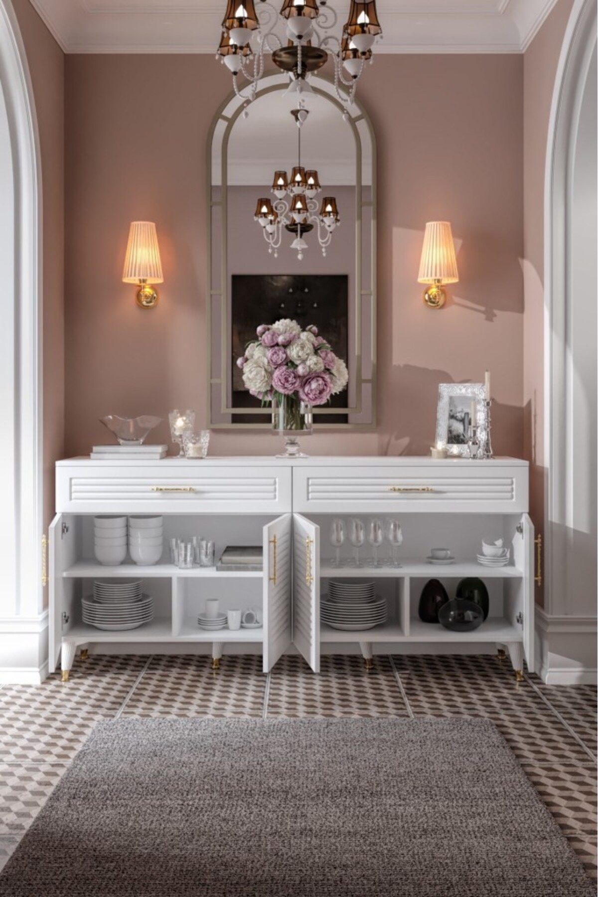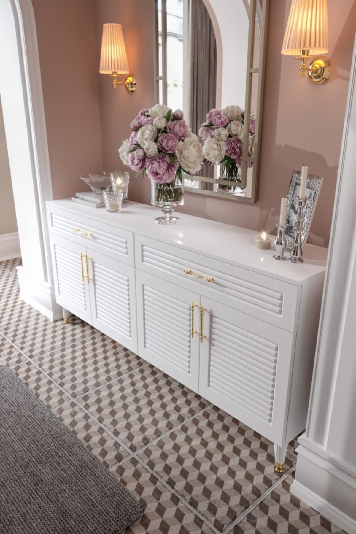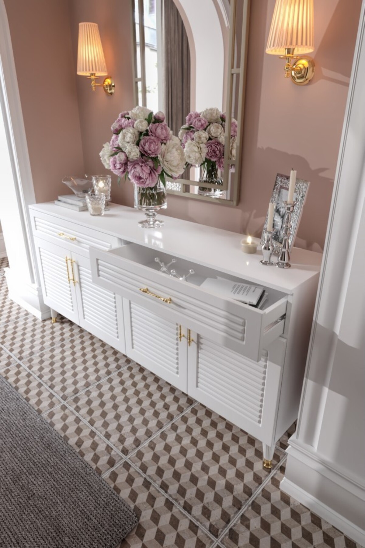 The console with 4 doors and 2 drawers creates the ideal space for daily use and guest tables thanks to its spacious interior.