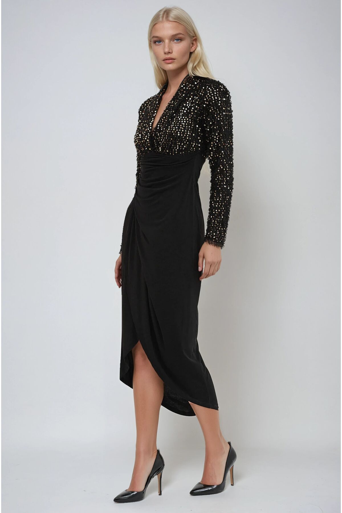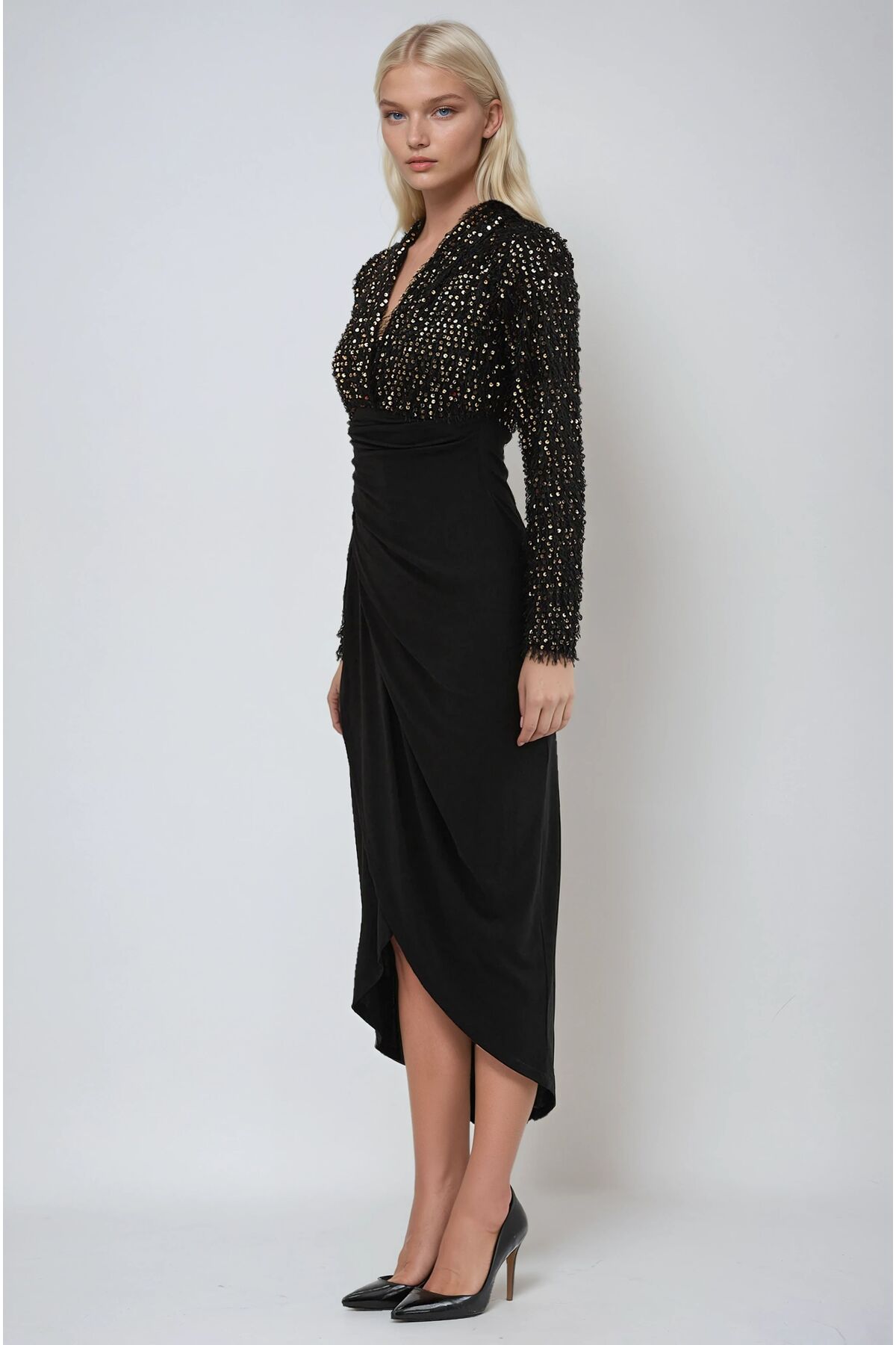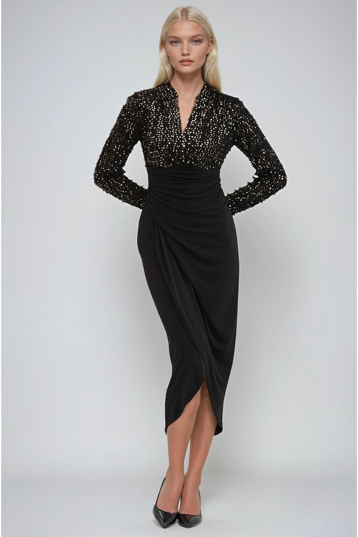 With its long-sleeved design, it offers comfort without compromising your elegance in seasonal transitions and cool weather.
