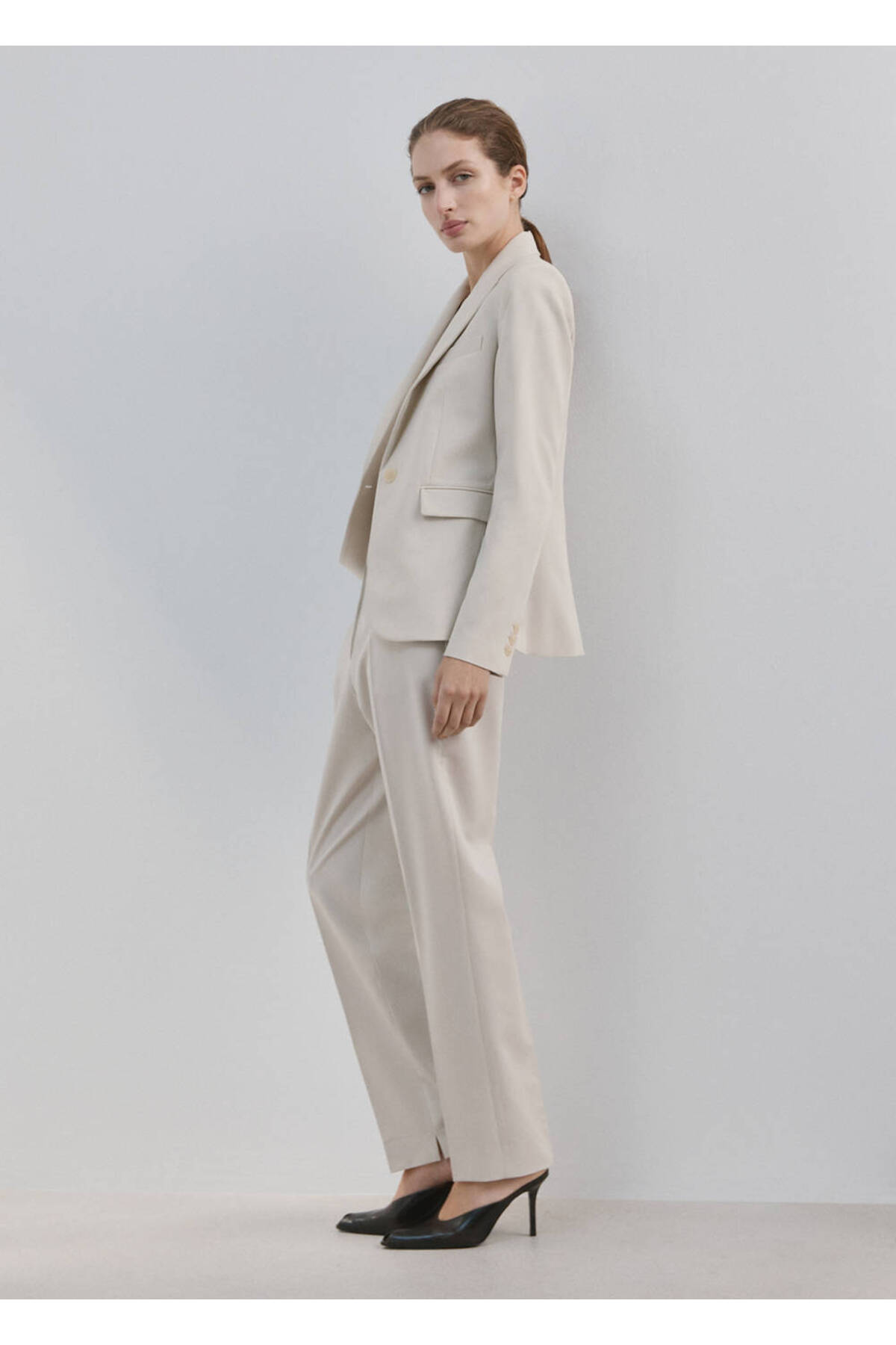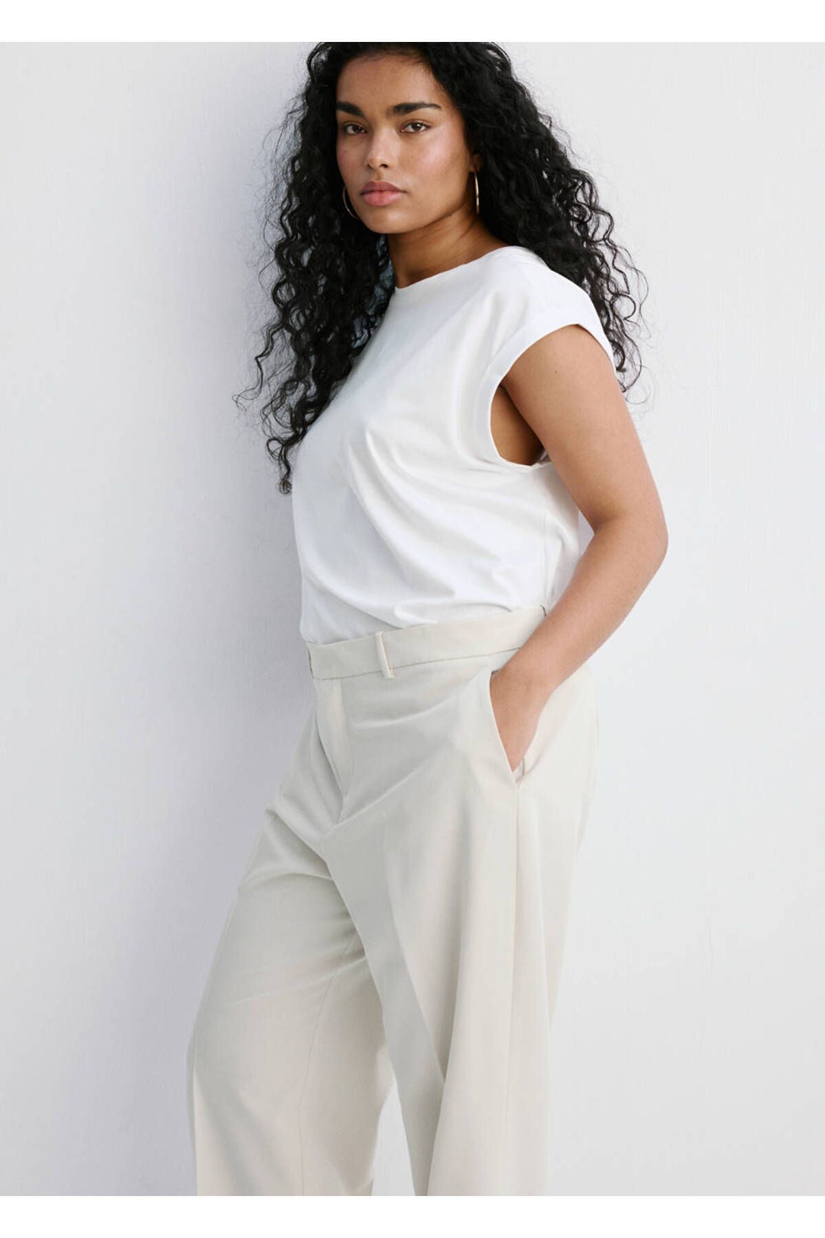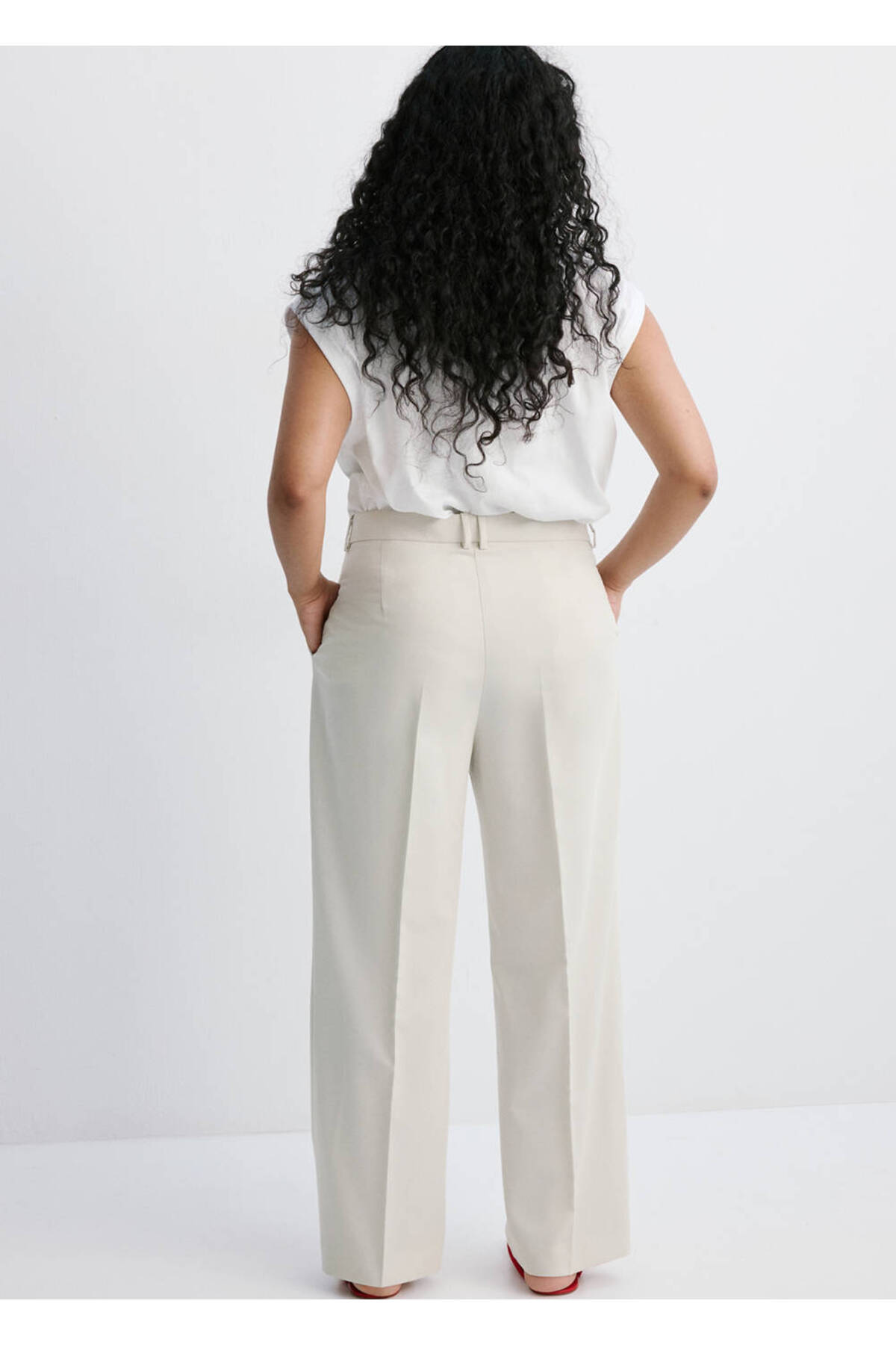 Flat Design, Suit style, Middle waist, Belt rings, Two side pockets, Two pockets on the back, Hidden button, with hook and zipper closure, Disponible Plus, Total look.