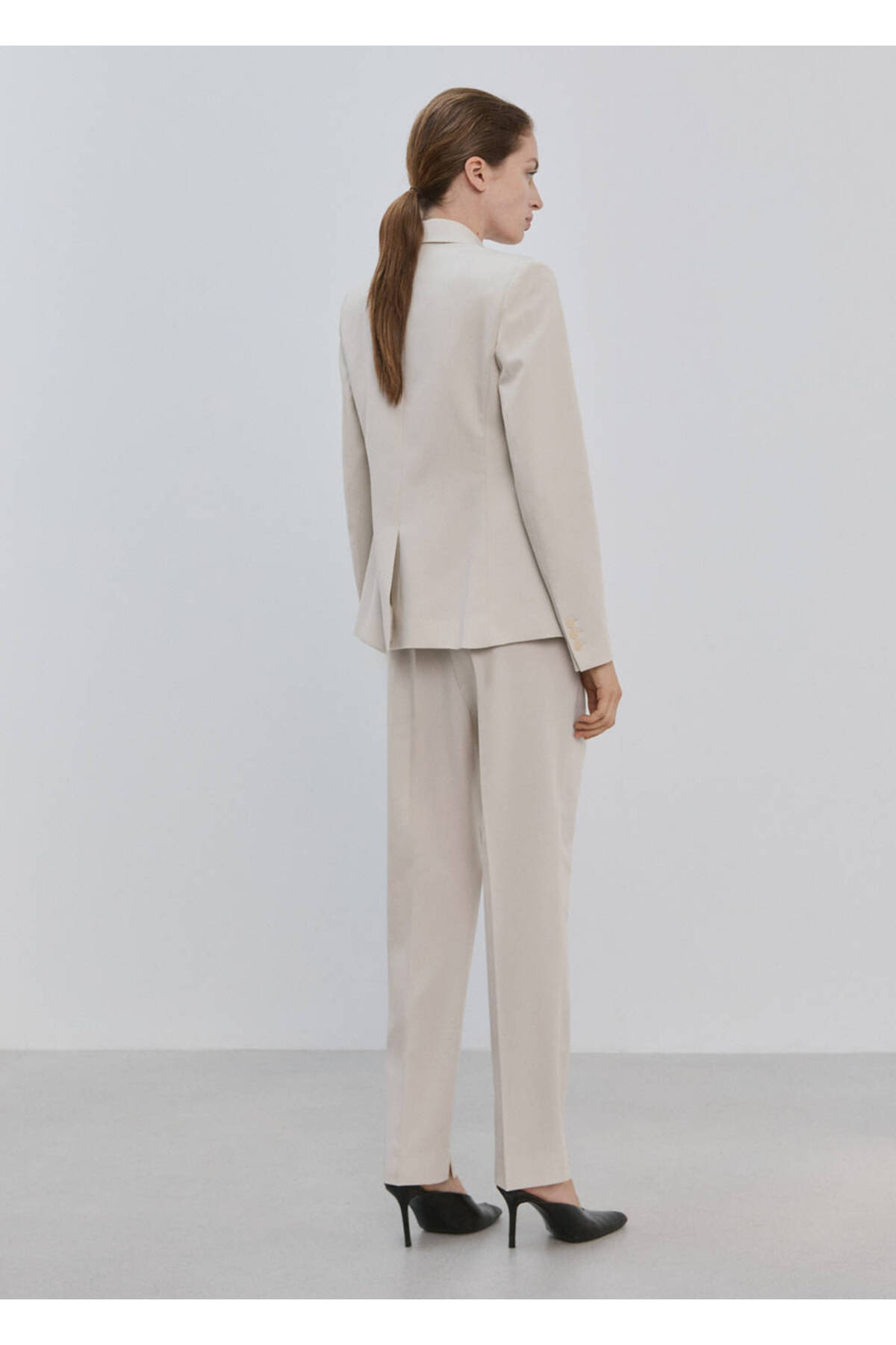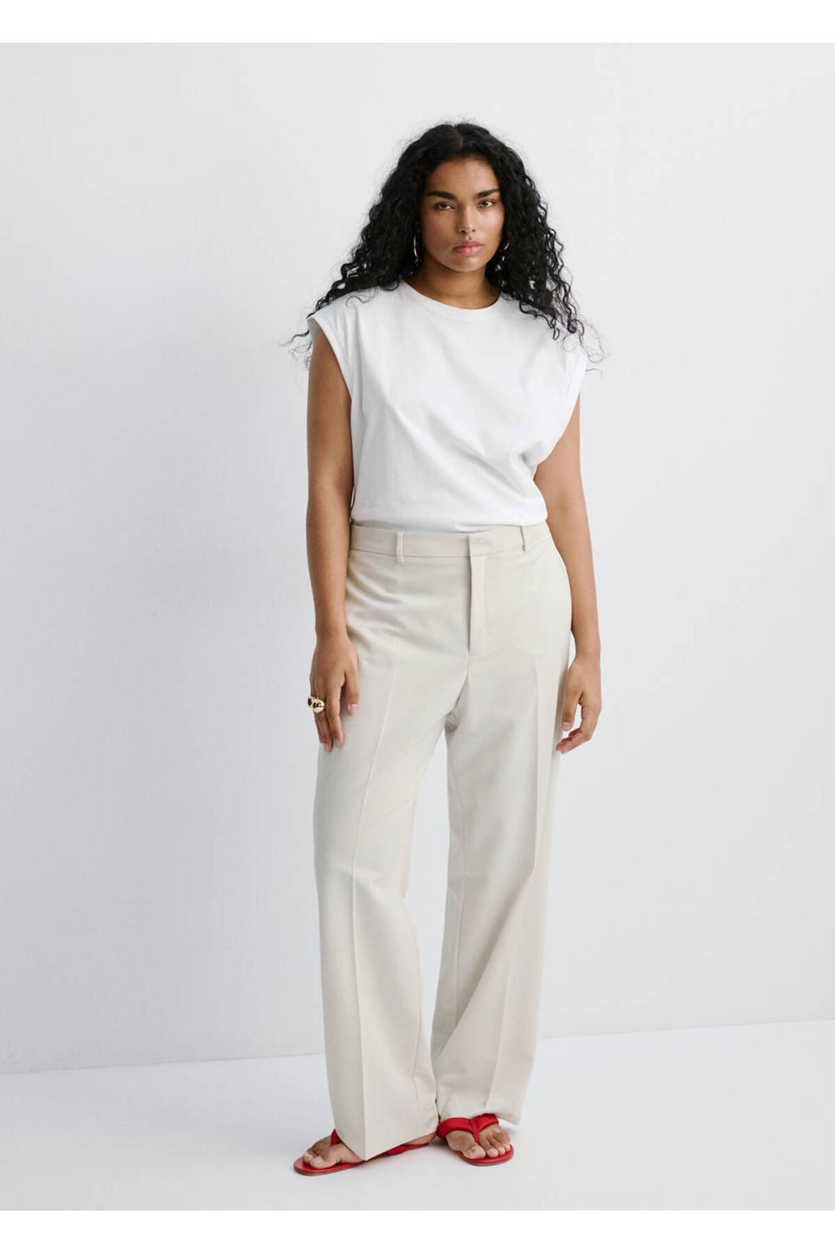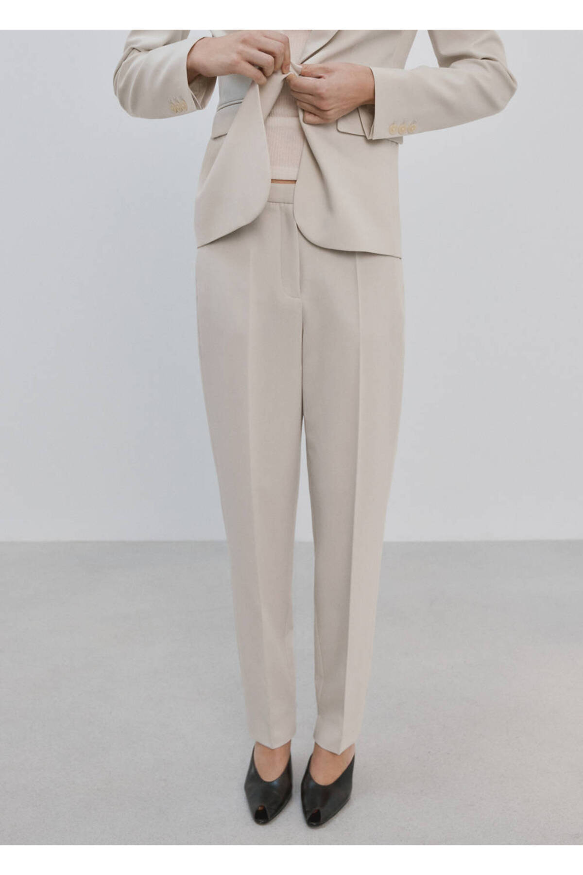Flat Design, Suit style, Middle waist, Belt rings, Two side pockets, Two pockets on the back, Hidden button, with hook and zipper closure, Disponible Plus, Total look.