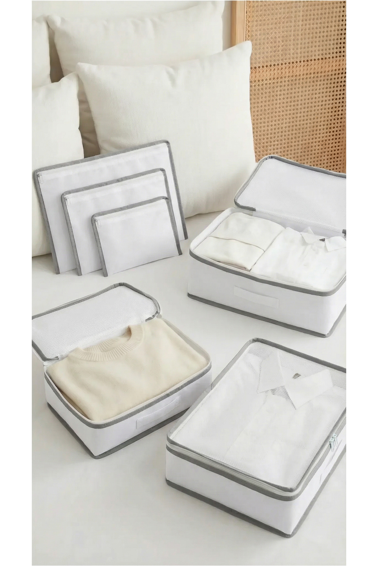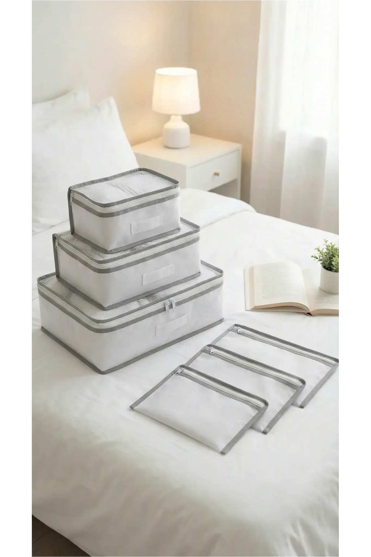 Set Content: 1 Big Size Mesh Organizer: 36x27x13 cm (for shirt, pants, dress) 1 Medium Size Mesh Organizer: 30x20x13 cm (for T-shirt, shorts, skirt) 1 Small Size Mesh Organizer: 24x18x13 cm (for underwear, socks) 1 Big Size Zipper Pouch: 33x23 cm (Dirty laundry bag / shoe bag) 1 Medium Size Zipper Pouch: 25.5x21 cm (Makeup bag / cosmetic organizer) 1 Small Size Zipper Pouch: 18x14.5 cm (for passport, charger, glasses) Where Can you use it? You can use the Evsella suitcase organizer set not only for travel, but also for every corner of your home: Organizer inside the suitcase Hops inside the closet Under the bed storage Organizer inside the bag Organizer inside the bag Organizing the gym bag and backpack Hospital bag and maternity bag preparation Baby care bag Dormitory and student house layout Travel makeup bag Household - Regular Life, Happy Travel Other products you may be interested in: Luggage organizer, luggage organizer, suitcase organizer, luggage organizer, travel loop, travel organizer, set of 6, organizer with net, organizer with zipper, organizer inside the closet, drawer organizer, wardrobe organizer, underwear organizer, socks organizer, shoe pouch, laundry bag, makeupil bag, cosmetic organizer, baby goods organizer, hospital bag, maternity bag, under the bed base storage, hurts,
