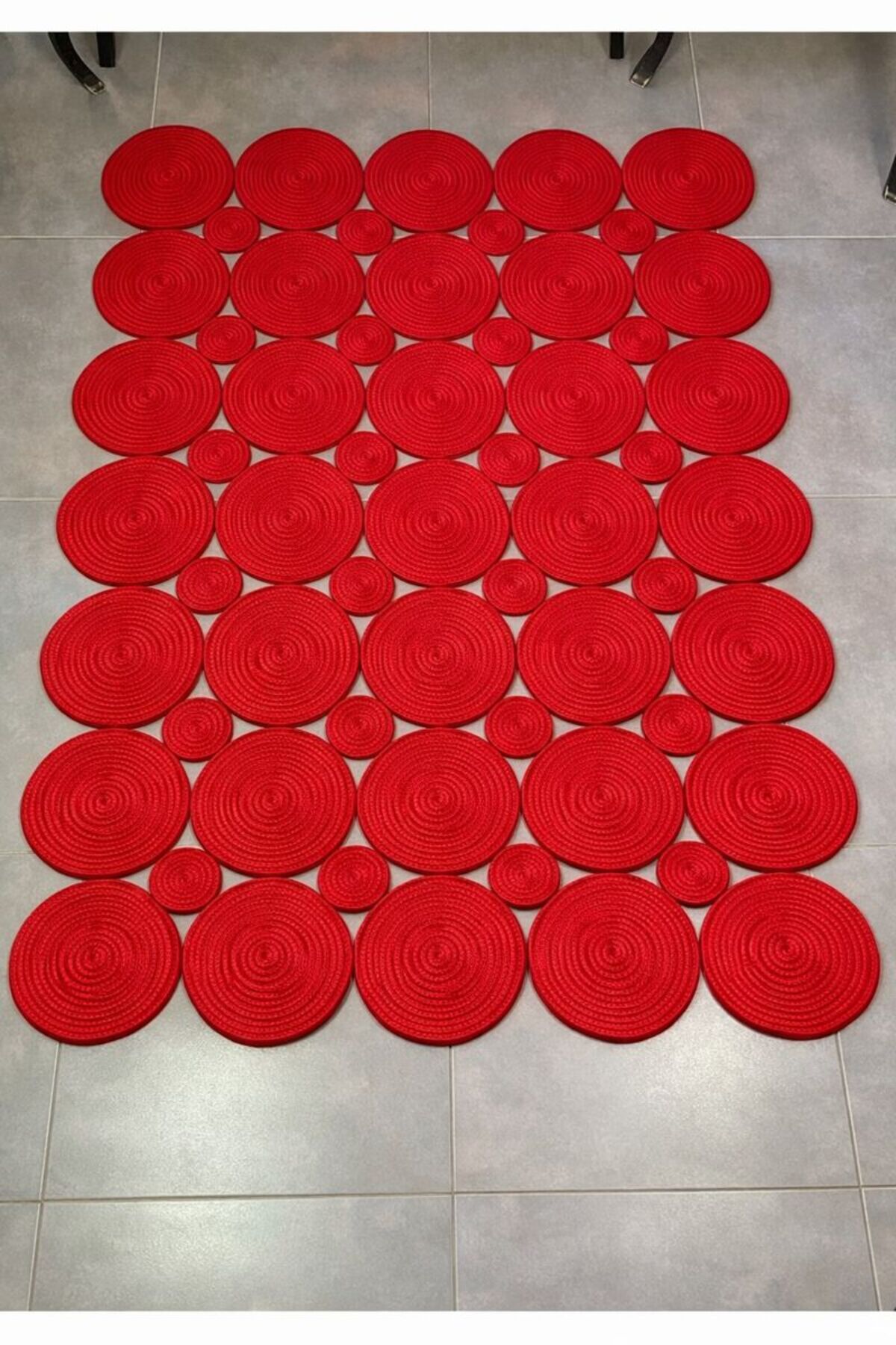 It is a knitted rug with a natural knit base.