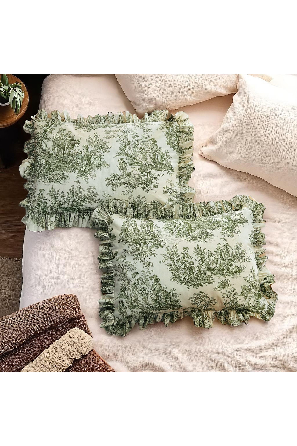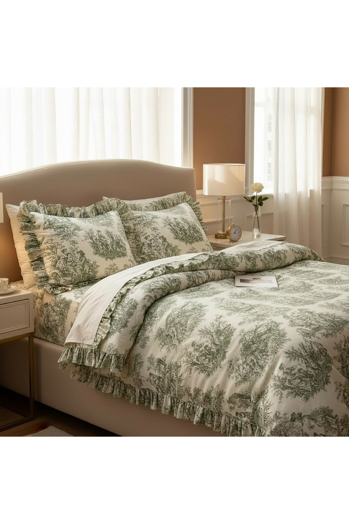 MundoLindo Double Ruffle Duvet Cover Set French Toile De jouy Pattern 4 Pieces | ByTR