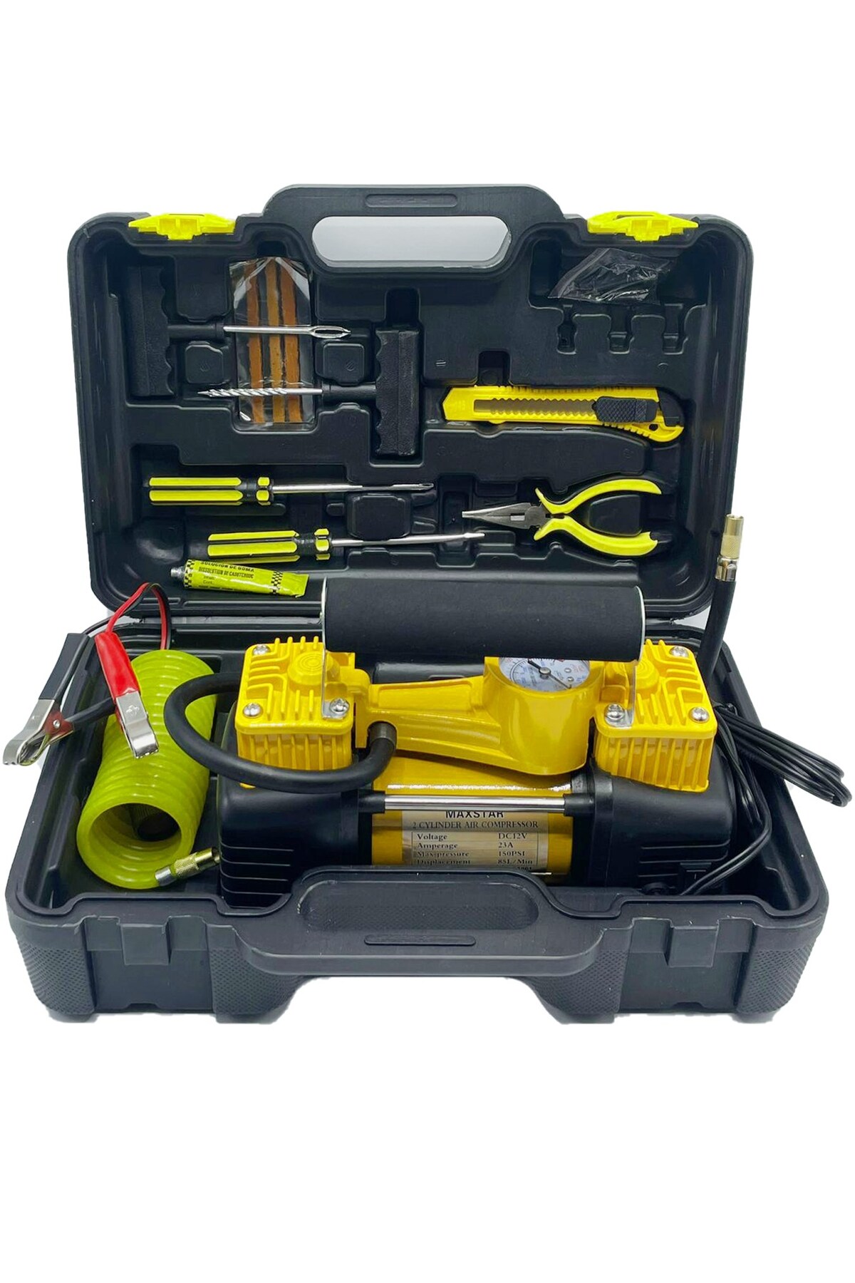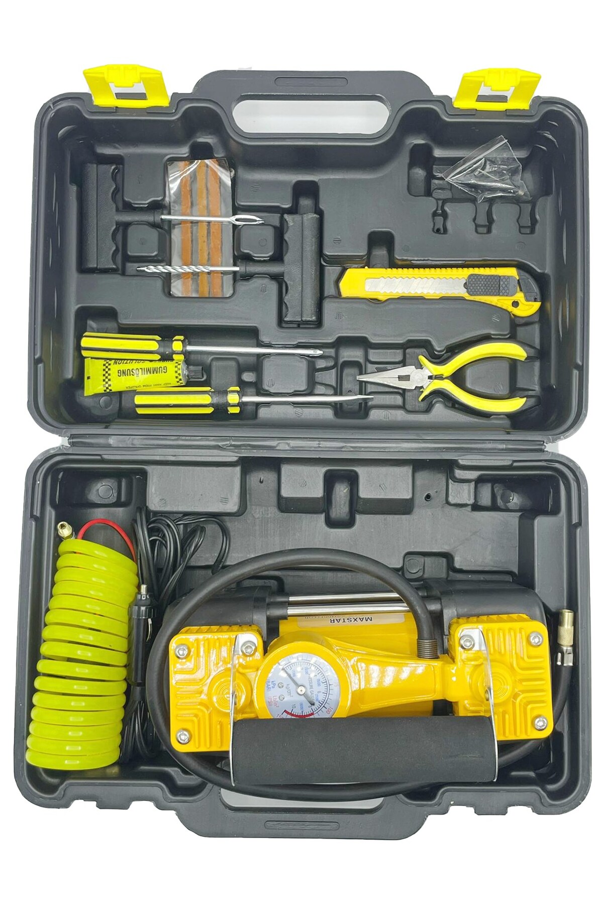 You can use it with both the battery and the cigarette lighter entrance. It is sent with a carrying case. There is a tire repair kit in our set.