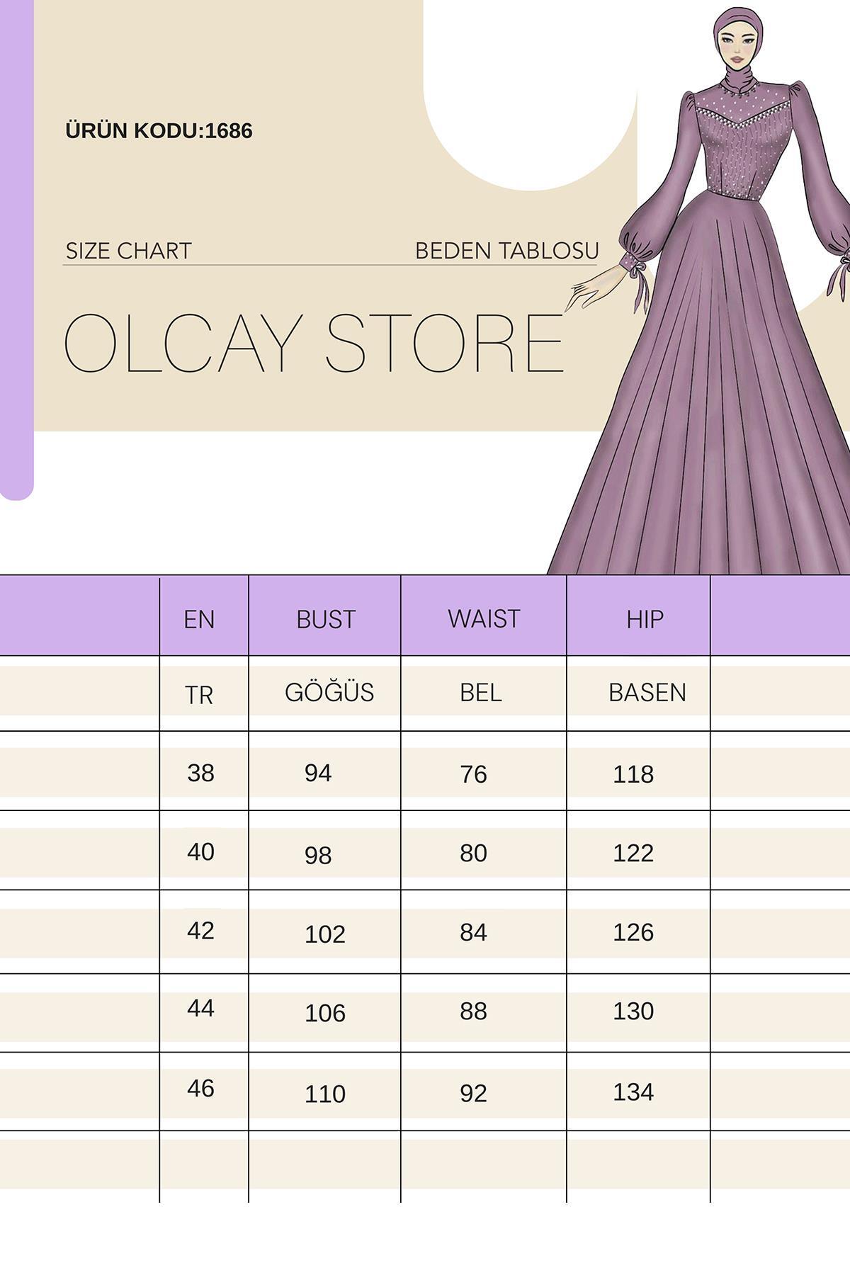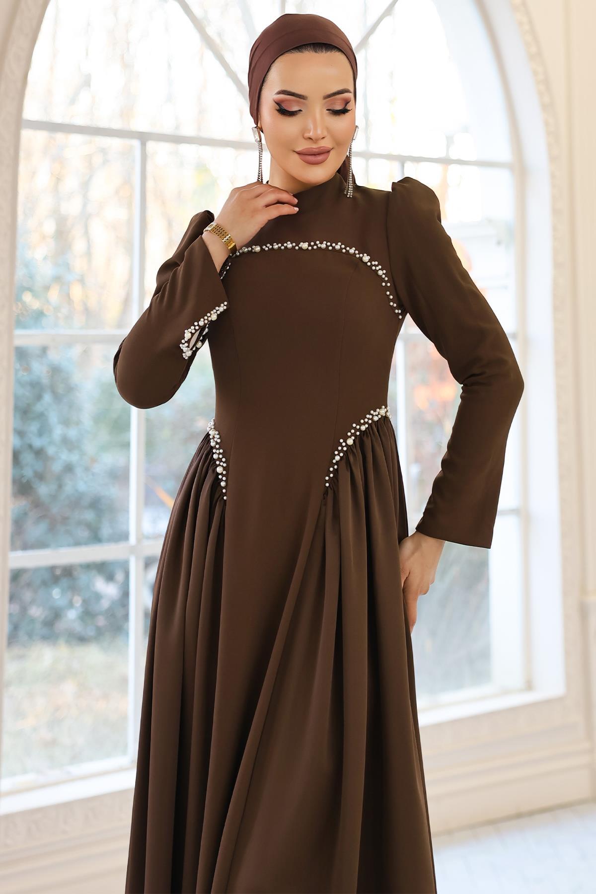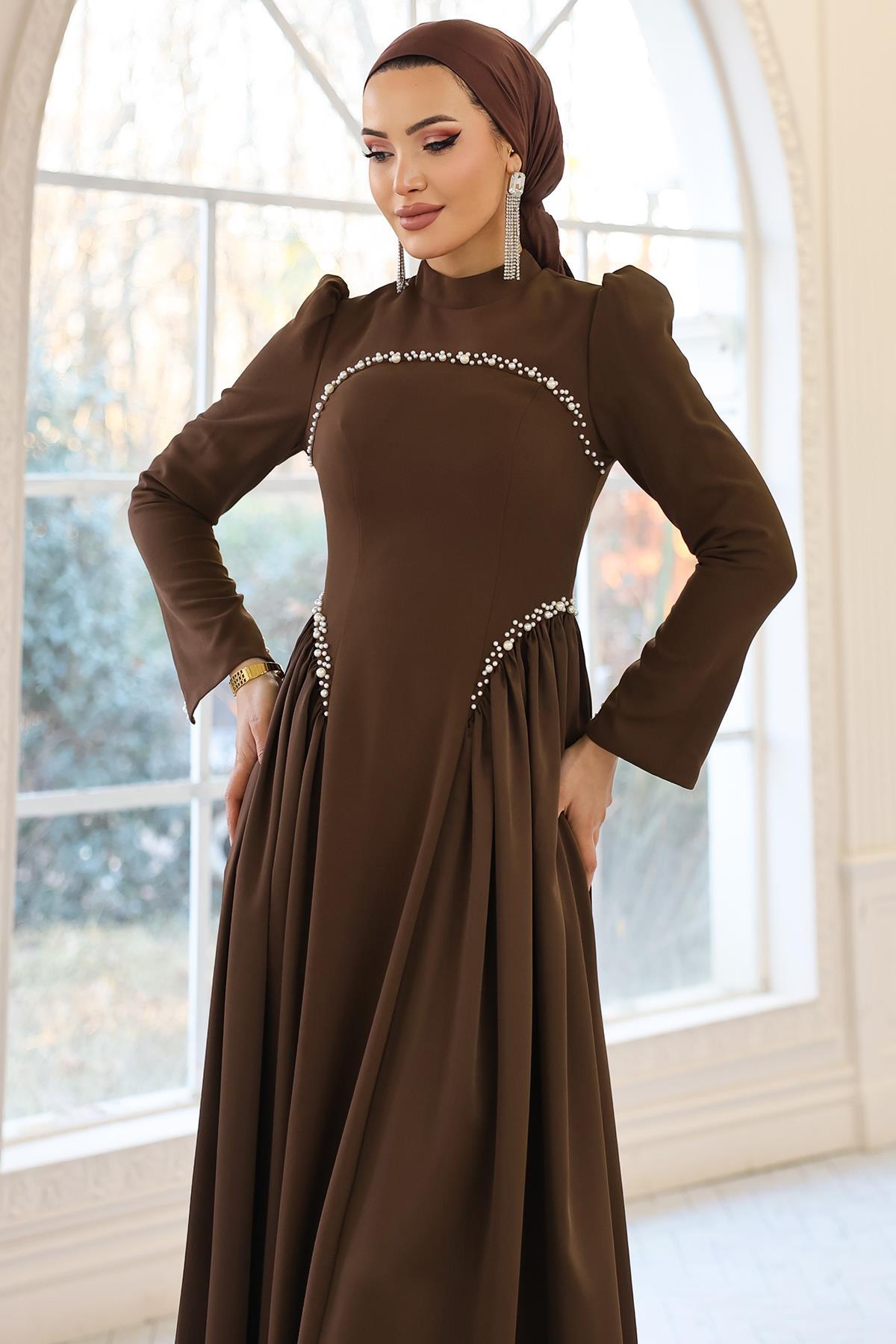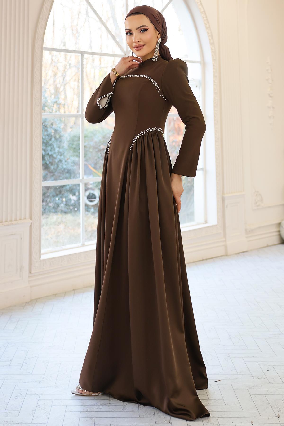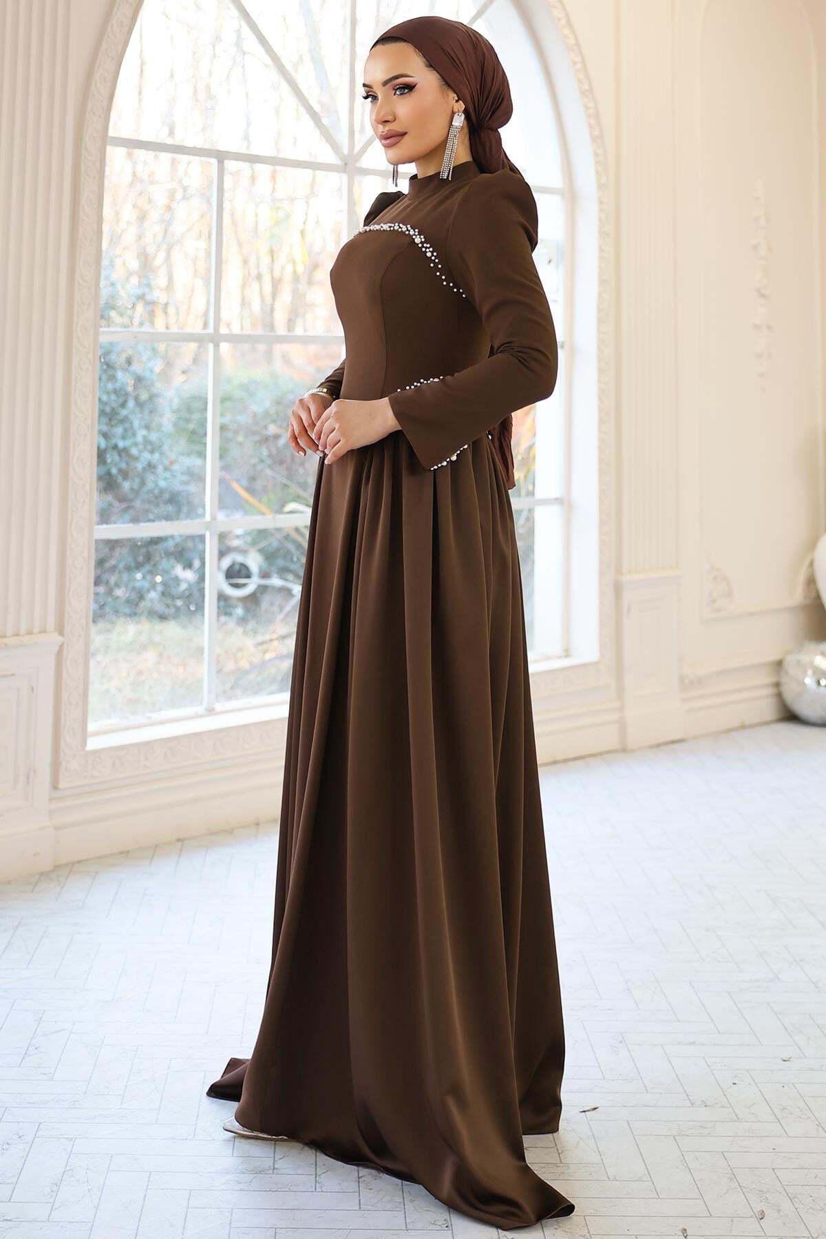 Olcay Pearl Detailed Crepe and Satin Combination Flare Modest COFFEE 1686 | ByTR