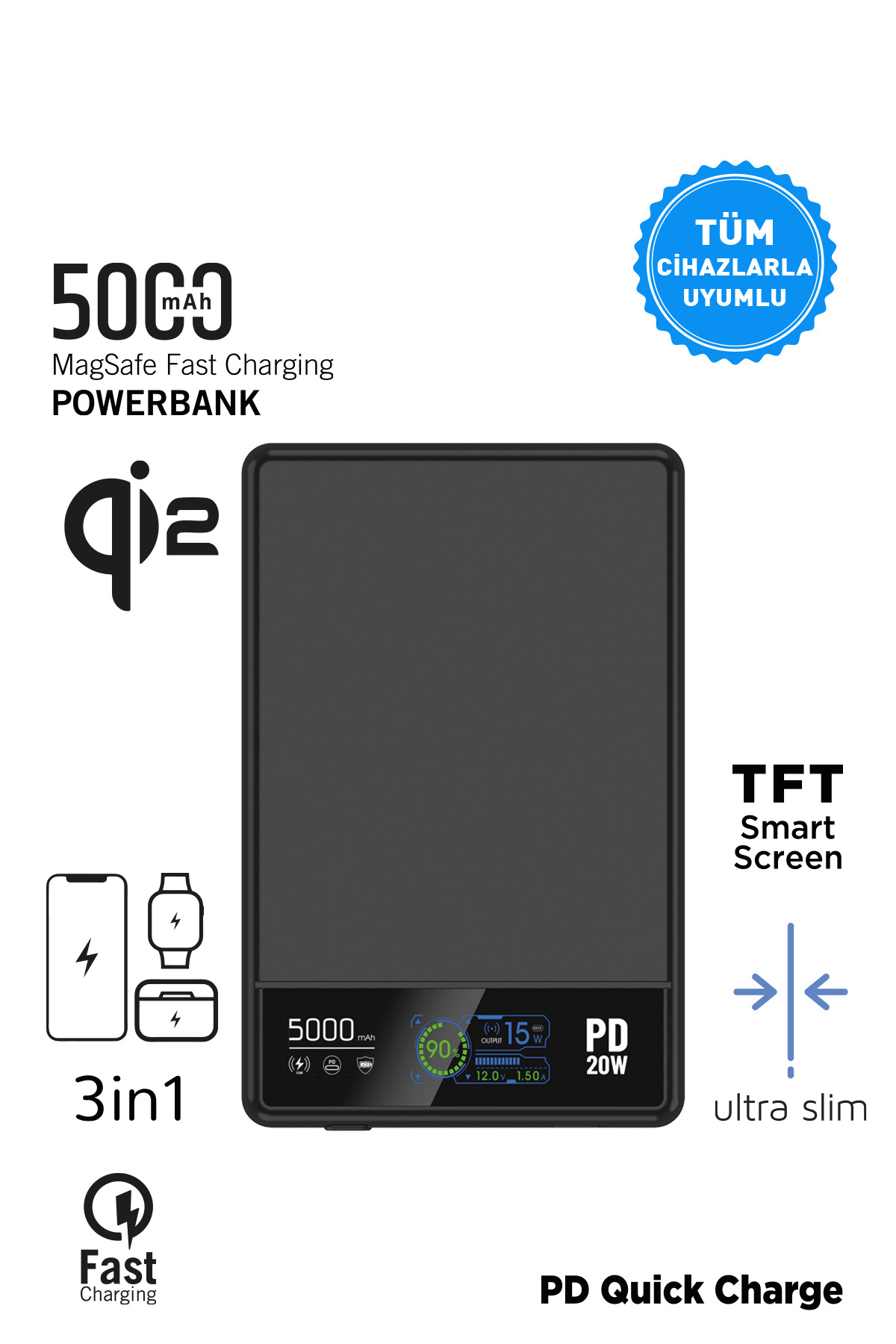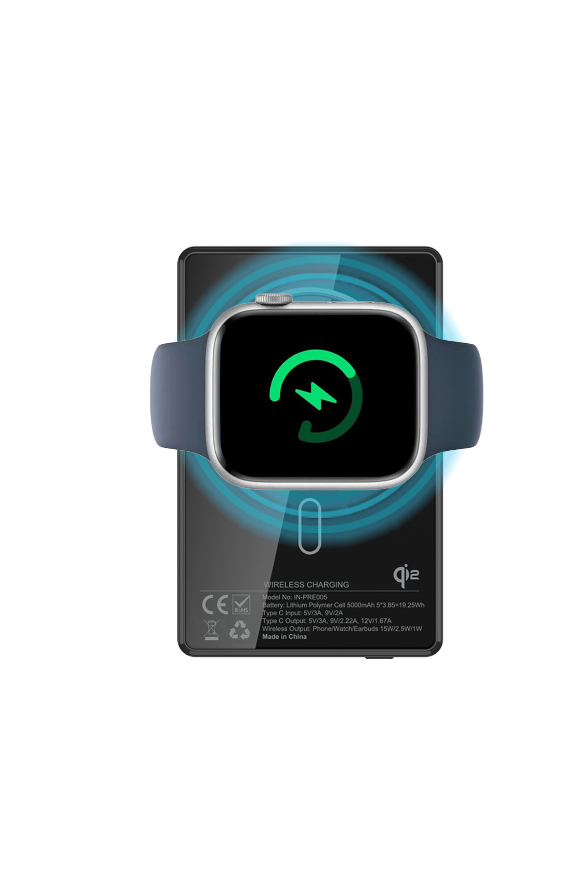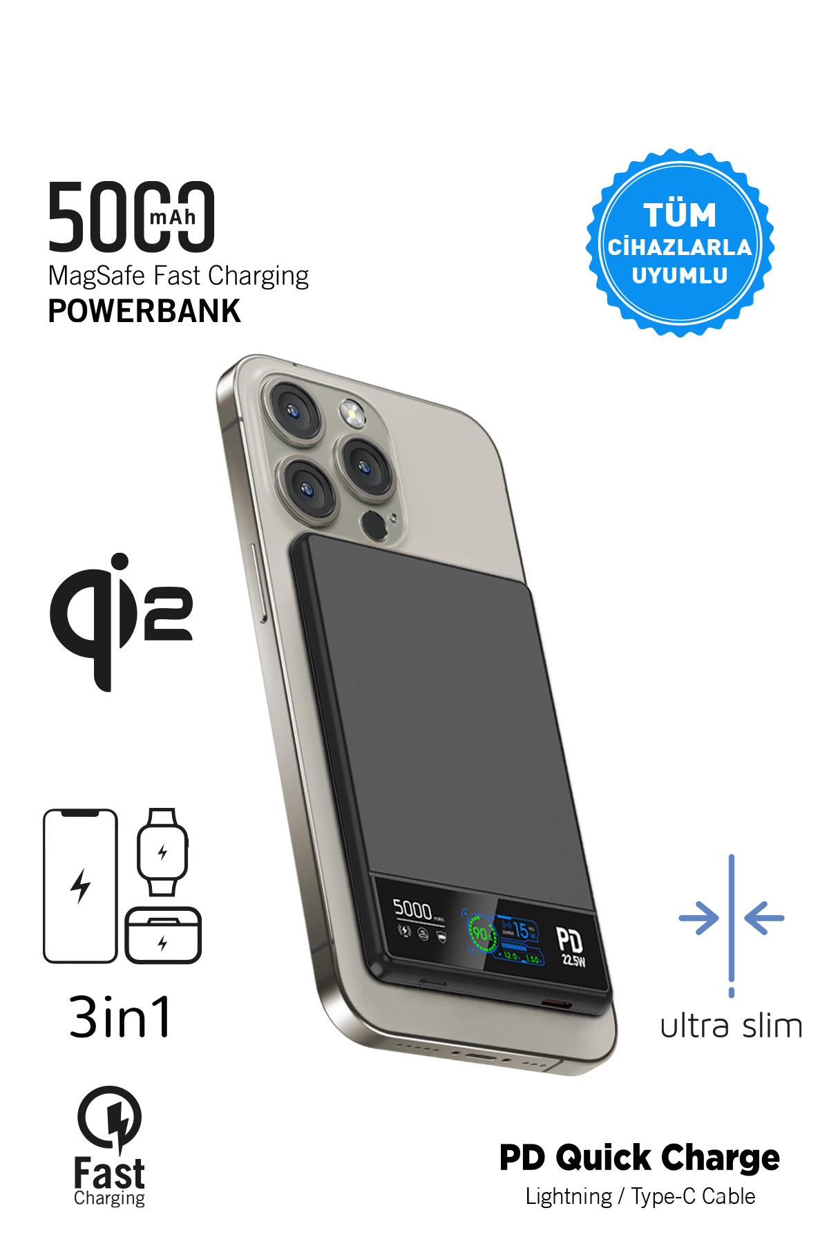 Portable battery with 5000mAh capacity in ultra slim design, equipped with Magsafe QI2 and PD Quick technologies.