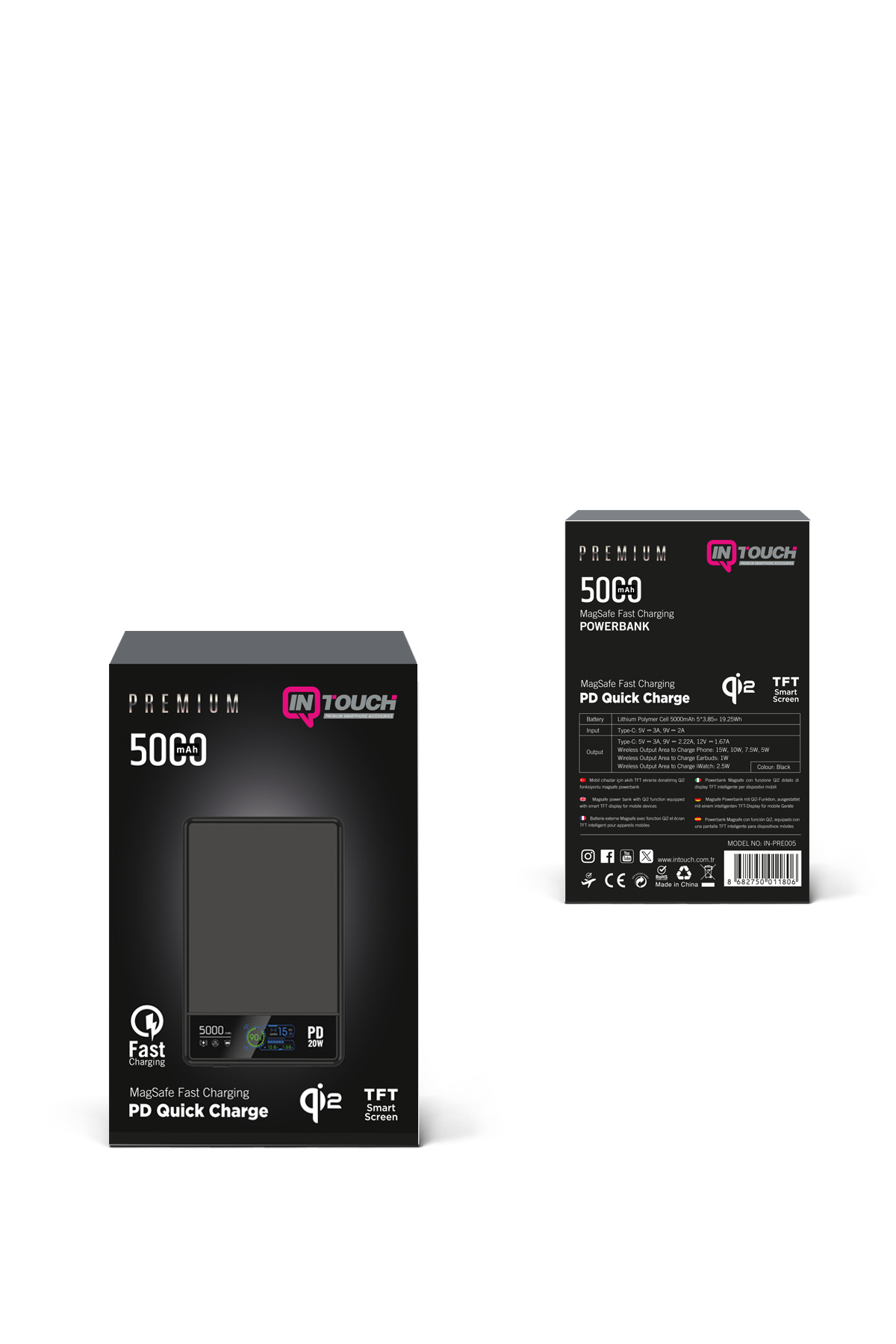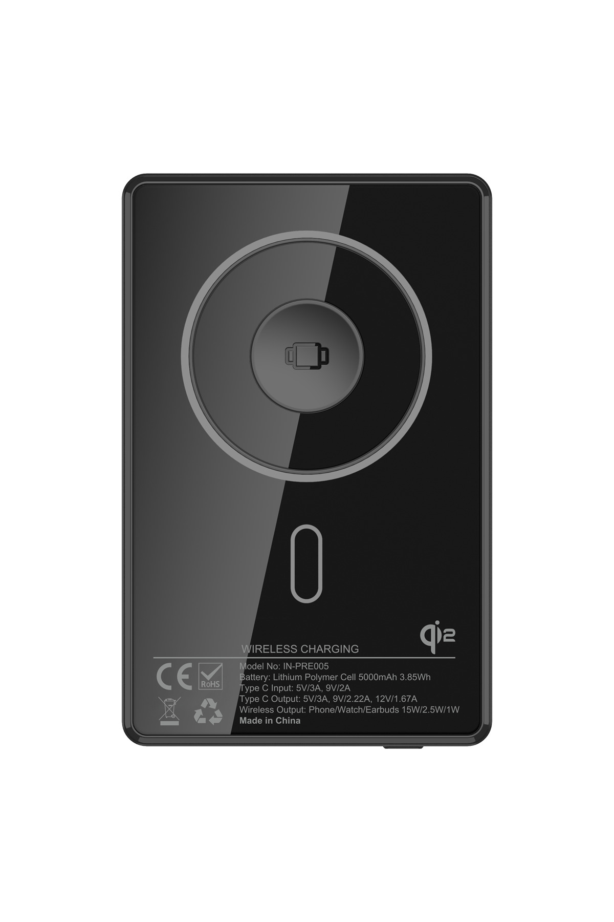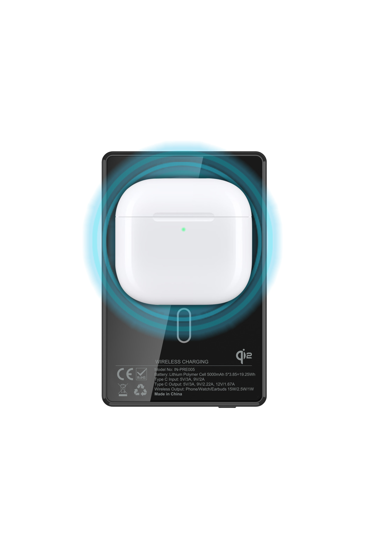 Portable battery with 5000mAh capacity in ultra slim design, equipped with Magsafe QI2 and PD Quick technologies.