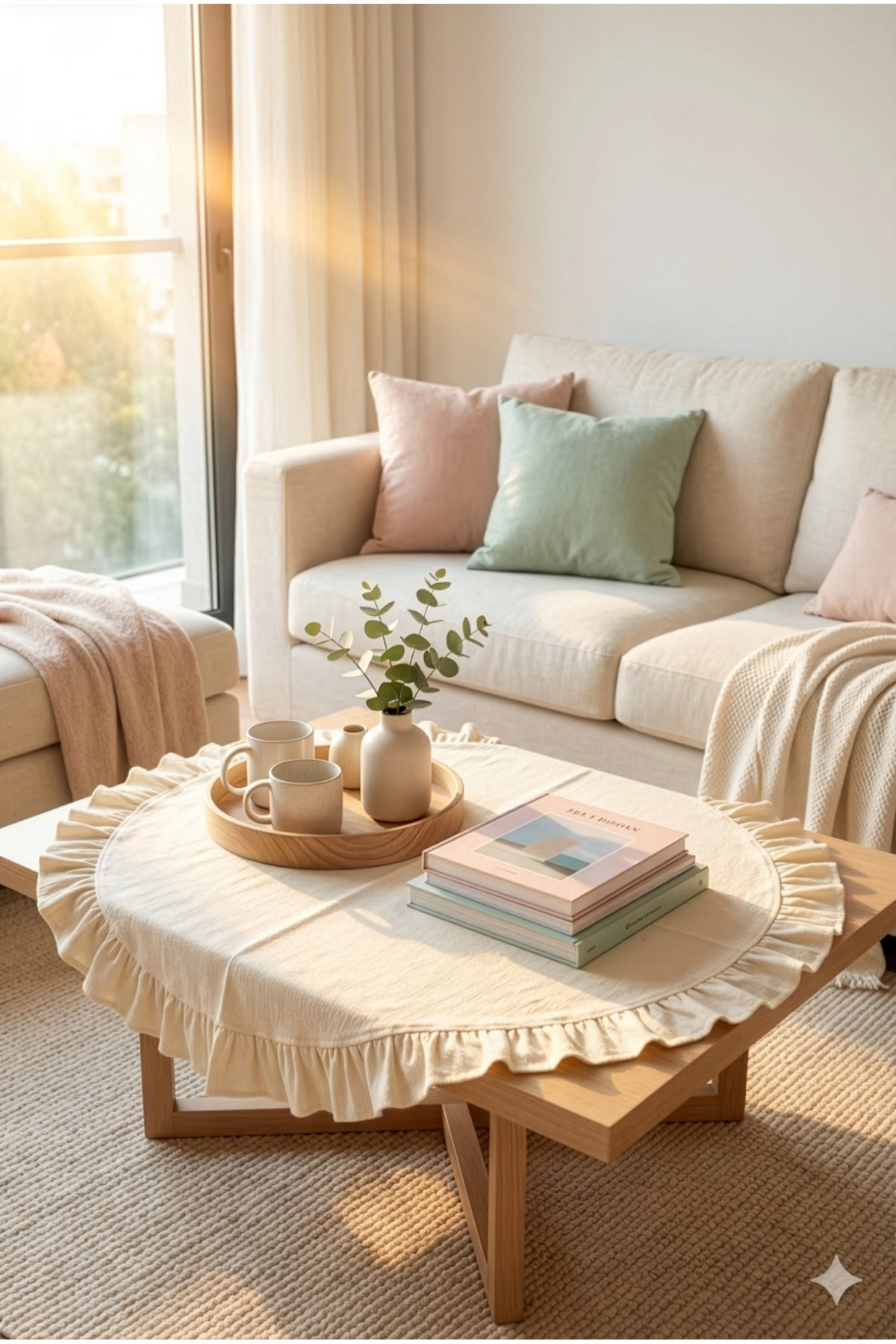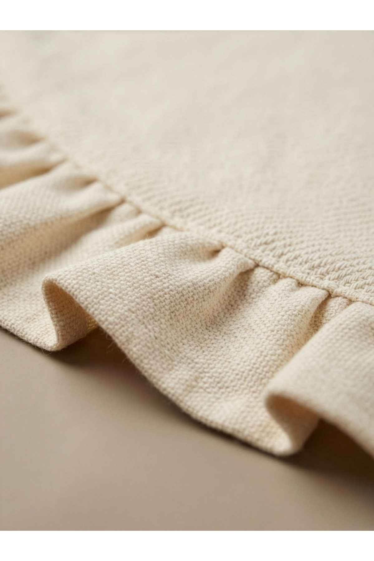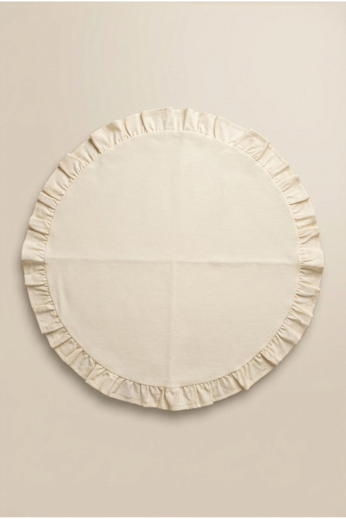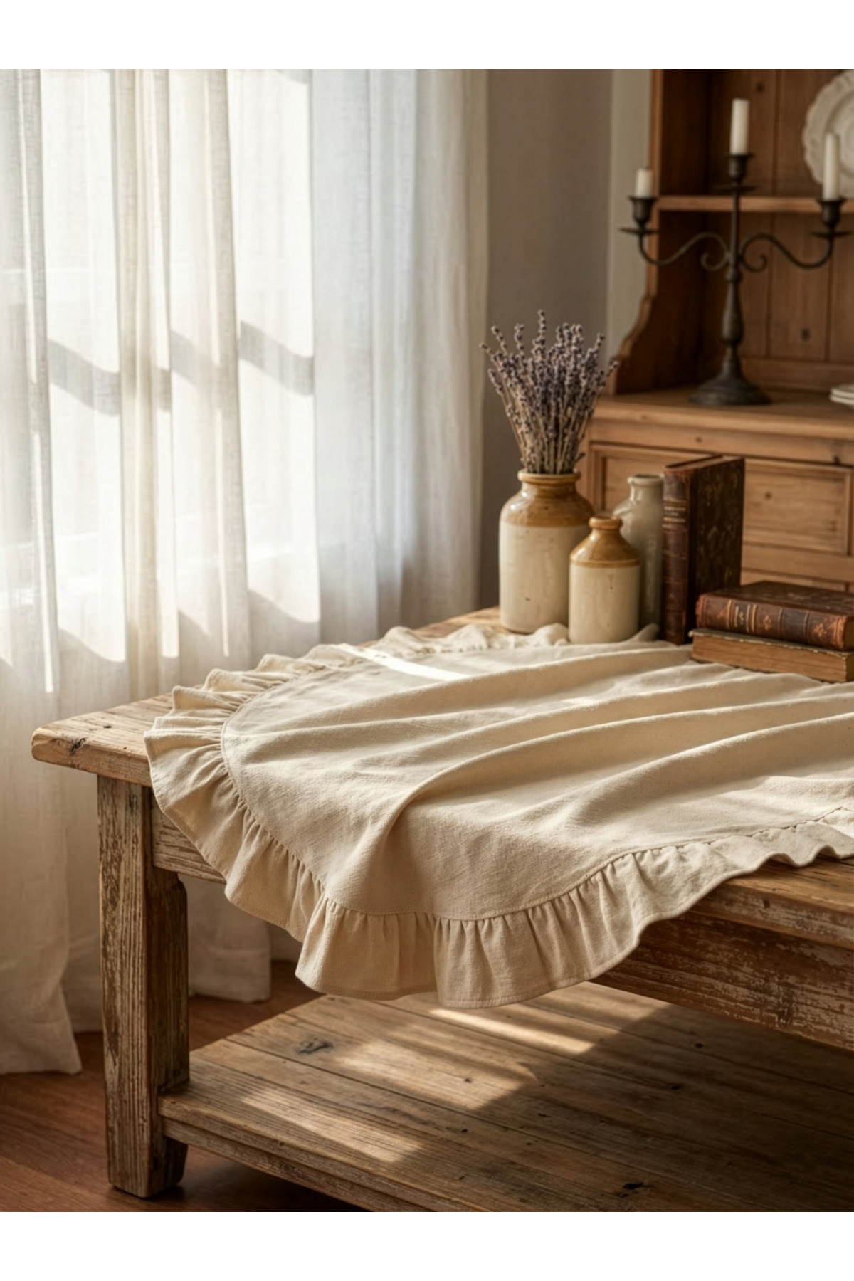 It is a tablecloth with a ruffled edge detail designed to protect the table surface and give the decoration a soft, natural look.