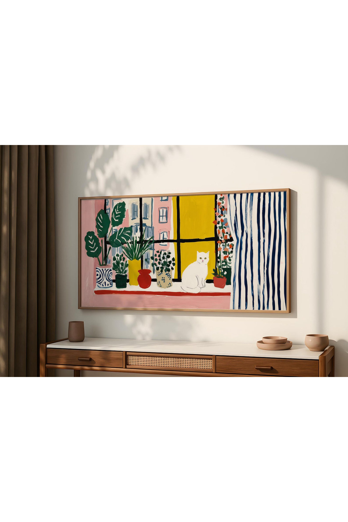 One Piece Real Wooden Horizontal Panorama Framed Painting with cat and home