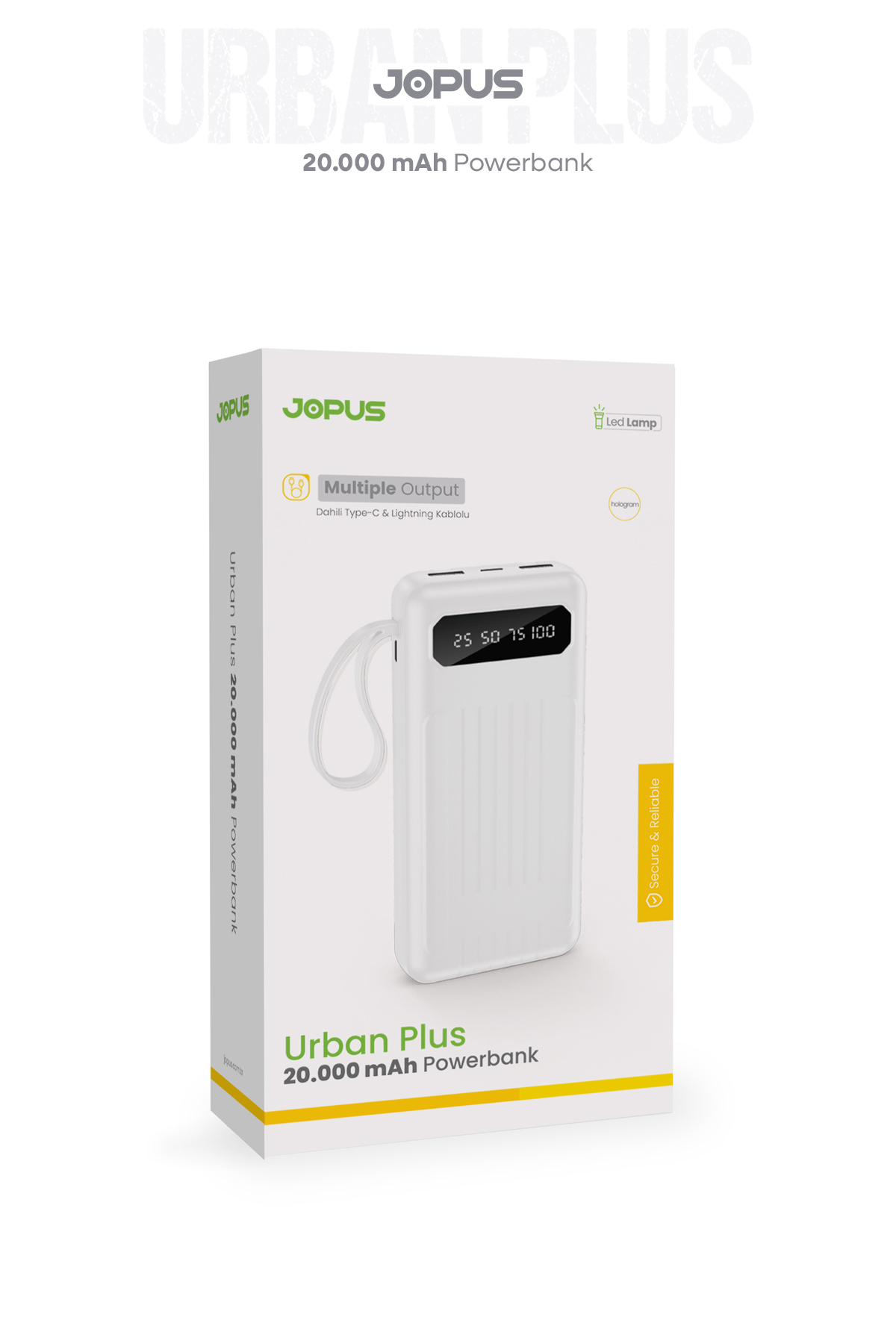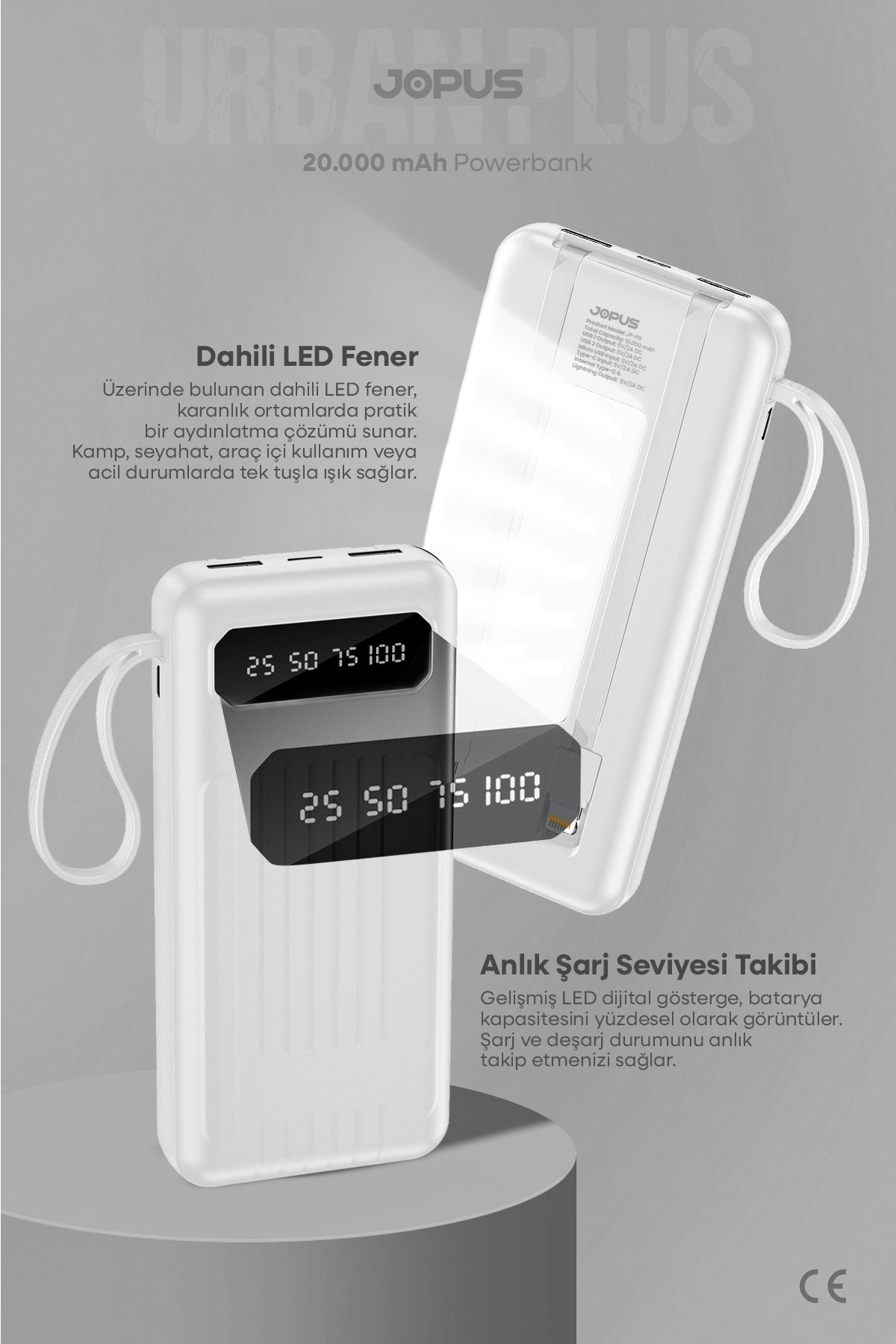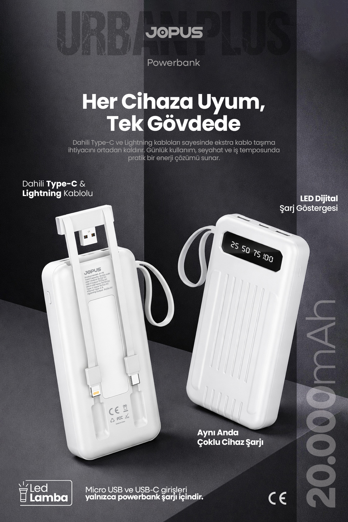 Jopus 20.000 mAh Powerbank – With built-in Type-C and Lightning Cable, LED Lamp, Lcd Display - Jopus 20.000 mAh powerbank offers maximum practicality in daily use with its high capacity and versatile design.