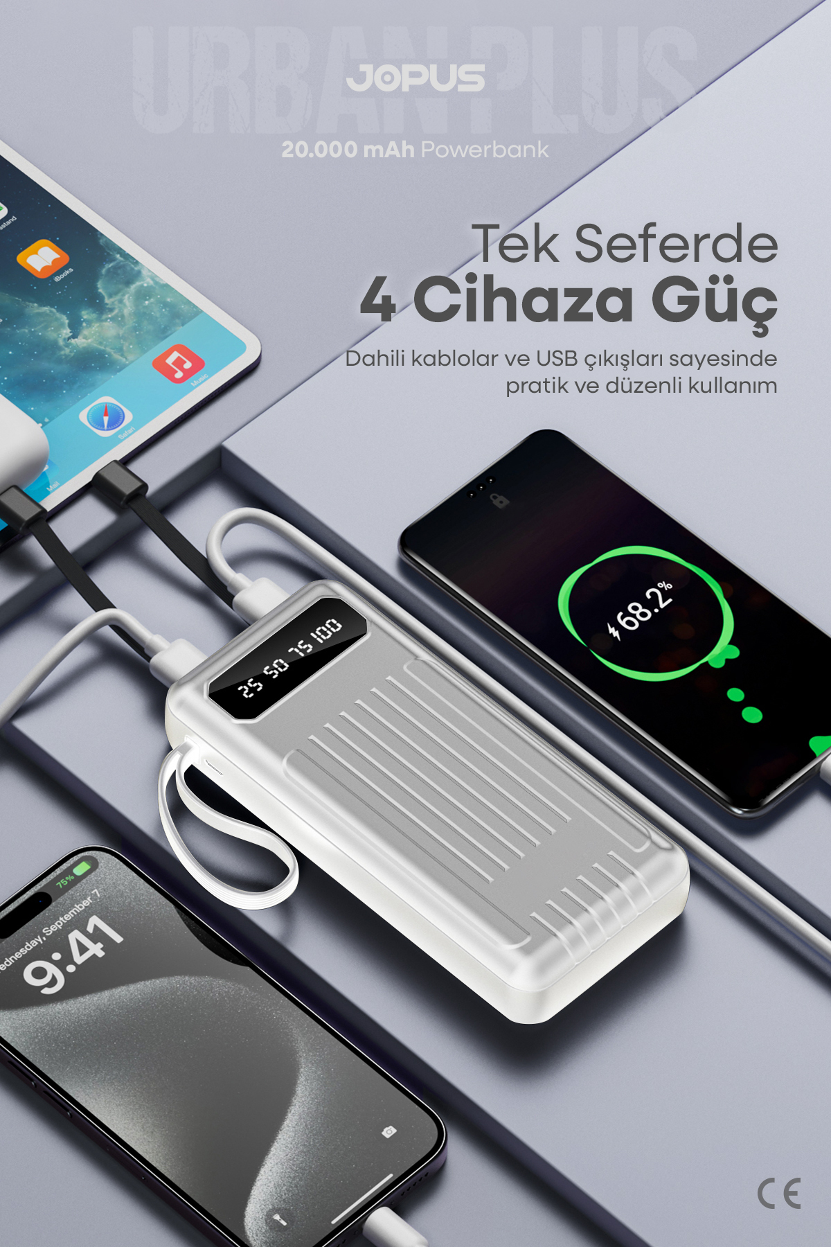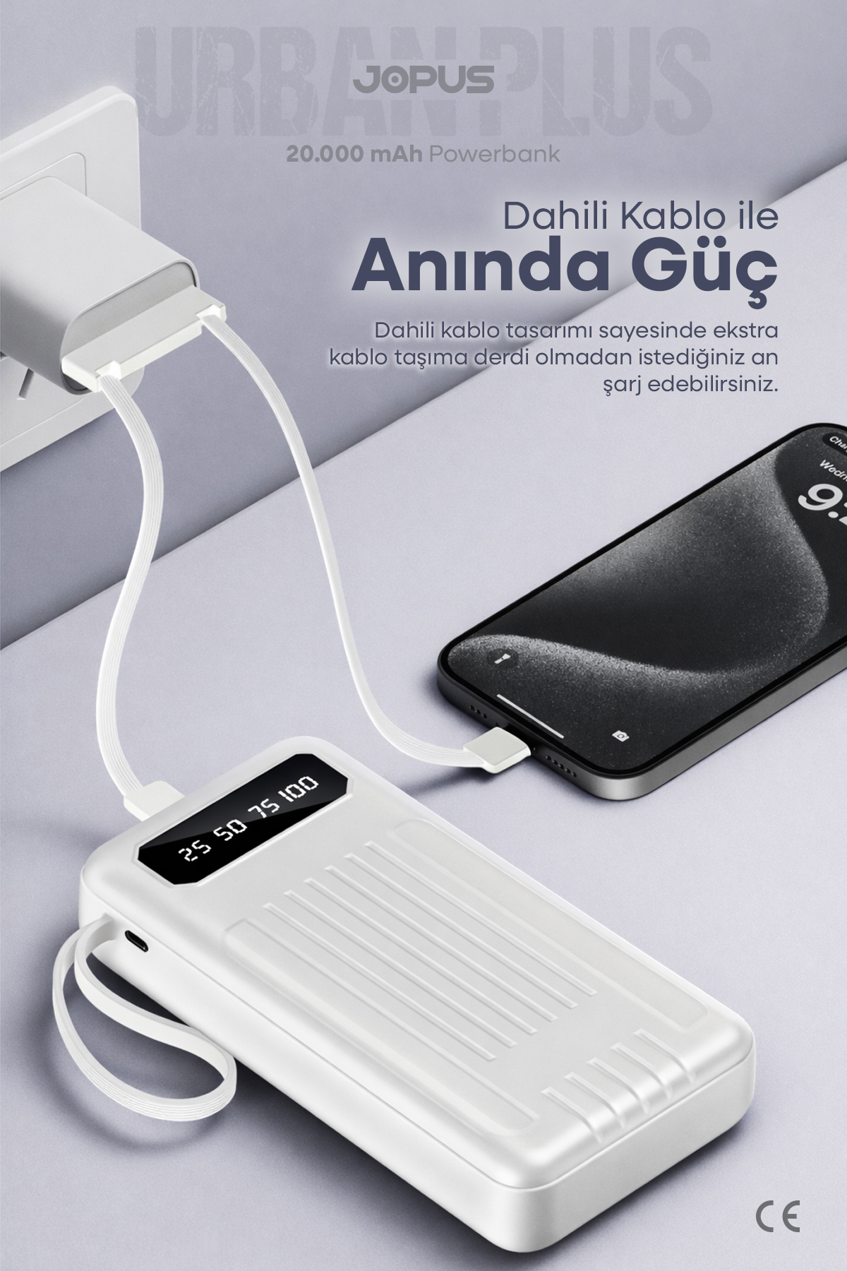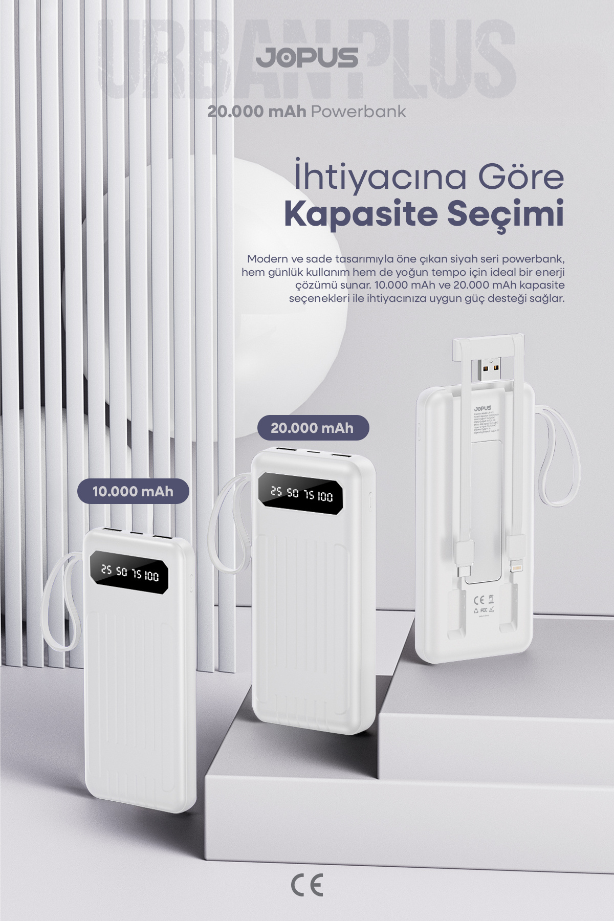 Jopus 20.000 mAh Powerbank – With built-in Type-C and Lightning Cable, LED Lamp, Lcd Display - Jopus 20.000 mAh powerbank offers maximum practicality in daily use with its high capacity and versatile design.
