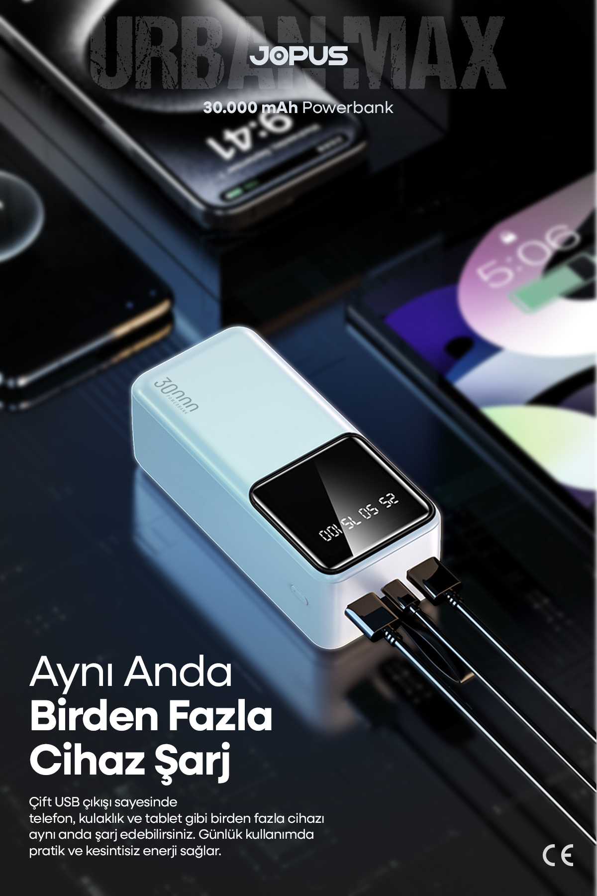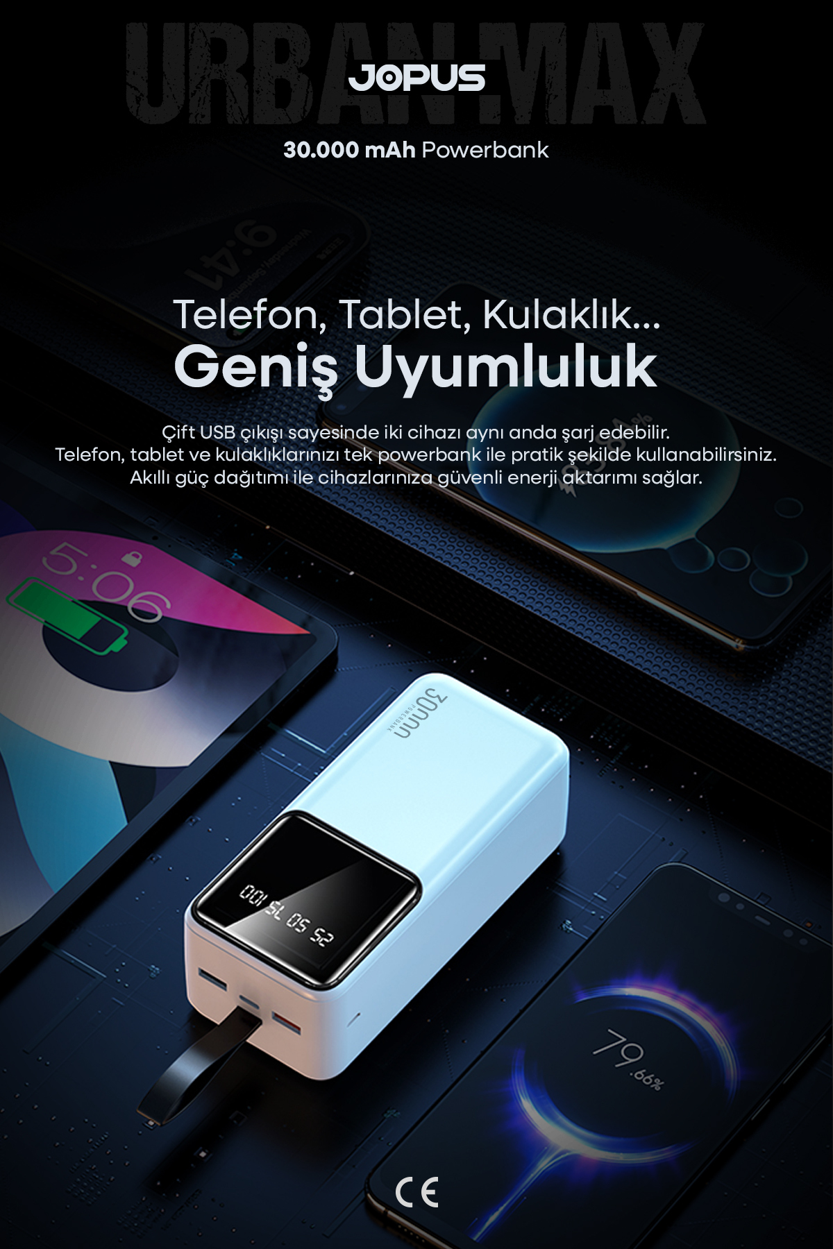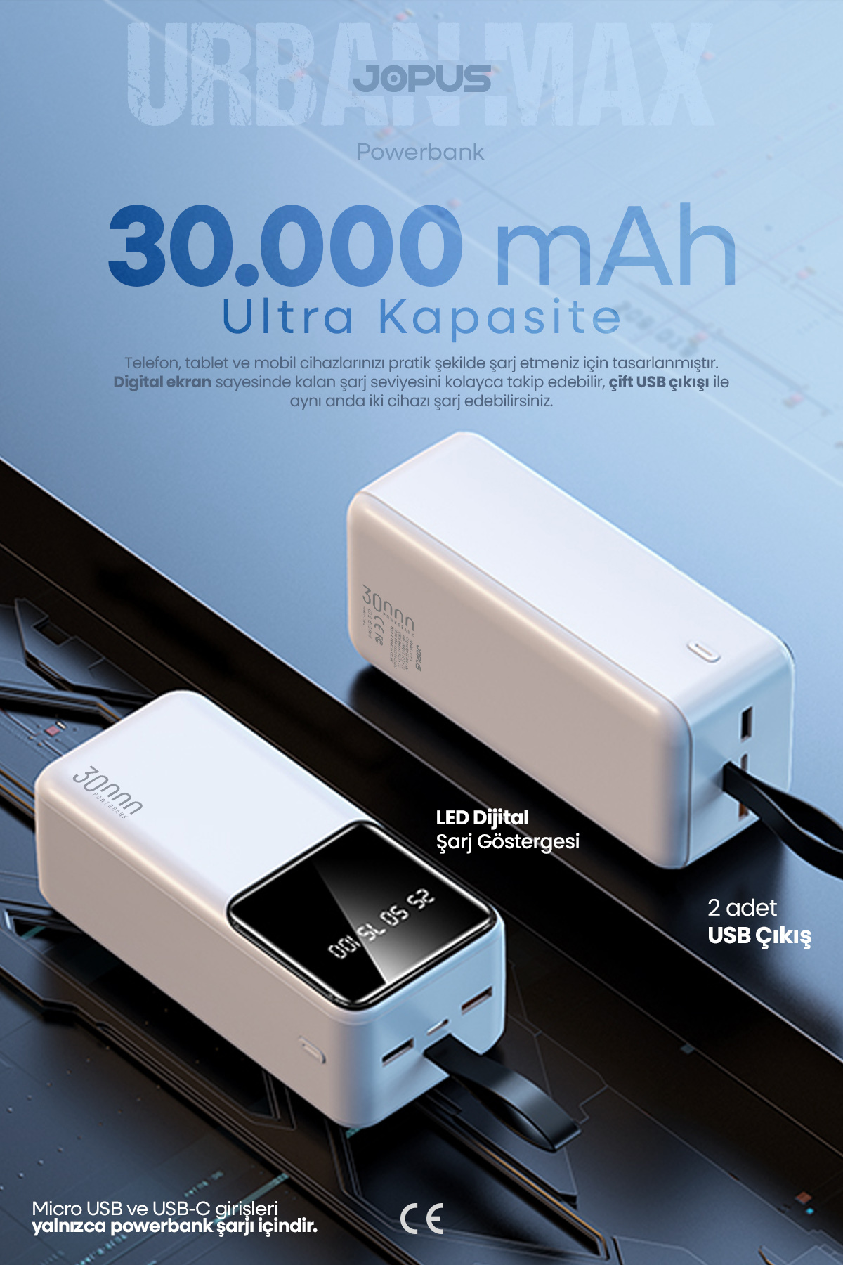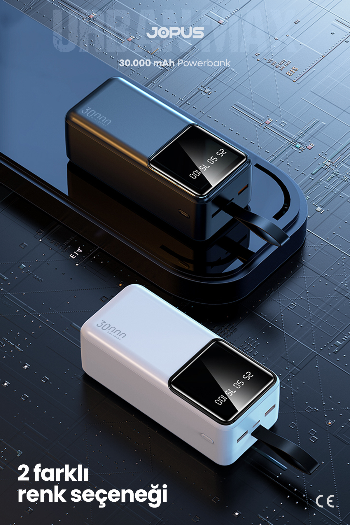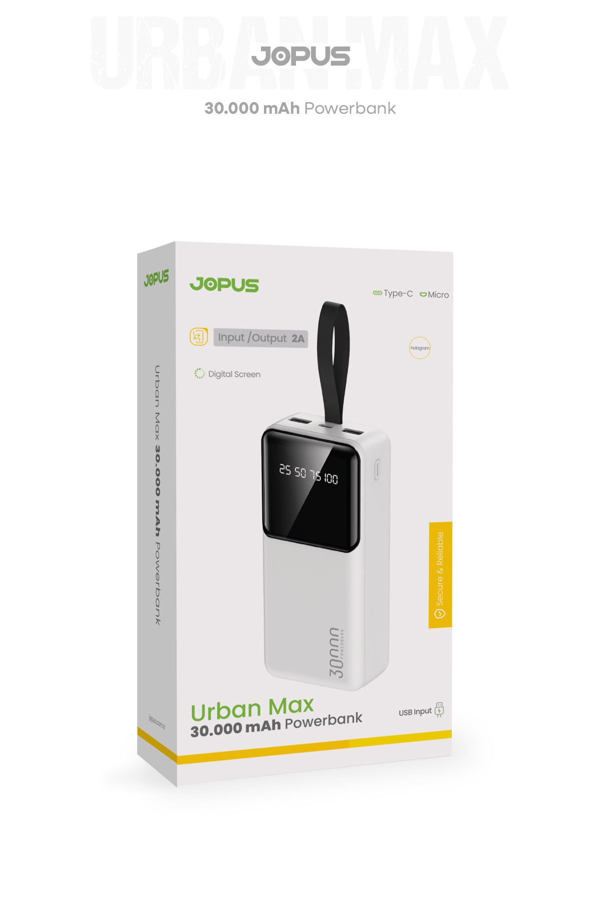 Jopus Powerful Portable Charger with 30000mAh Powerbank LCD Display Carrying Strap White JP-P12 | ByTR