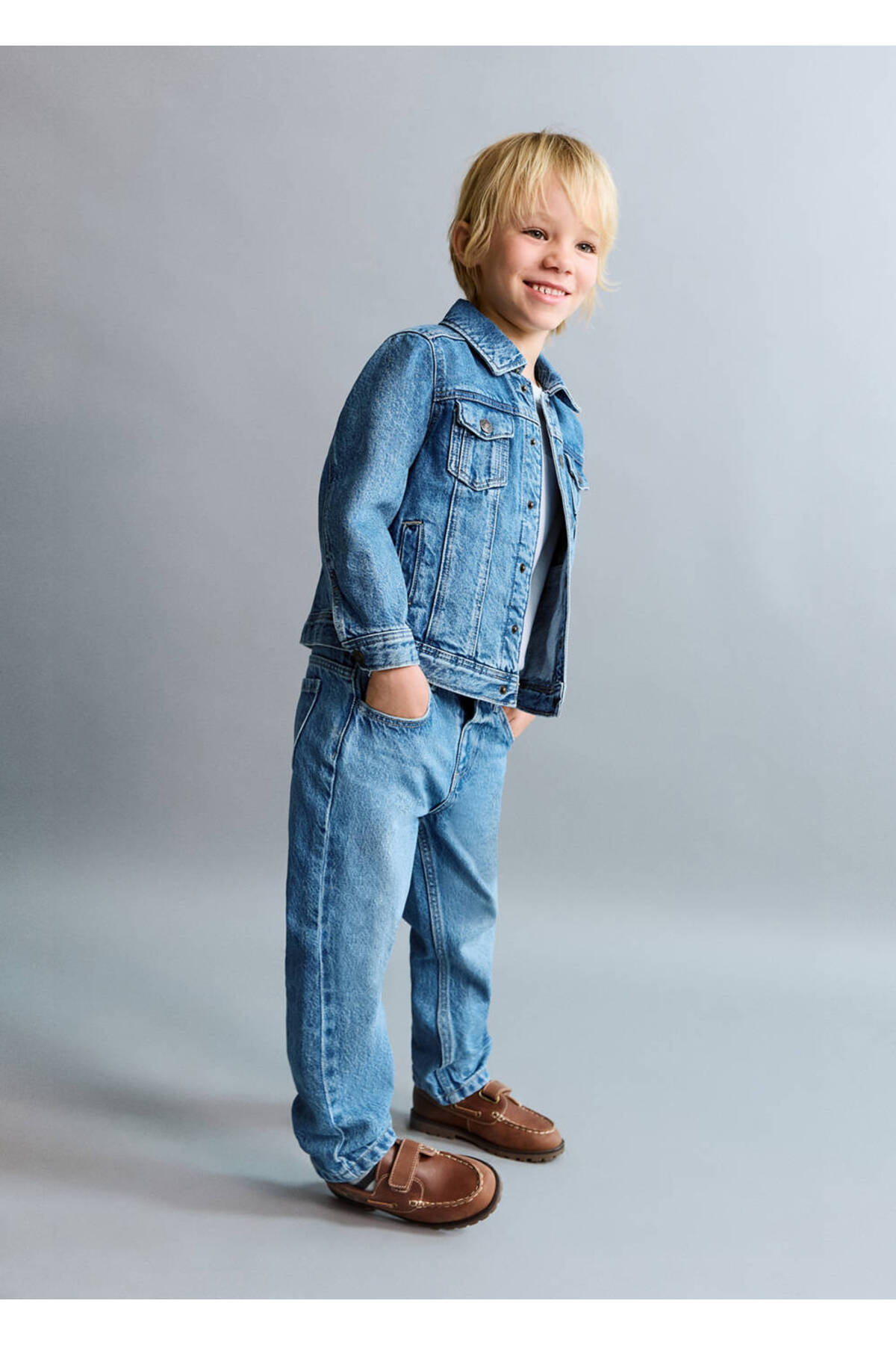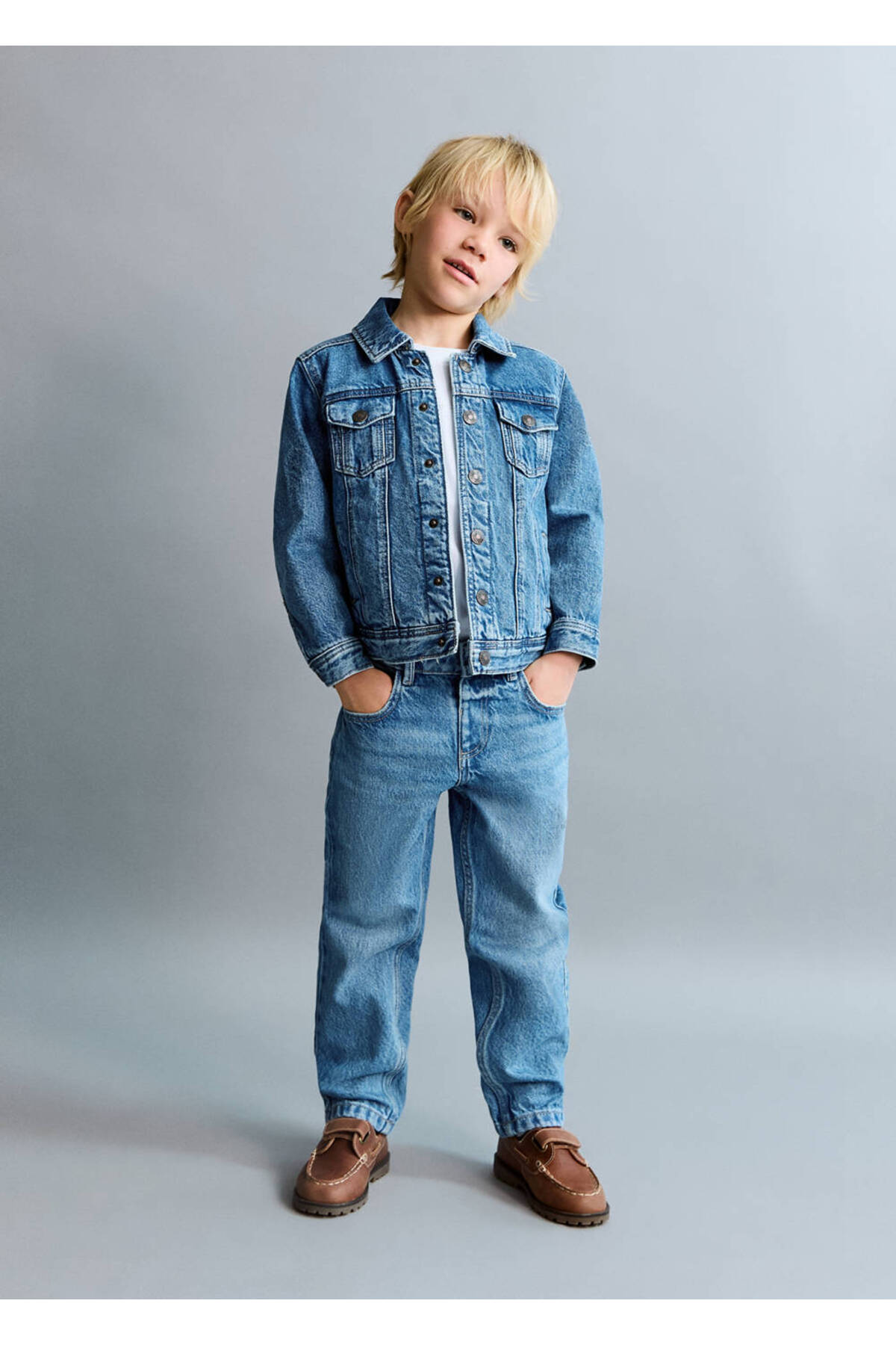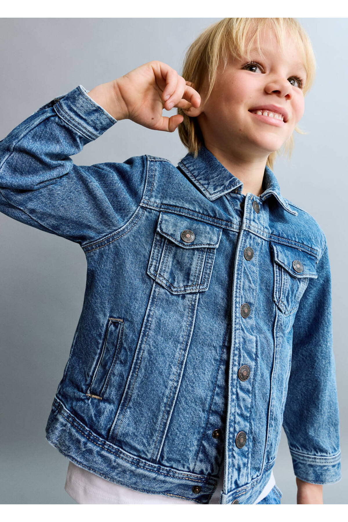 100% cotton fabric, Jean style cotton fabric, Plain Design, Shirt collar, Long sleeve with buttoned cuffs, Chest pocket with two buttons, Two side pockets, Front button closure.