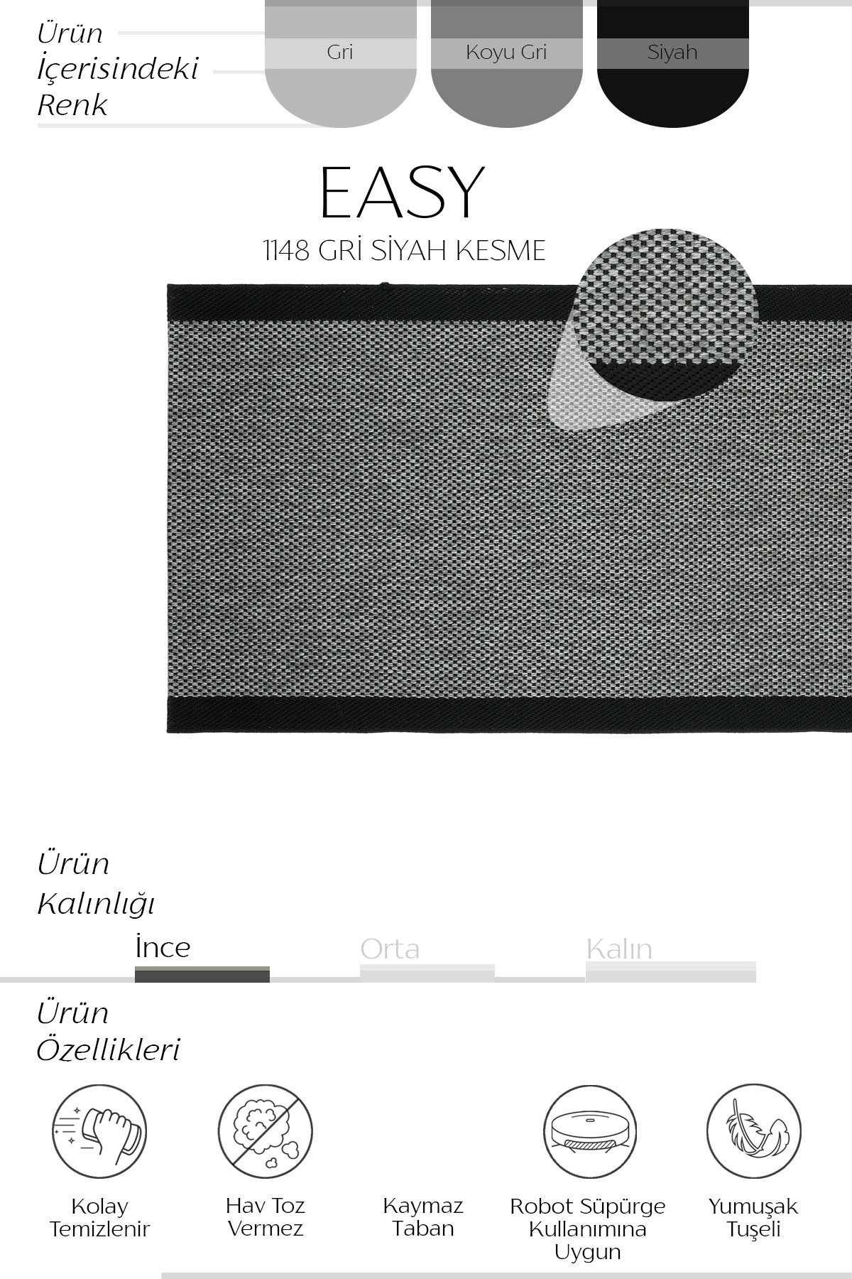 Easy 1148 Grey Black cutting carpet offers a modern and strong stance with its thin woven structure specially designed for corridors, entrances and transition areas.