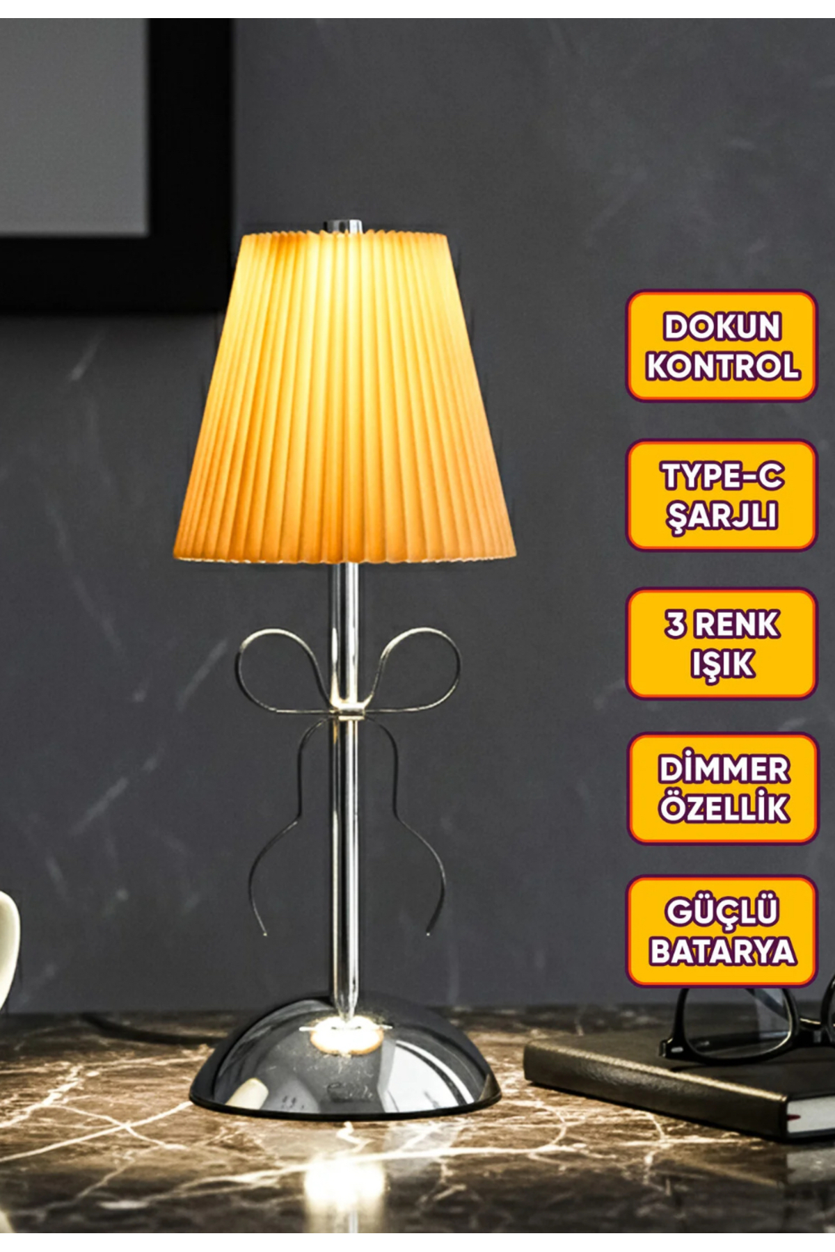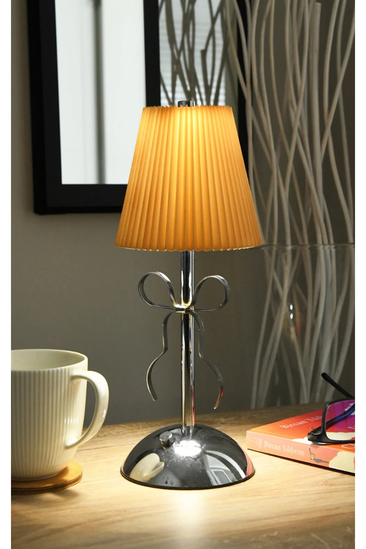Modern Bow Detailed Fabric Lampshade Touchscreen Usb Rechargeable 3 Color Light Mode Chrome Desk Lamp