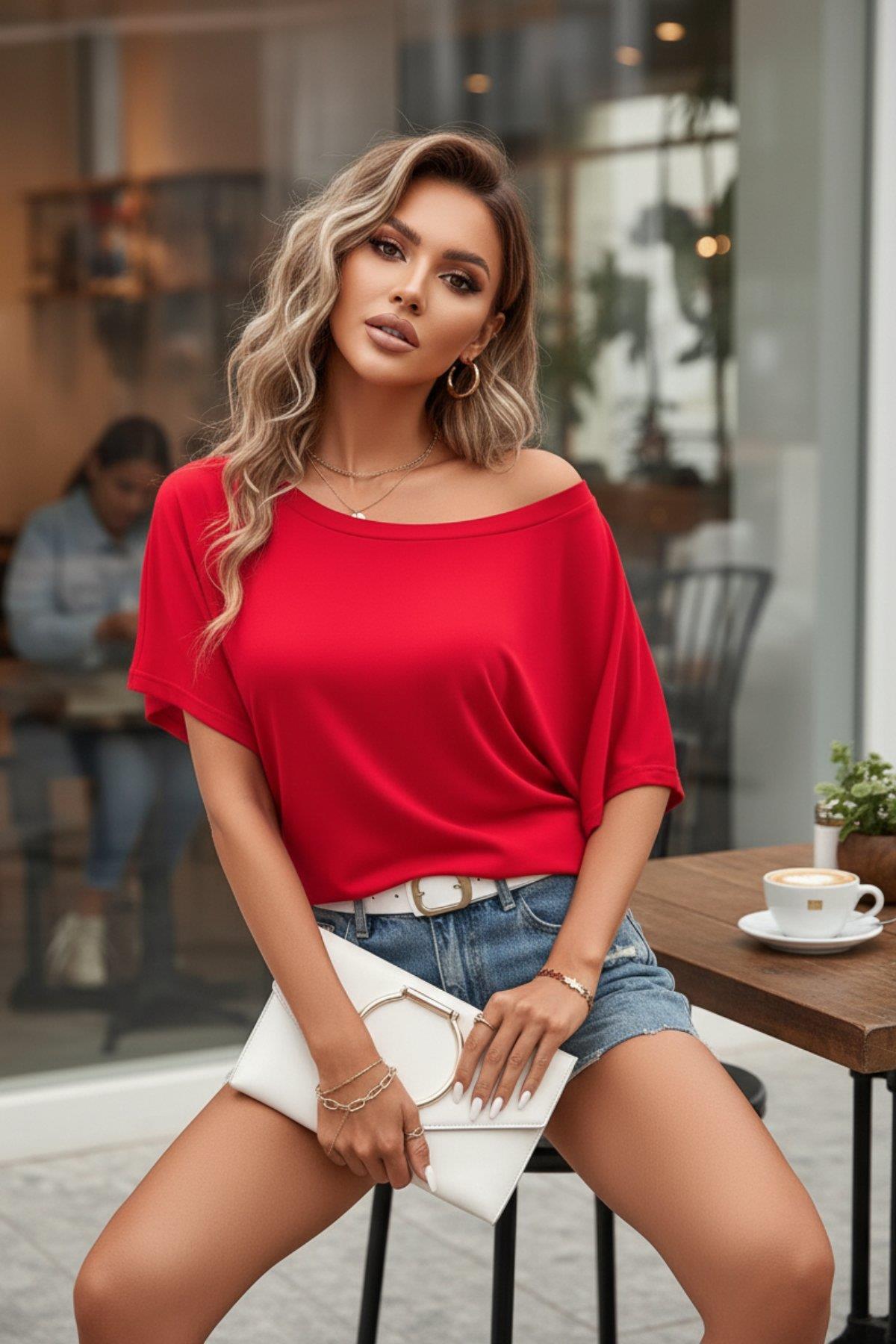 Low Shoulder Loose Fit Bat Sleeve Viscose Blouse - Red