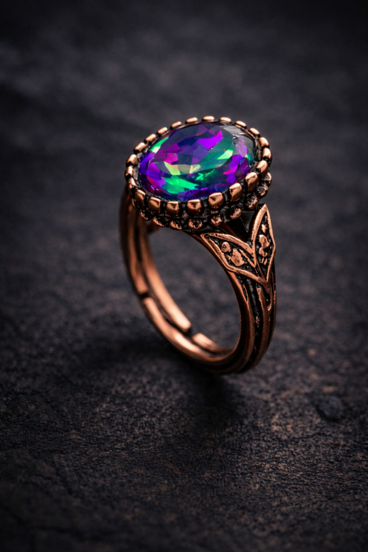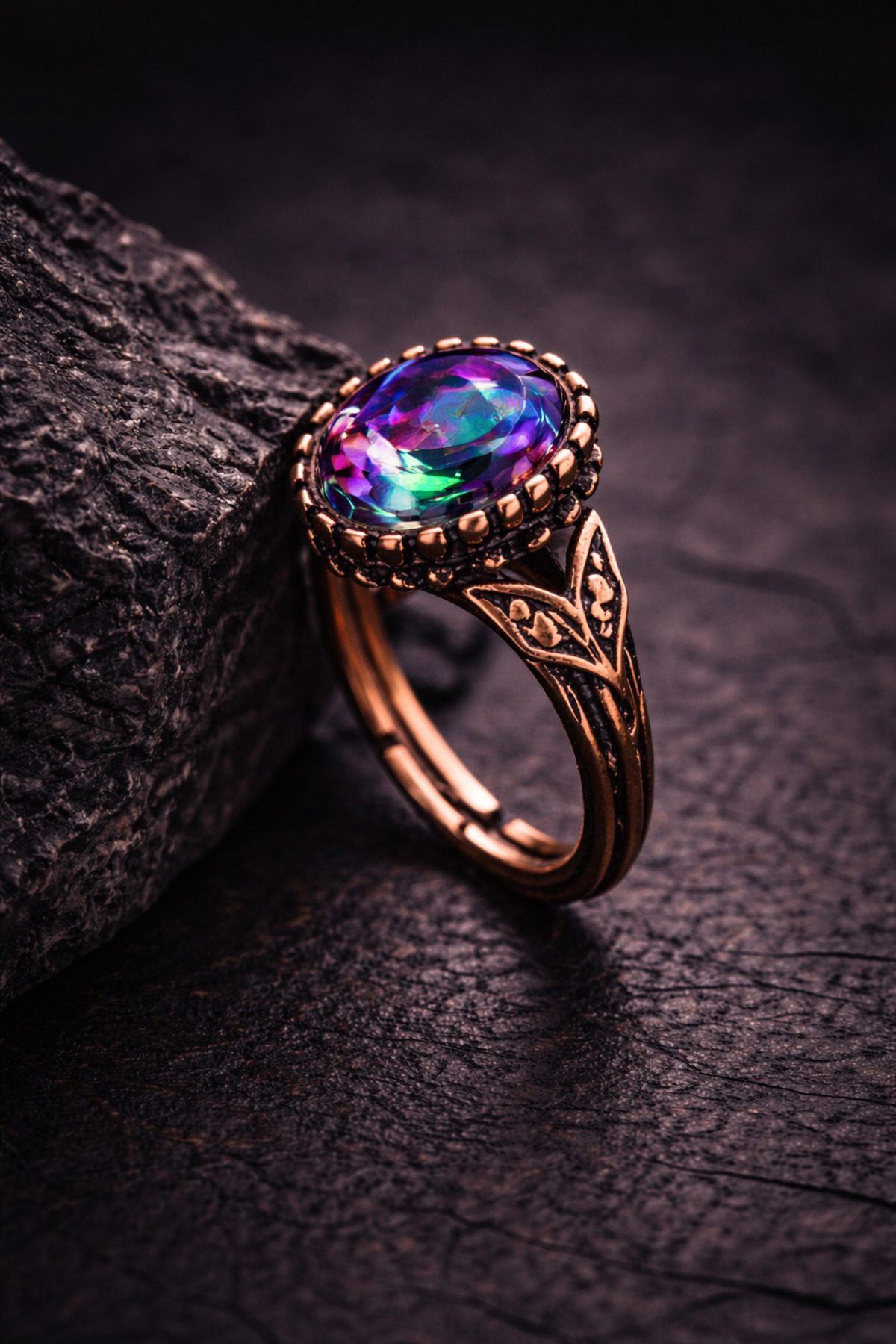 The mystical topaz stone in the center offers fascinating reflections in 3 main color tones: green, blue and purple according to the angle of incidence of light