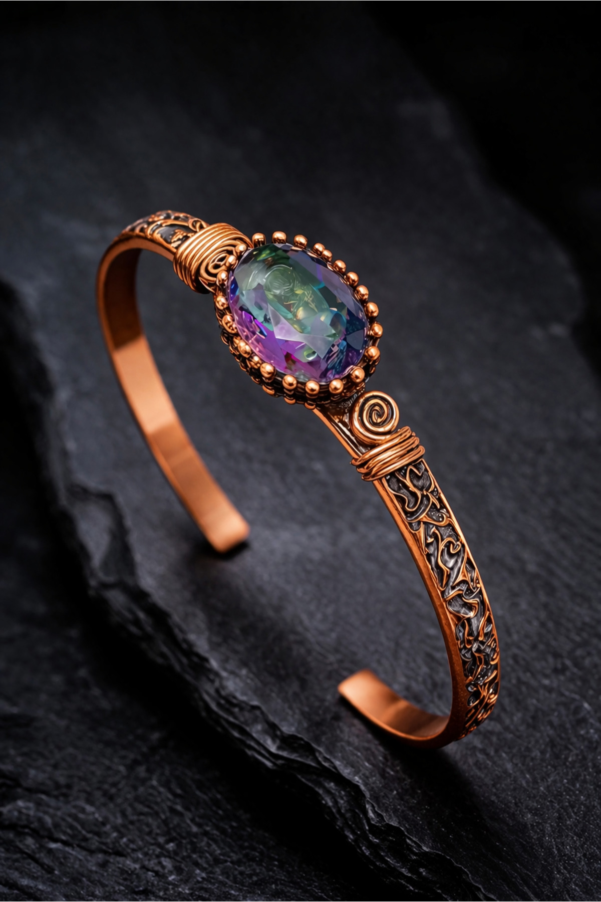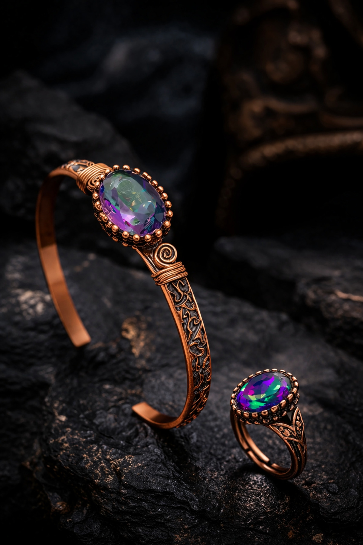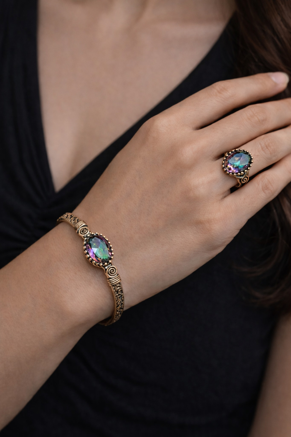Offering elegance and craftsmanship together, this Mystic Topaz Gemstone Copper Bracelet and Ring Set is a candidate to be indispensable for special jewelry collections with its unique appearance and strong energy feeling