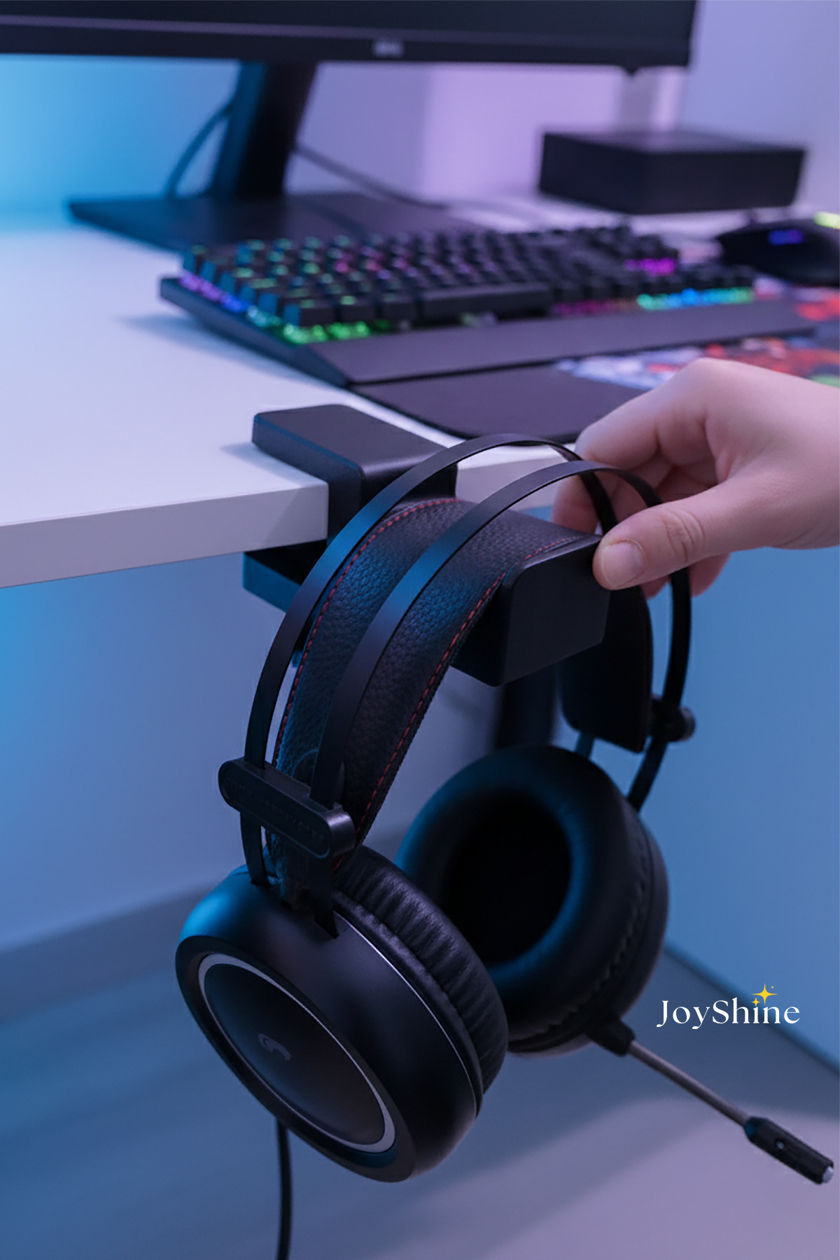 Are you tired of cable clutter and large stands taking up space in your gaming setup or office setup? The table-side hanging headset stand is designed to keep your headset at hand at all times without occupying valuable space on your desk.