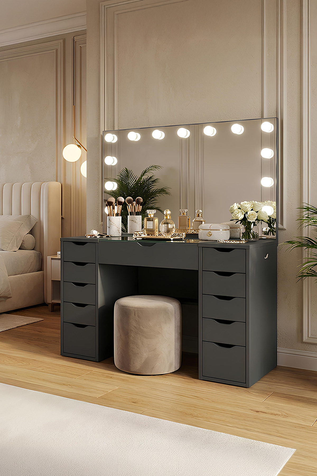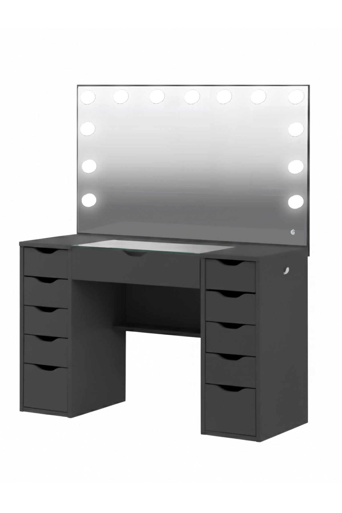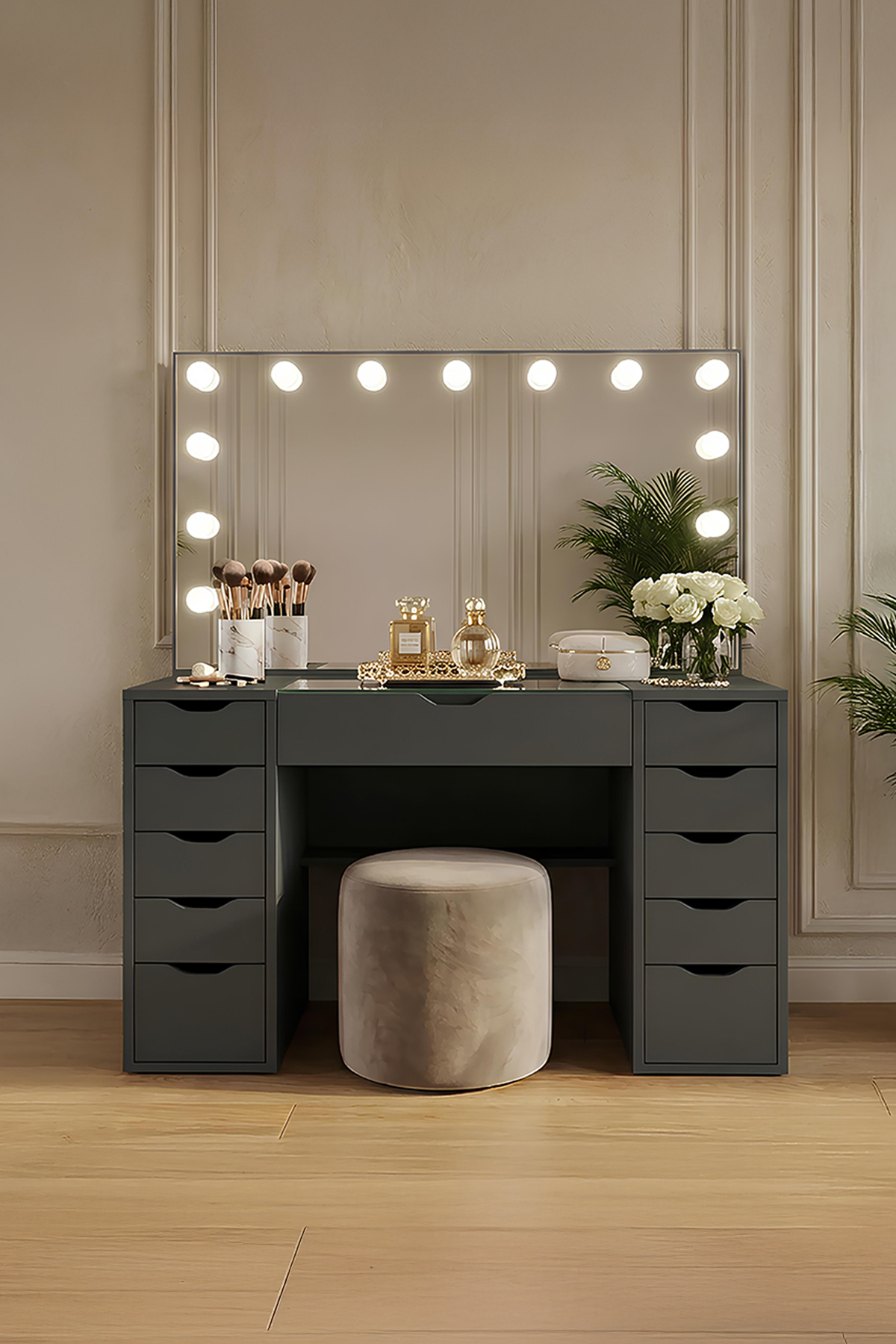 benim odam 11-Drawer Vanity Table with Diva Glass Table and Full Hollywood Led Light Anthracite Grey | ByTR