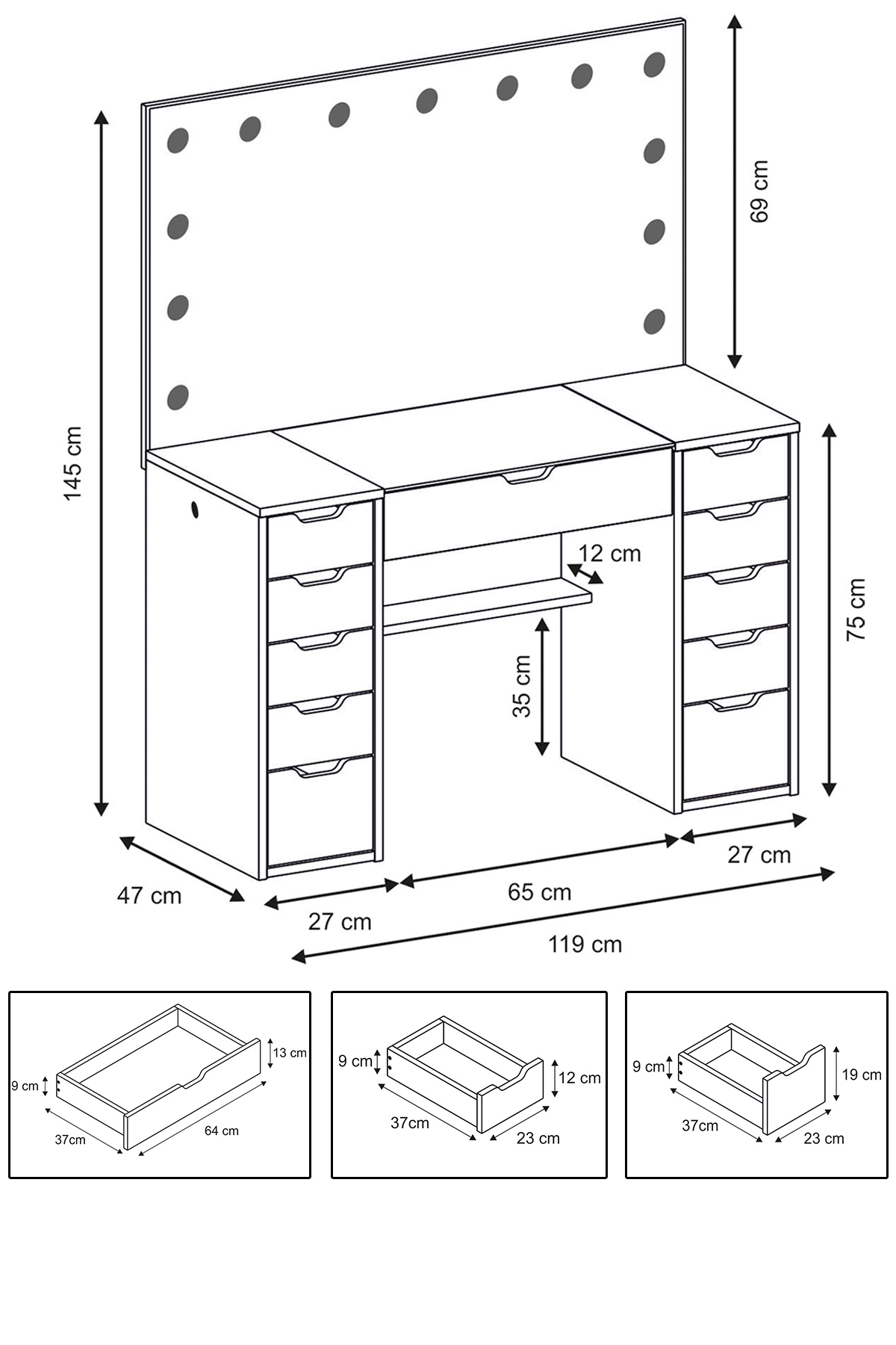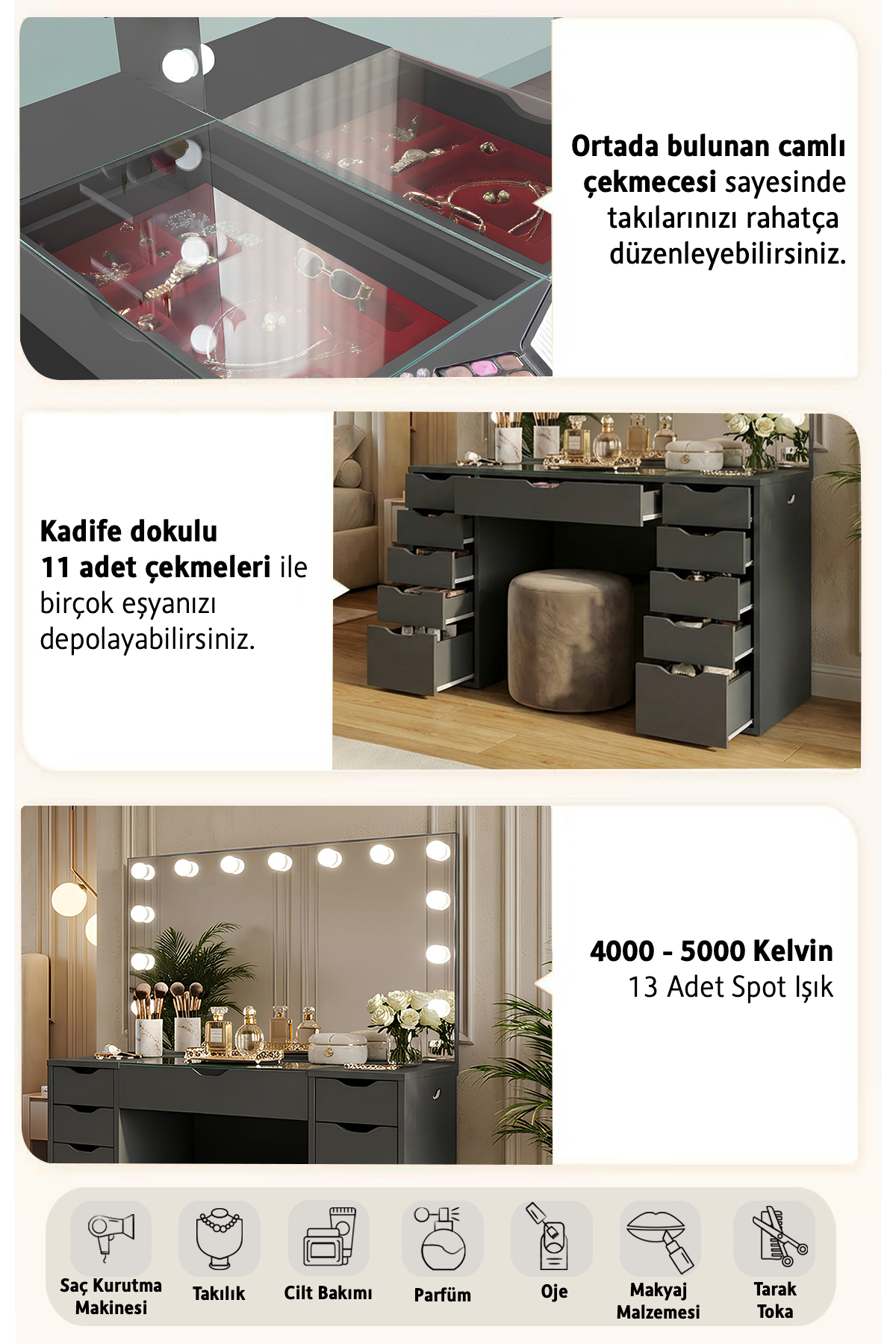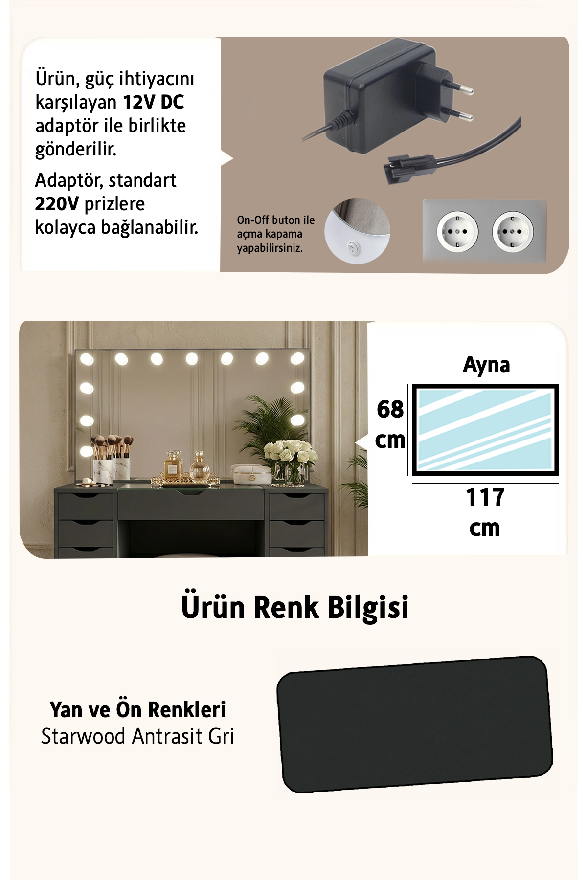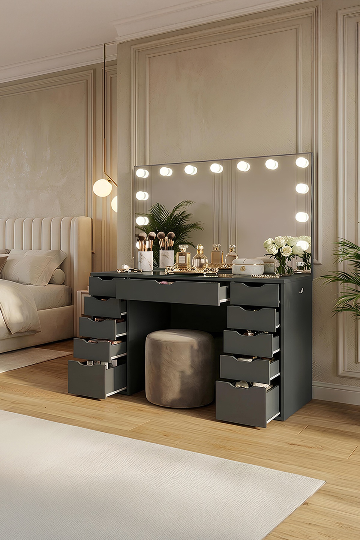 benim odam 11-Drawer Vanity Table with Diva Glass Table and Full Hollywood Led Light Anthracite Grey | ByTR