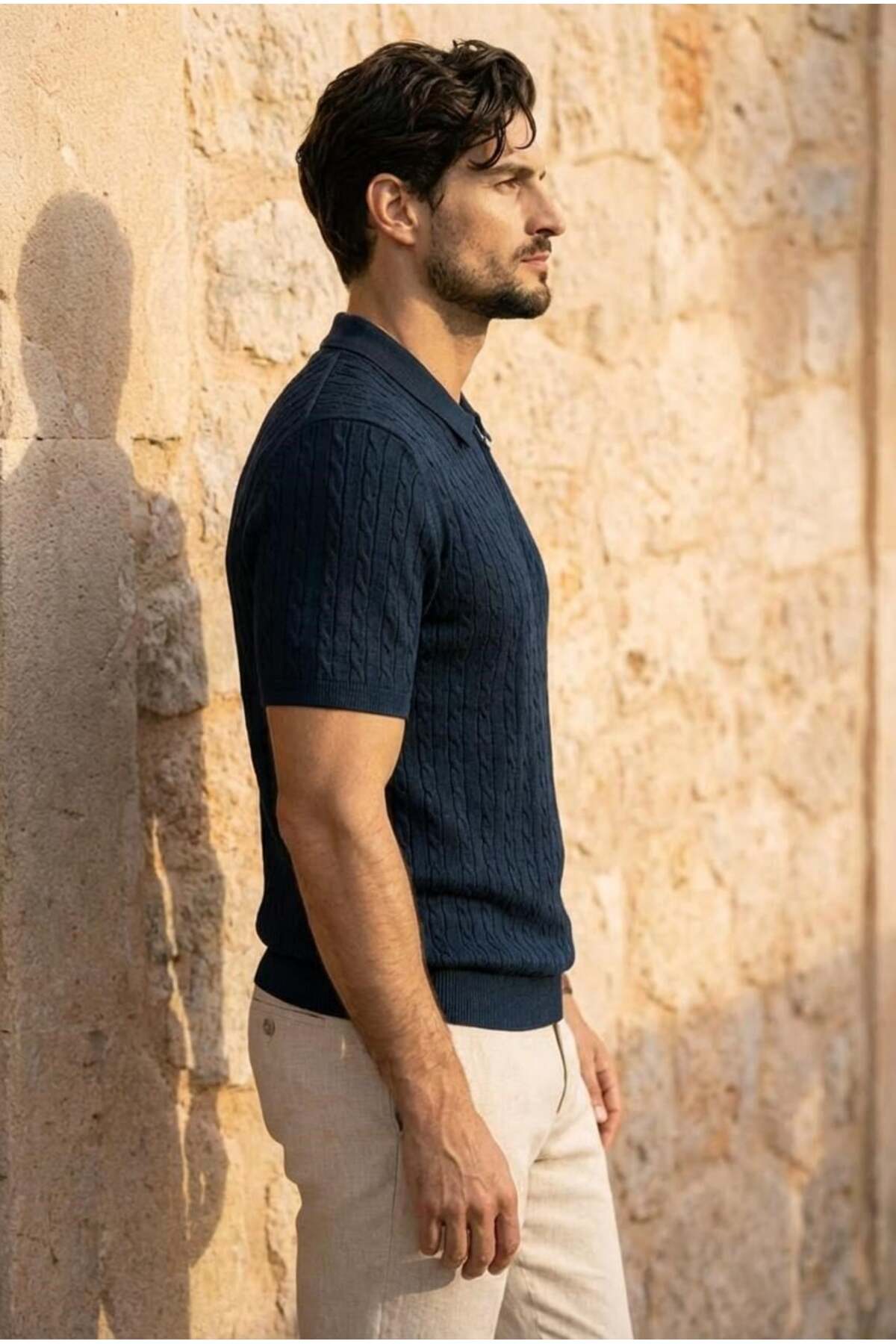 While it differs from the classic t-shirt look thanks to its fine knitwear structure with hair weave texture, its half zippered collar detail gives it a modern and strong style.