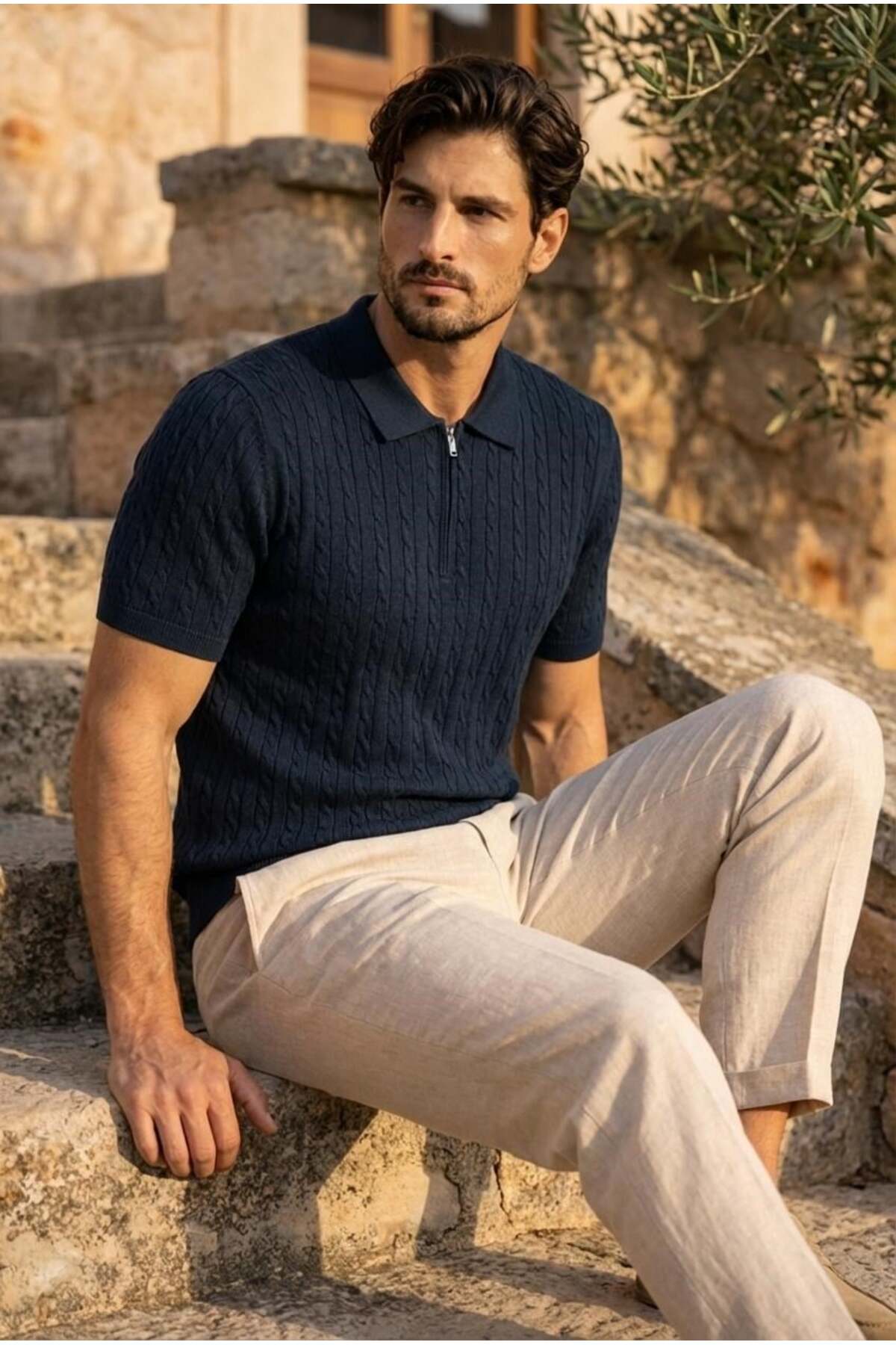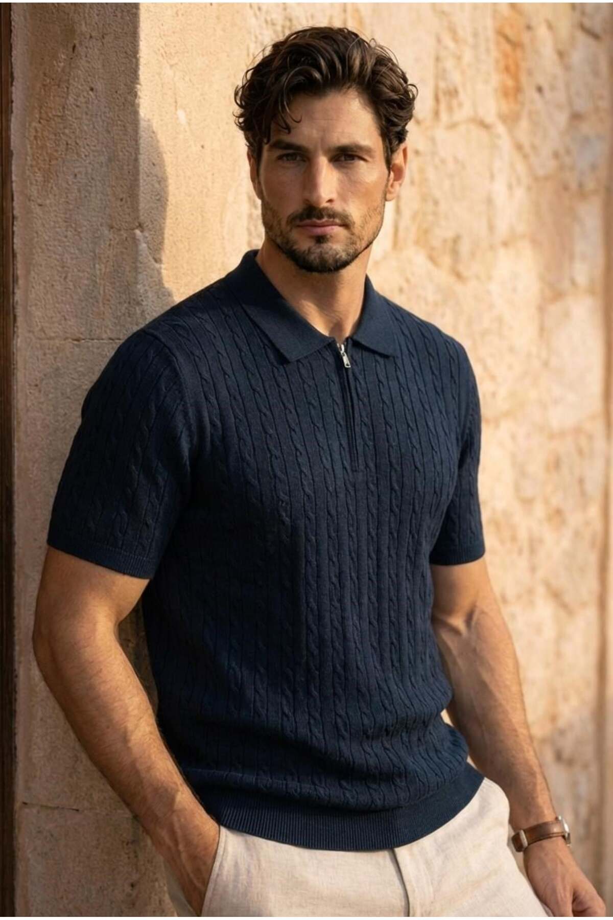 Product Information Fabric: Thin Knitwear – Hair Weave Textured Content: 75% Cotton, 25% Polyamide Collar: Half Zippered Sleeve: Short Sleeve Sizes: S / M/L / XL Colors: Black, Navy, Beige, Burgundy, Ecru Pattern: Regular – casual cut Season: Spring / Summer