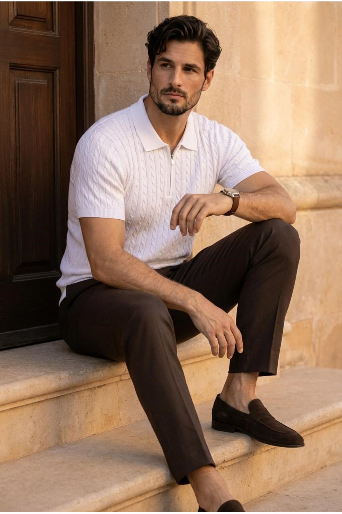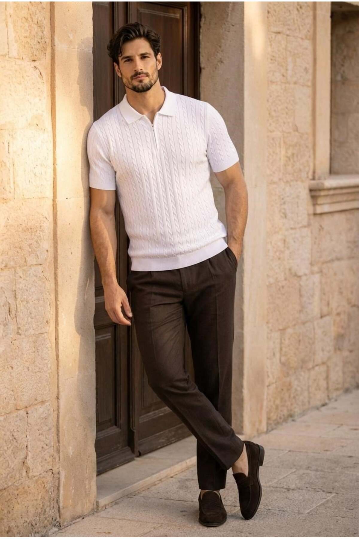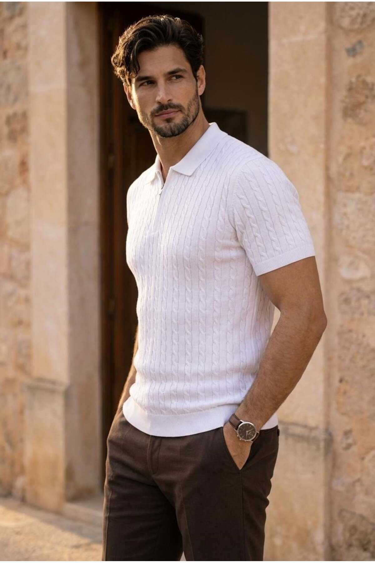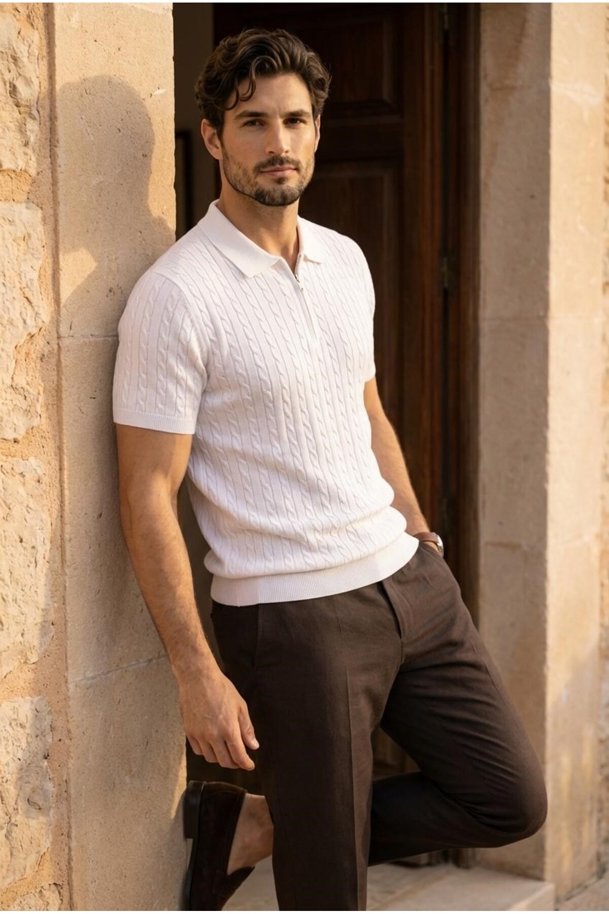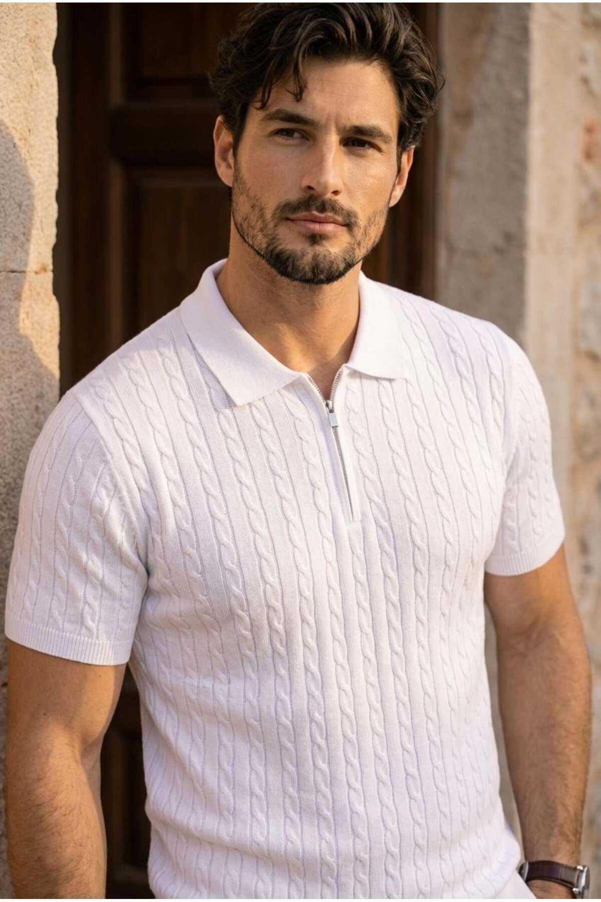Valiberta Burke Hair Weave Half Zipper Short Sleeve Slim Knitwear Men's T-Shirt- Ecru | ByTR