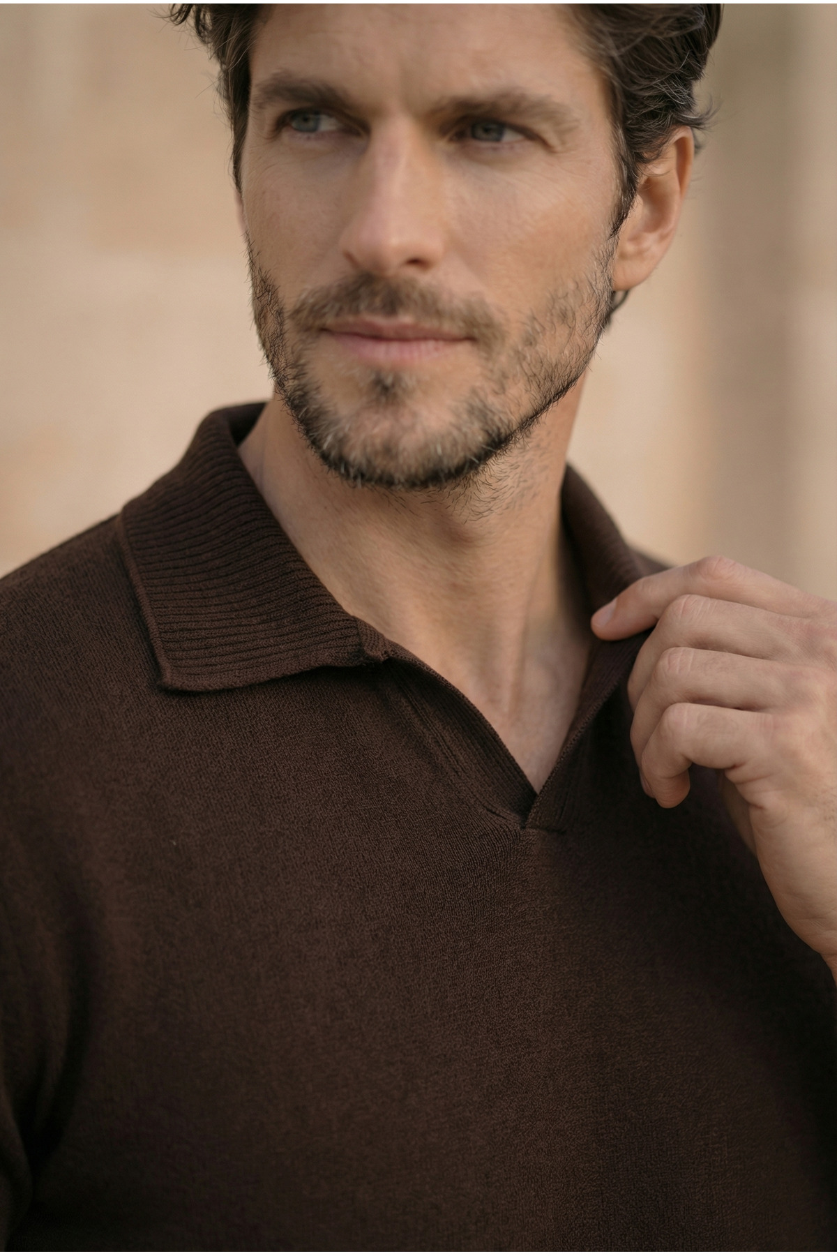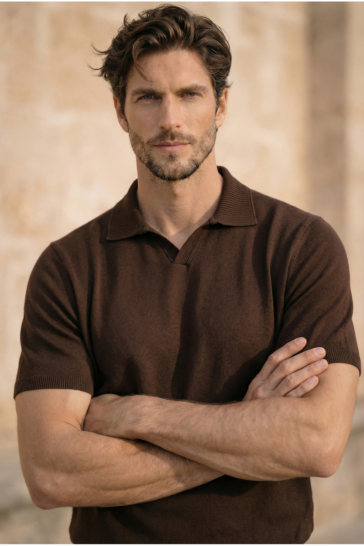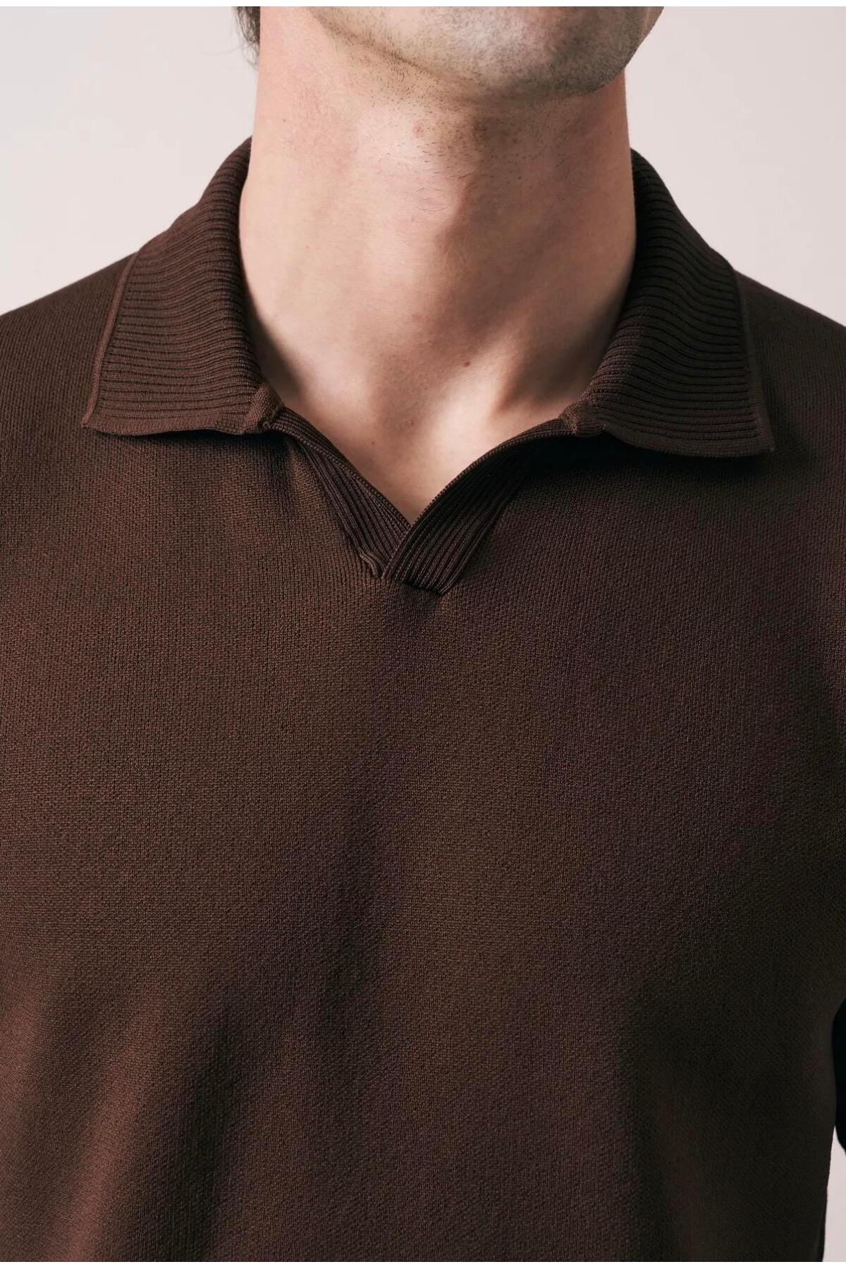 Dawson Polo V-Neck Buttonless Short Sleeve Slim Knitwear Men's T-Shirt reinterprets the classic polo neck form with a modern V-neck detail.