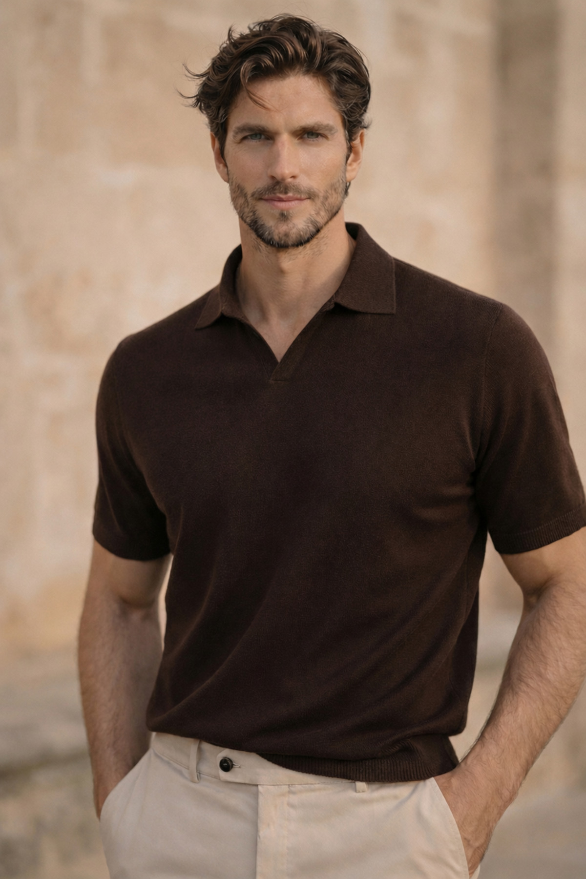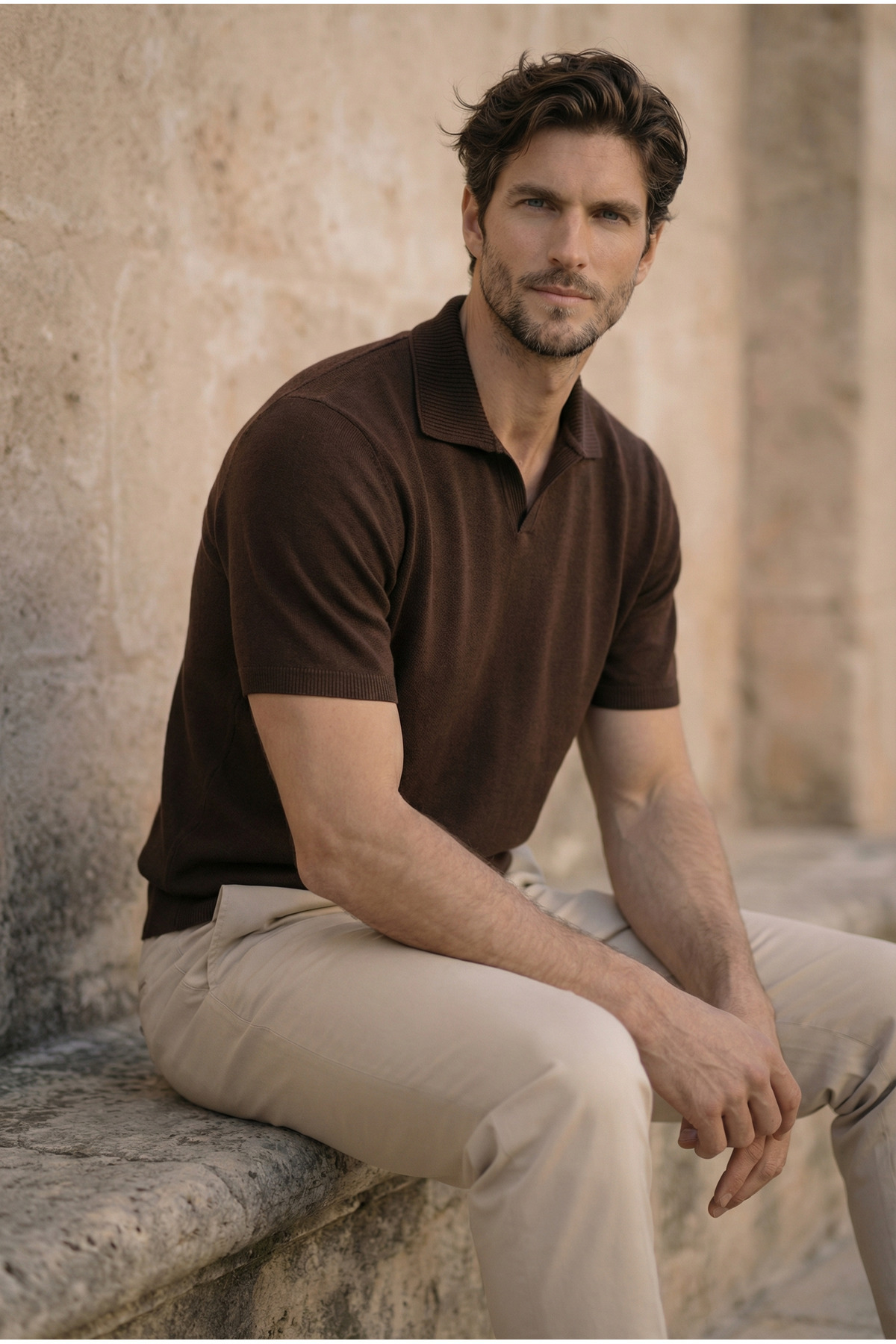 Product Information Fabric: Thin Knitwear Content: 75% Cotton, 25% Polyamide Collar: Polo V Neck (Buttonless) Sleeve: Short Sleeve Sizes: S / M/L / XL Colors: Black, Ecru, Navy Blue, Beige, Burgundy Pattern: Regular – comfortable cut Texture: Soft, lightweight, breathable Season: Spring / Summer