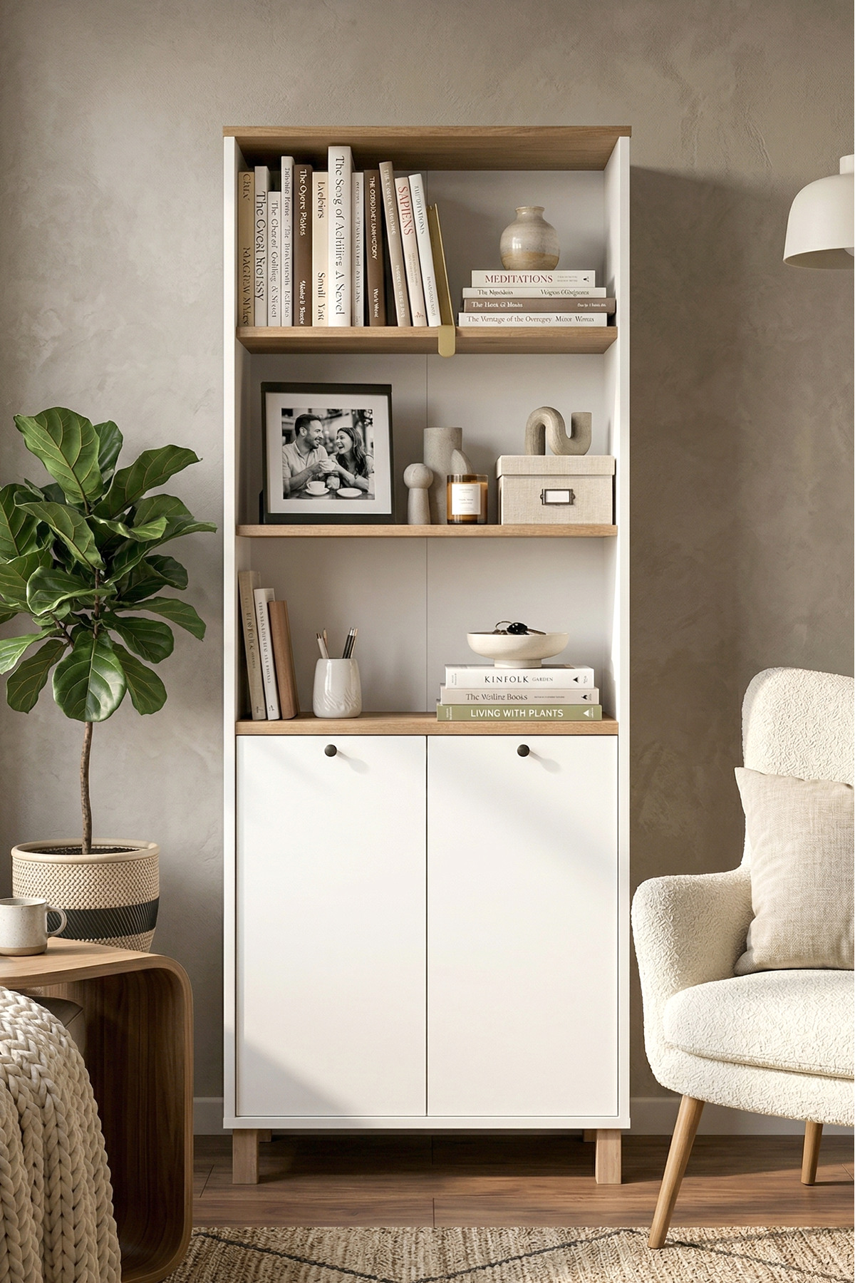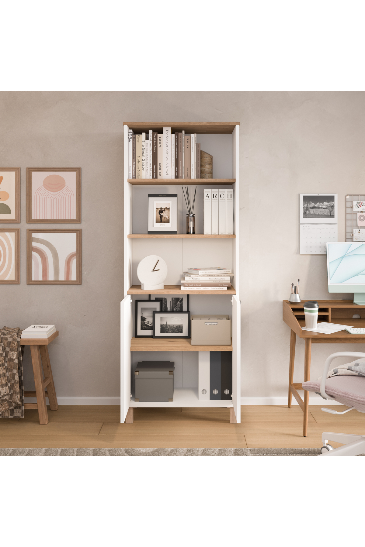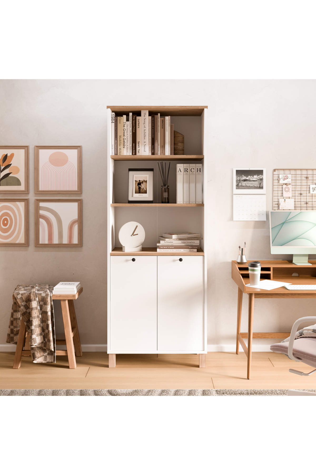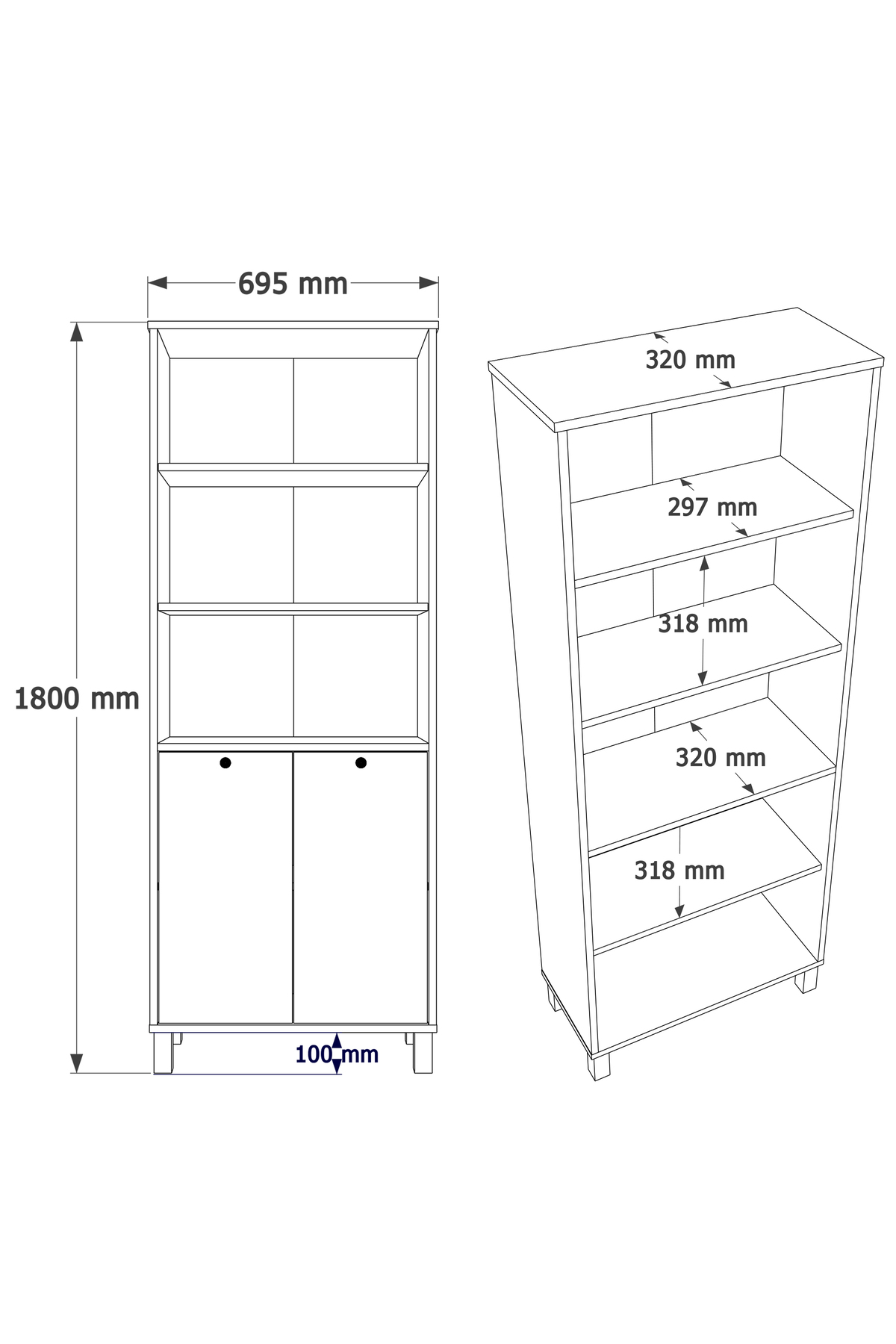 Yurudesign Nord Bookshelf Shelf With Wooden Legs 180cm Cover Basket-White ND13-SW Size : Width :695 mm Depth: 320 mm Height: 1800 mm Materials Used: Melamine-faced 18mm particleboard suitable for environmental and child health in 1st class E1 quality standards is used.