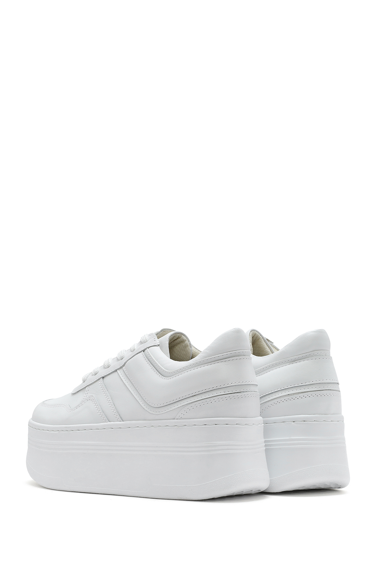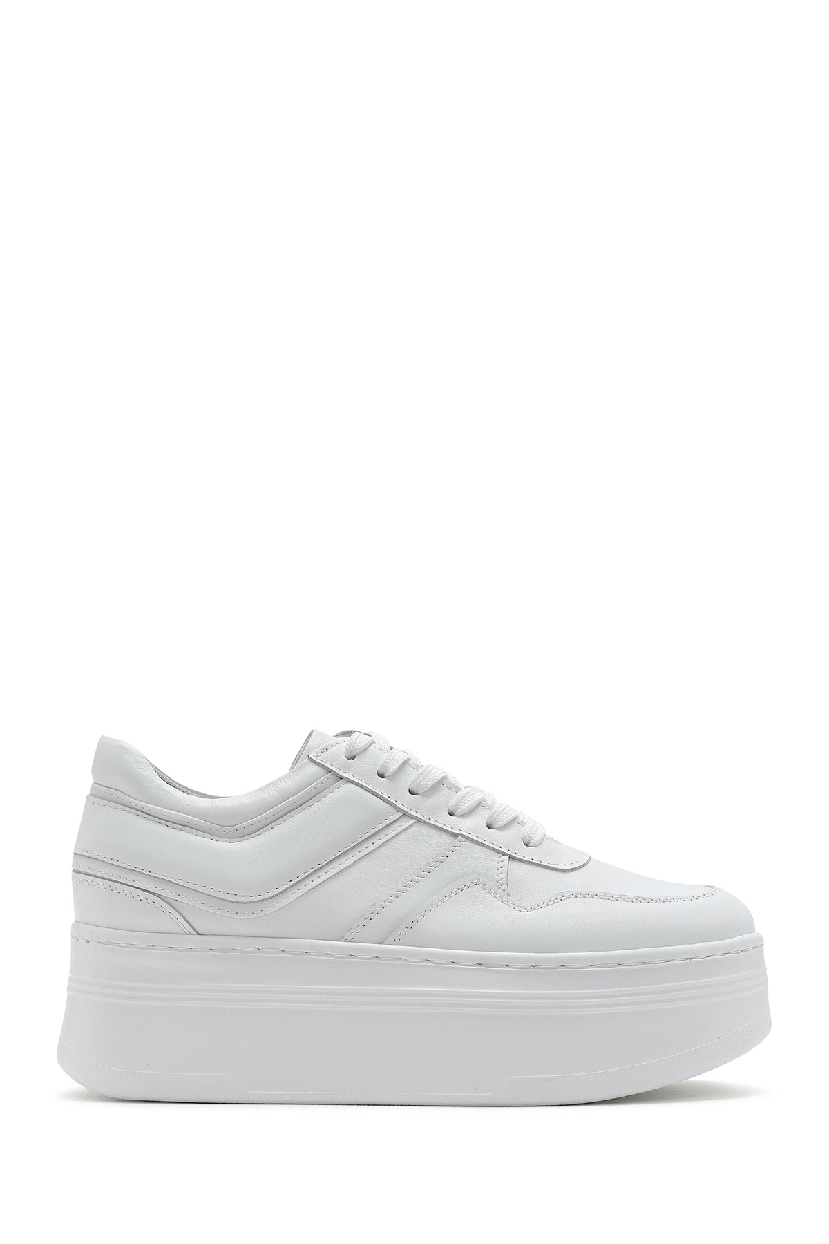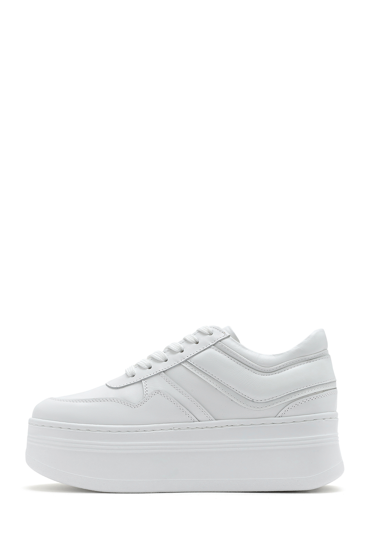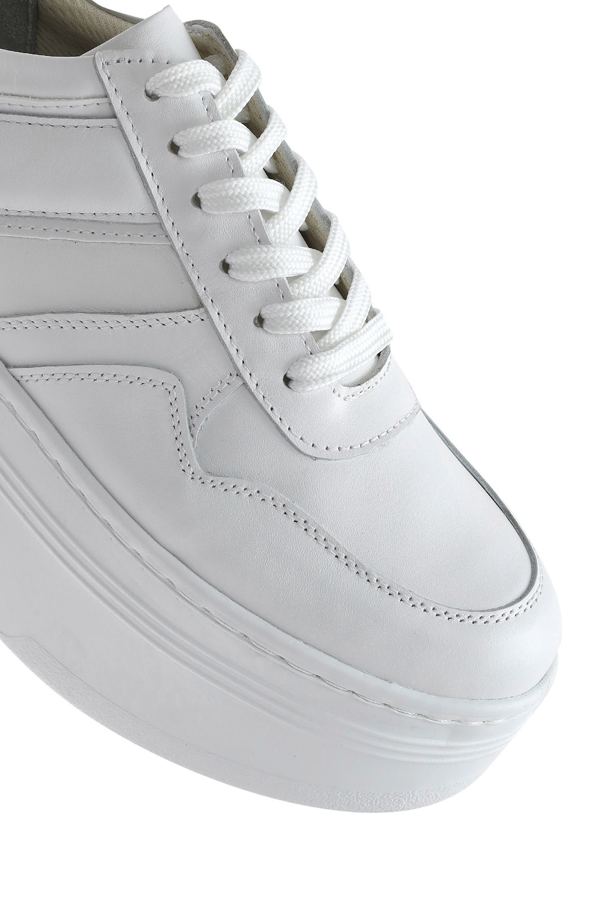 Women's White Lace-Up Thick-Bottomed Leather Sneaker Includes cowhide.
