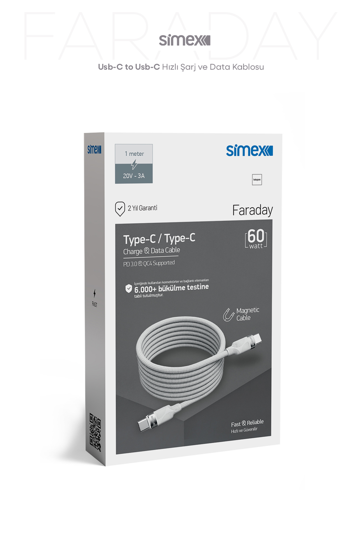 Featured Features - Type-C/ Type-C charging and data cable - Power support up to 60W (20V-3A) - PD 3.0 & QC 4.0 supported - Magnetic cable design - Durable construction with 6,000 + bend tests - 1 meter length *Technical Features - Cable Type: Type-C/ Type-C- Power: Up to 60W - Current/Voltage: 20V – 3A - Length: 1 meter - Support: PD 3.0, QC 4.0 *Compatibility - Compatible with Type-C input phones, tablets, power banks and other Type-C supported devices.