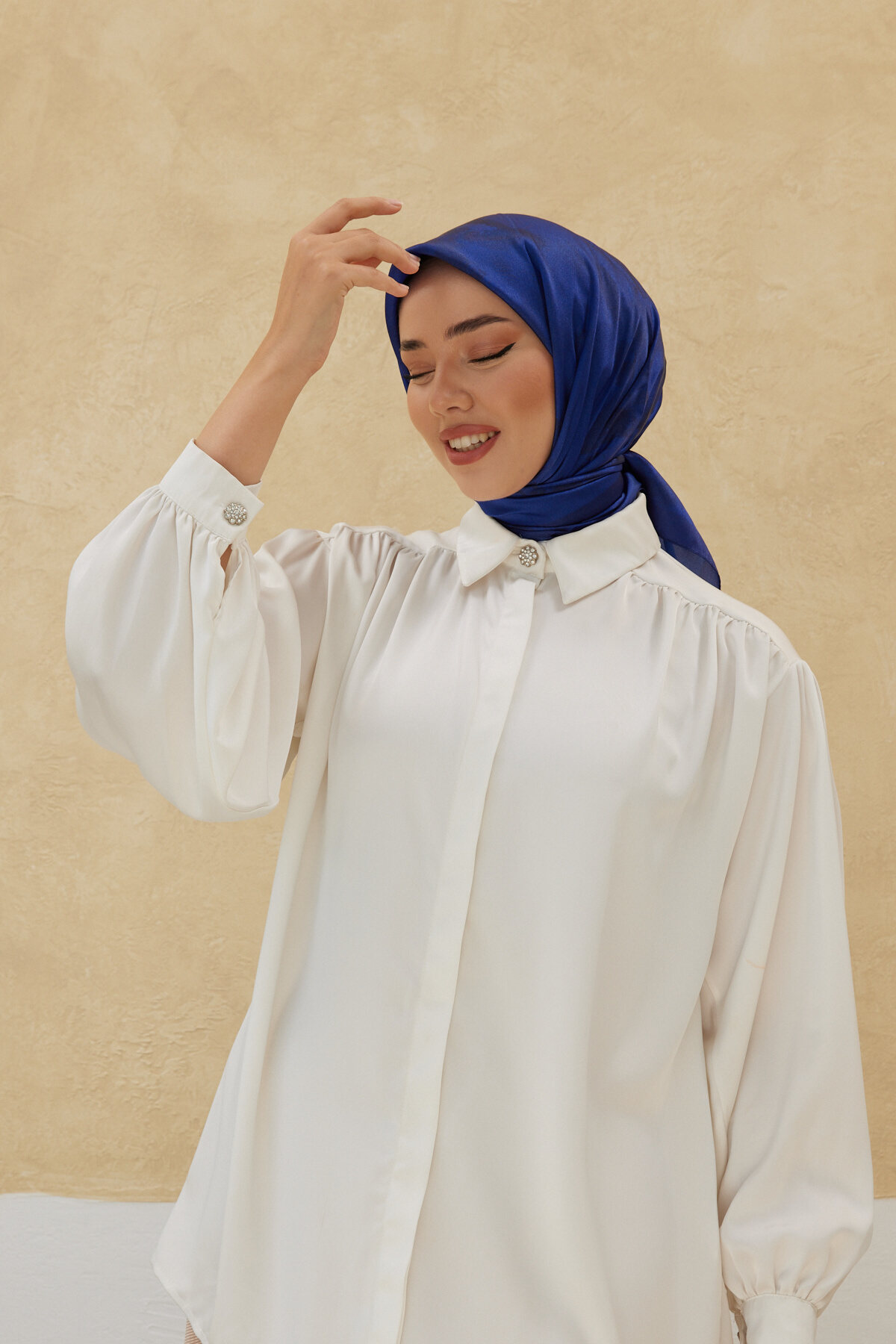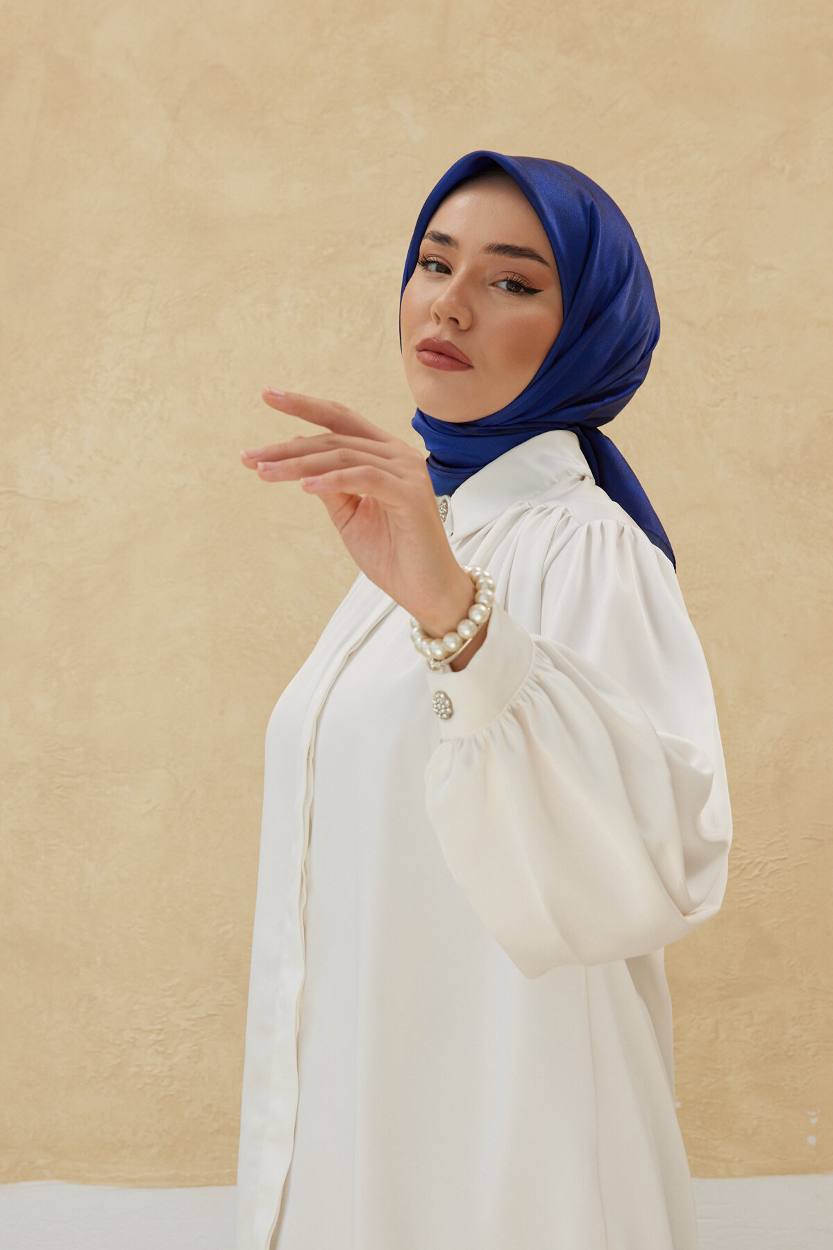 Pair this sax blue scarf with a satin blouse or beige blazer in cream tones to create a stylish and modern contrast.
