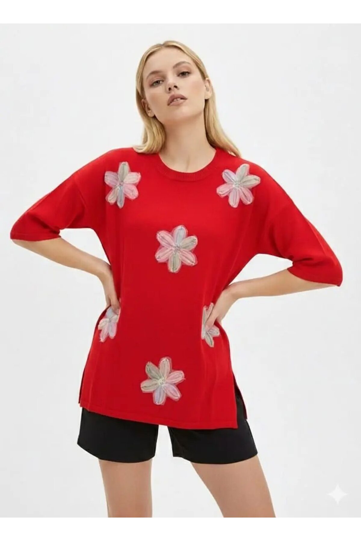 Women's Crew Neck Side Slit Applique Oversized Knitwear Sweater