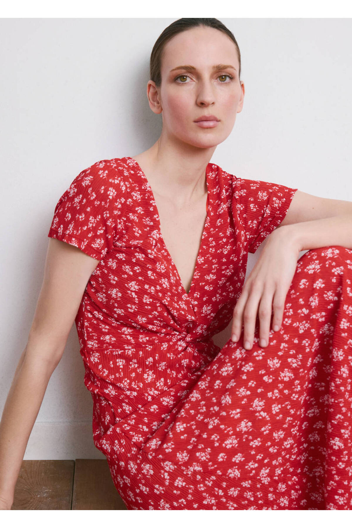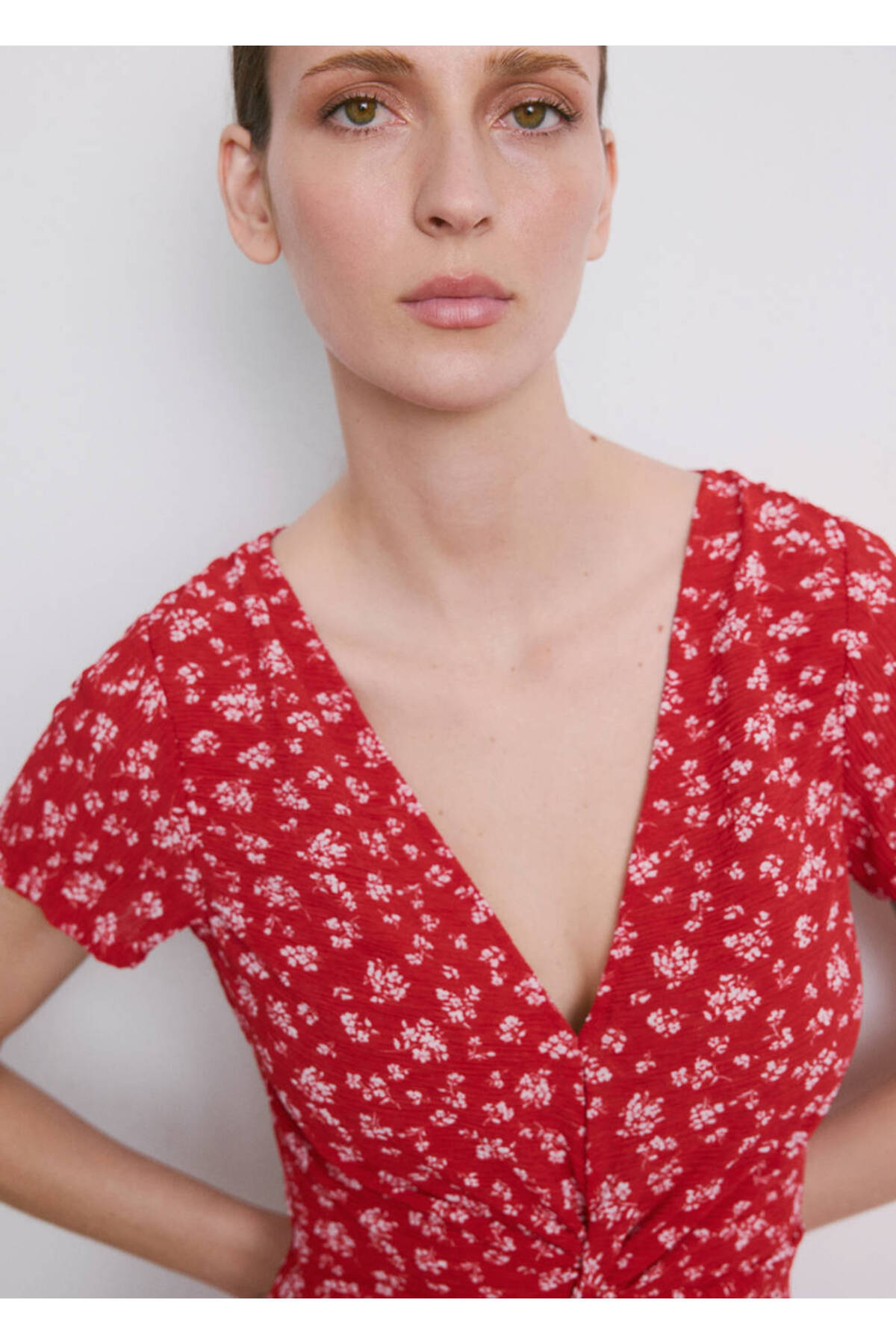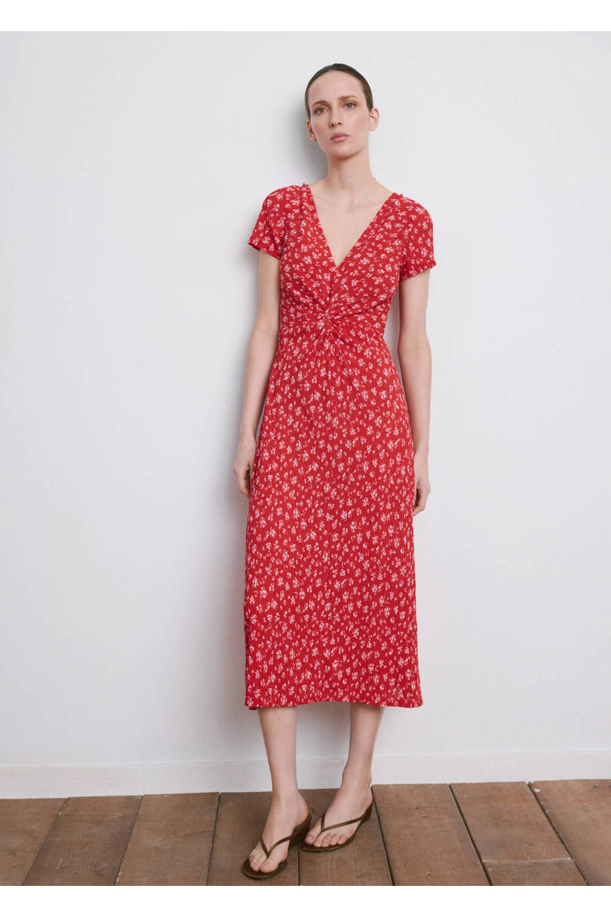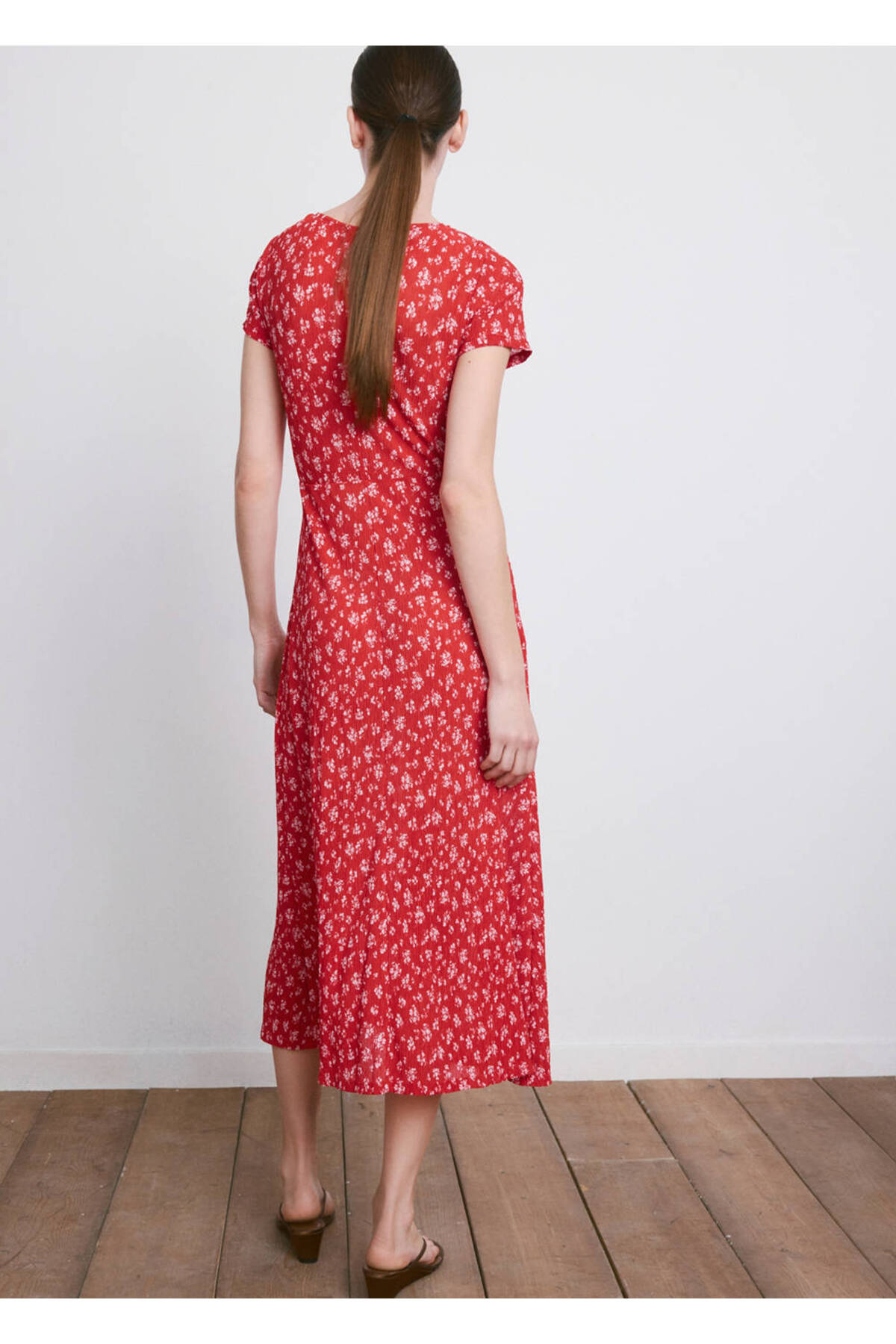Flat design, Midi design, Floral pattern, V-neck, Short sleeve, Side zipper closure, Disponible Plus.