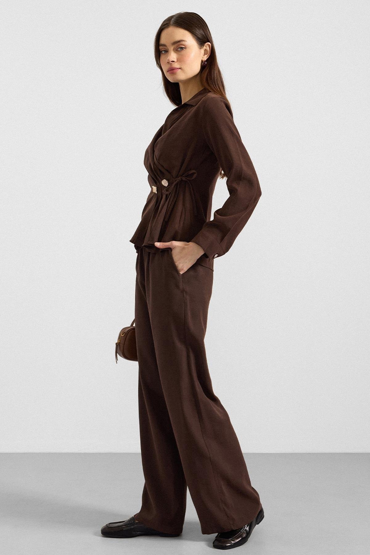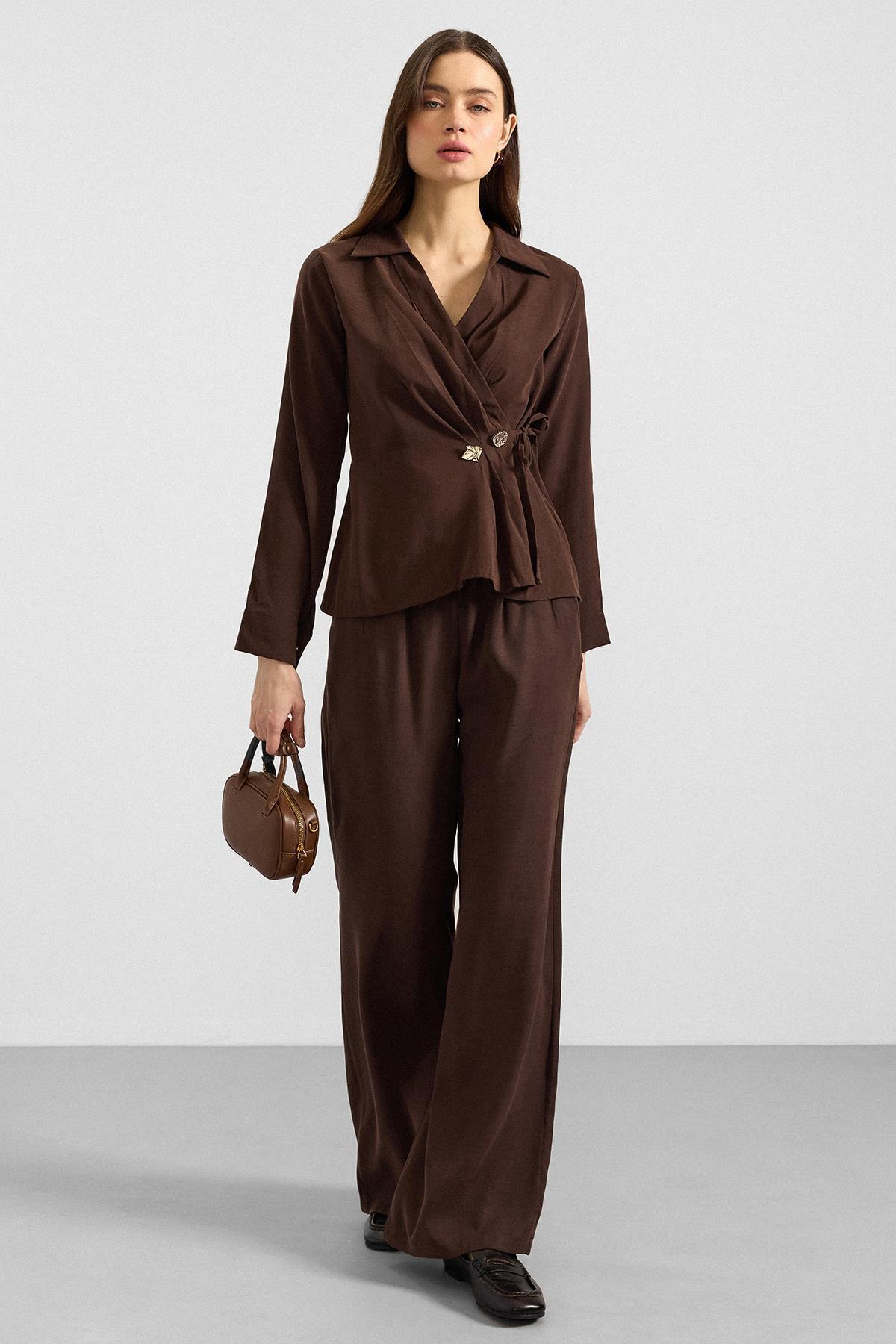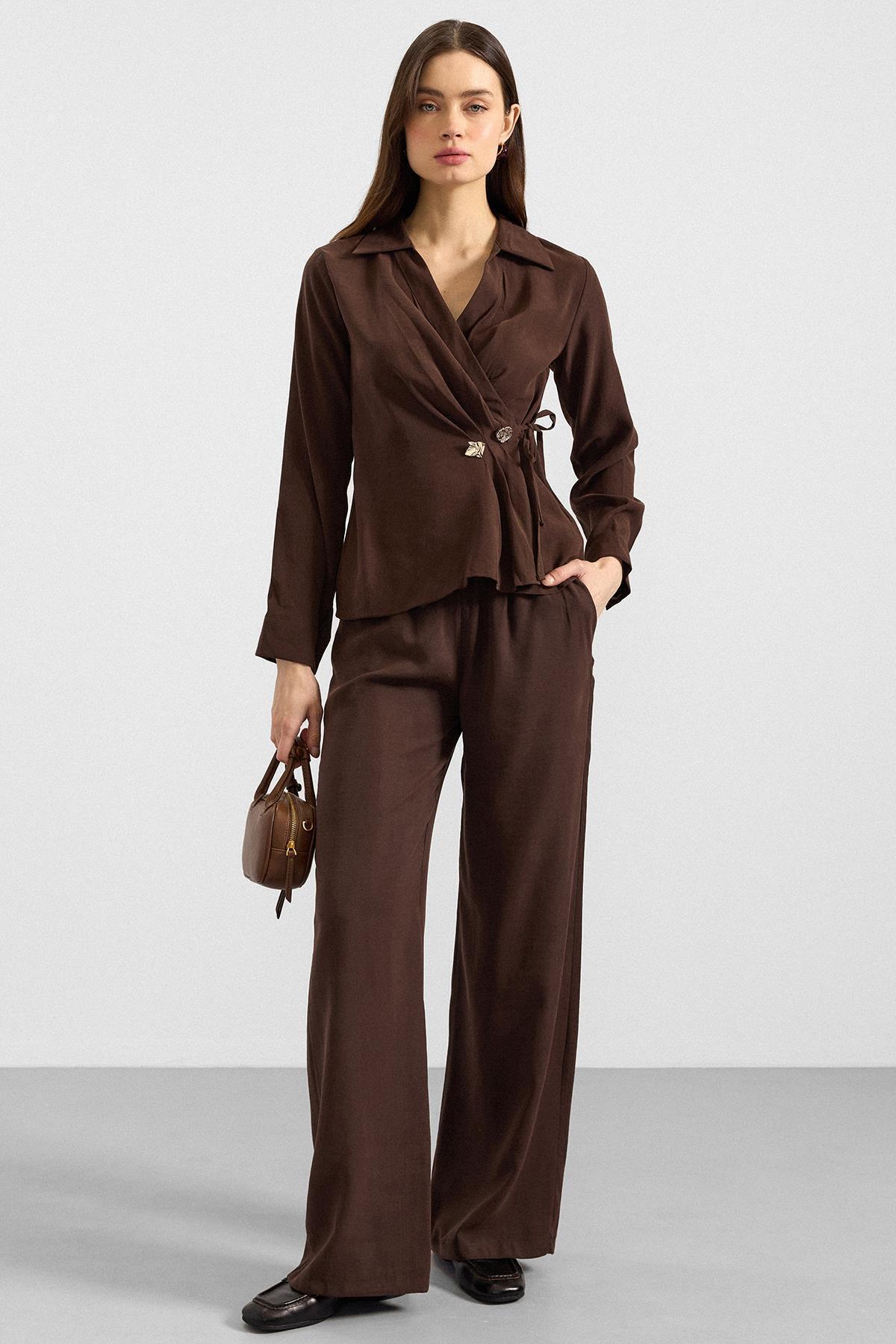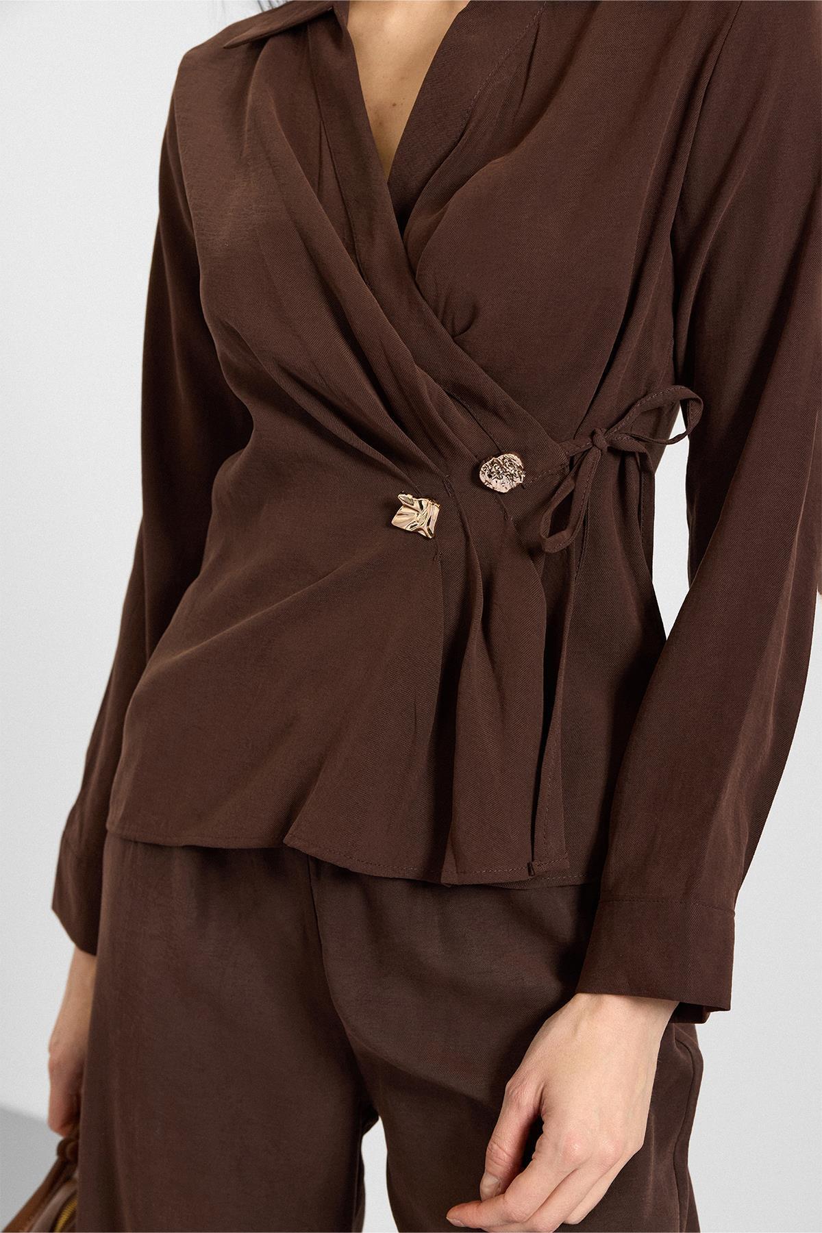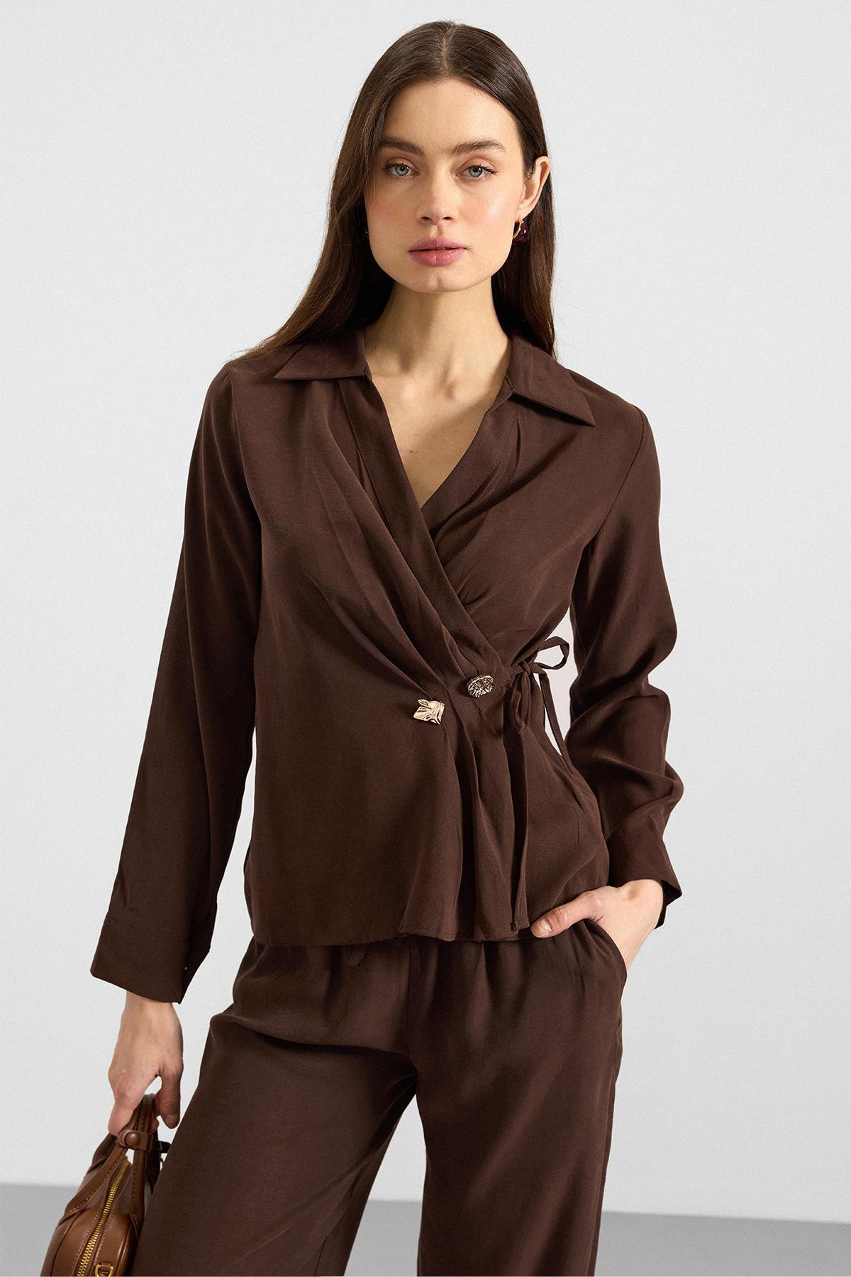 Olcay V-Neck Modal Shirt with Tie BROWN 9407 | ByTR