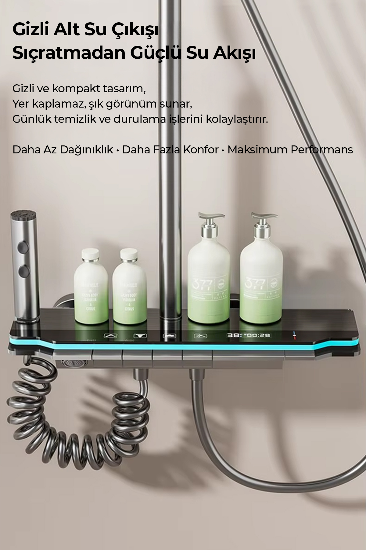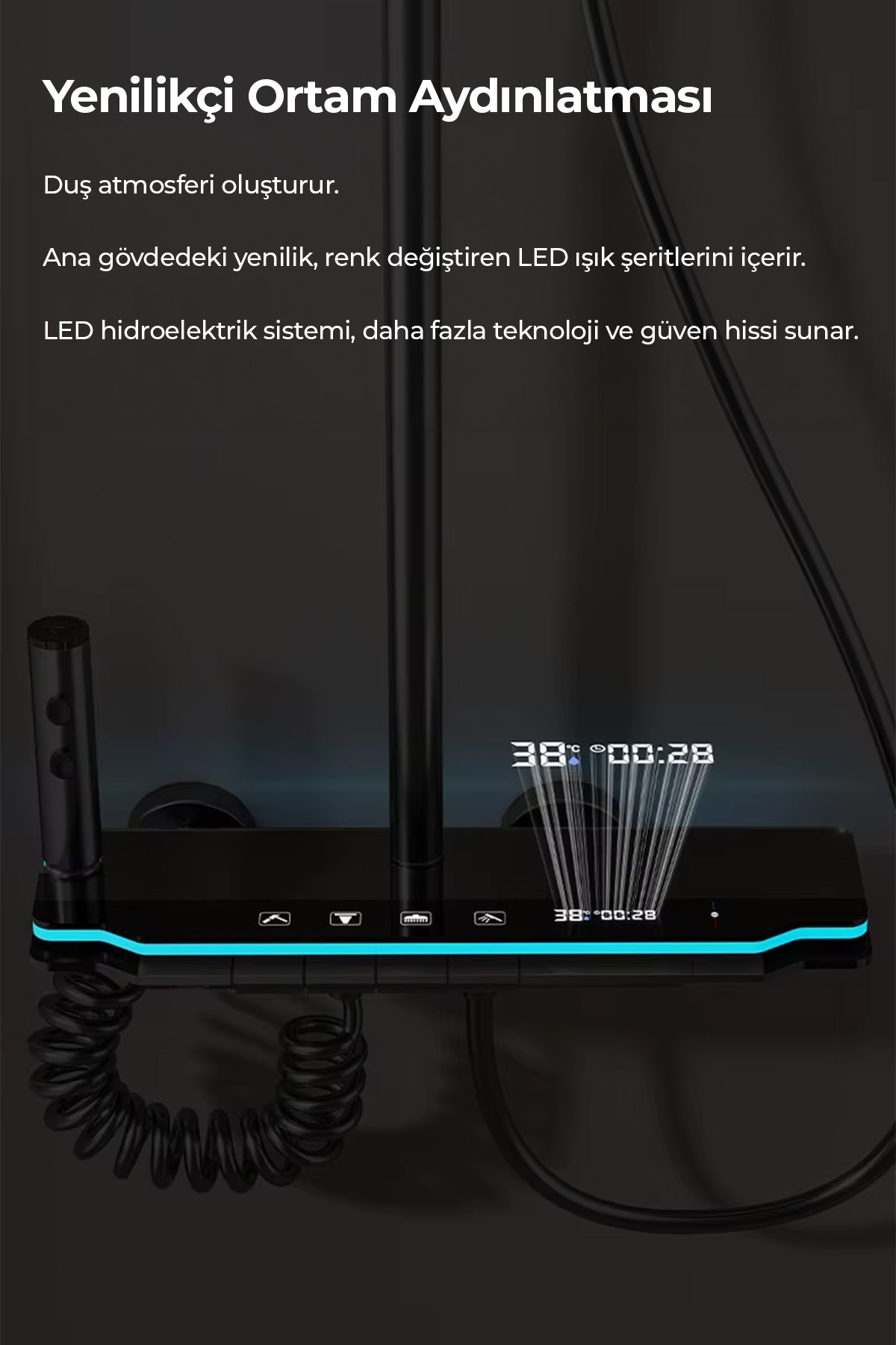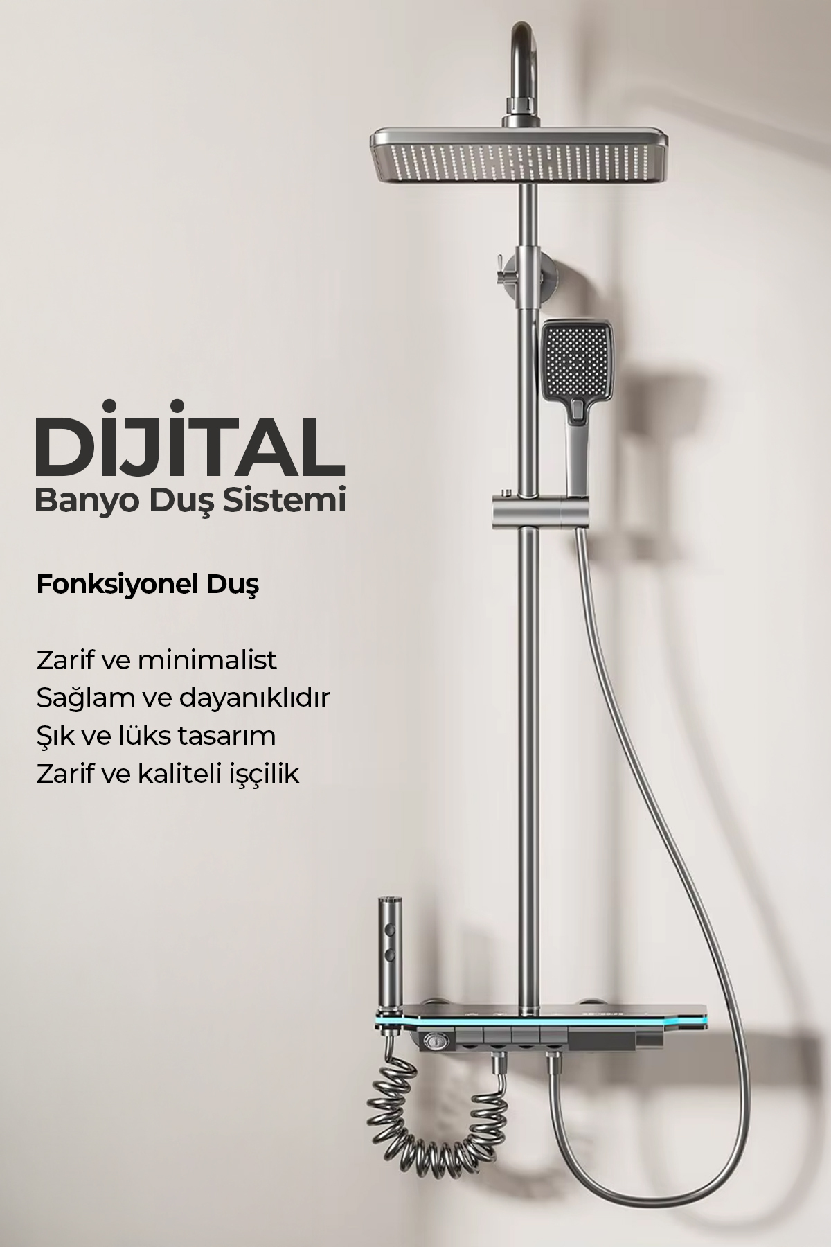 Featured Features ✔ Digital temperature and time indicator ✔ Air pressurized powerful water flow ✔ Concealed bottom water outlet ✔ Rain shower head + hand shower ✔ Stainless, durable and long-lasting construction ✔ Stylish, modern and minimalist design ✔ Easy cleaning and practical use 2 YEARS WARRANTY hose length 148 cm Digital Bathroom Shower System is an ideal choice for those who want comfort, technology and aesthetics together.
