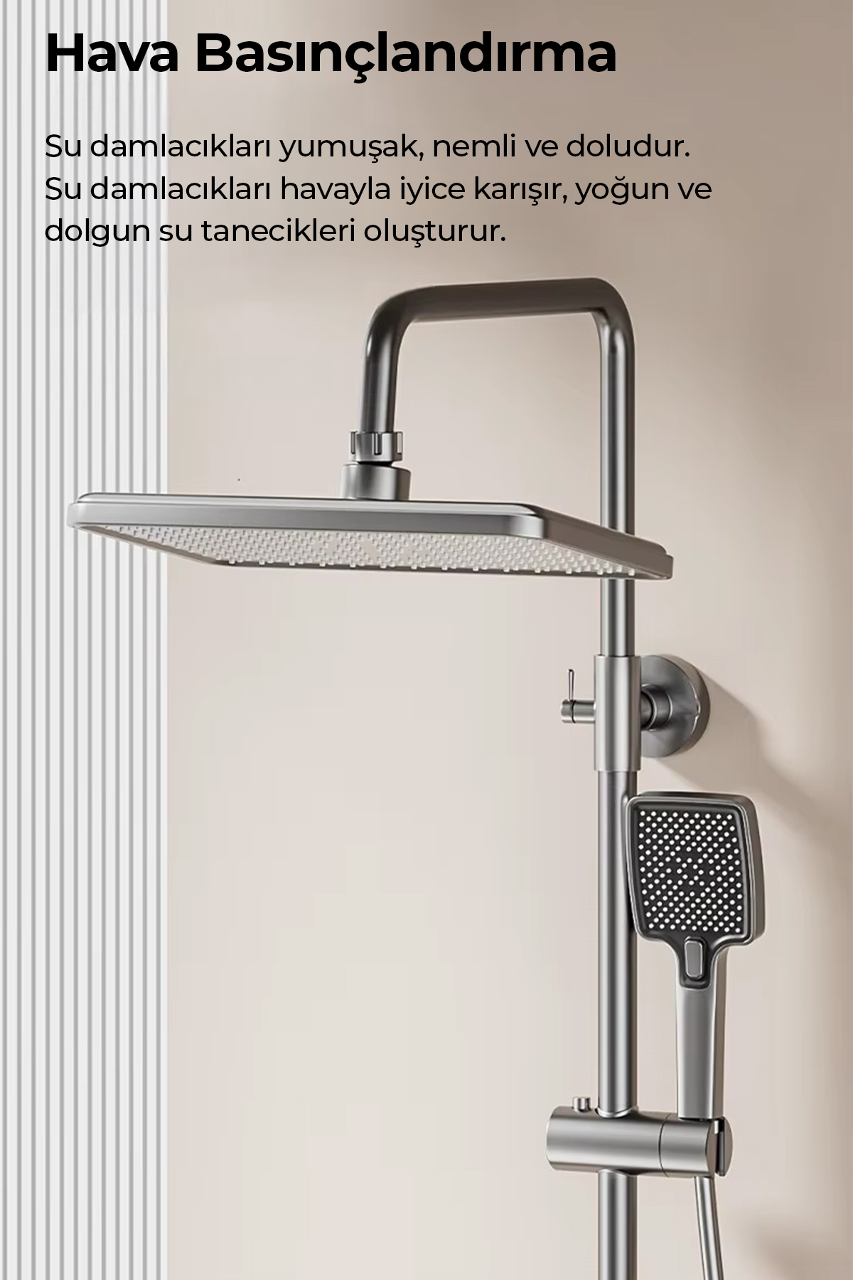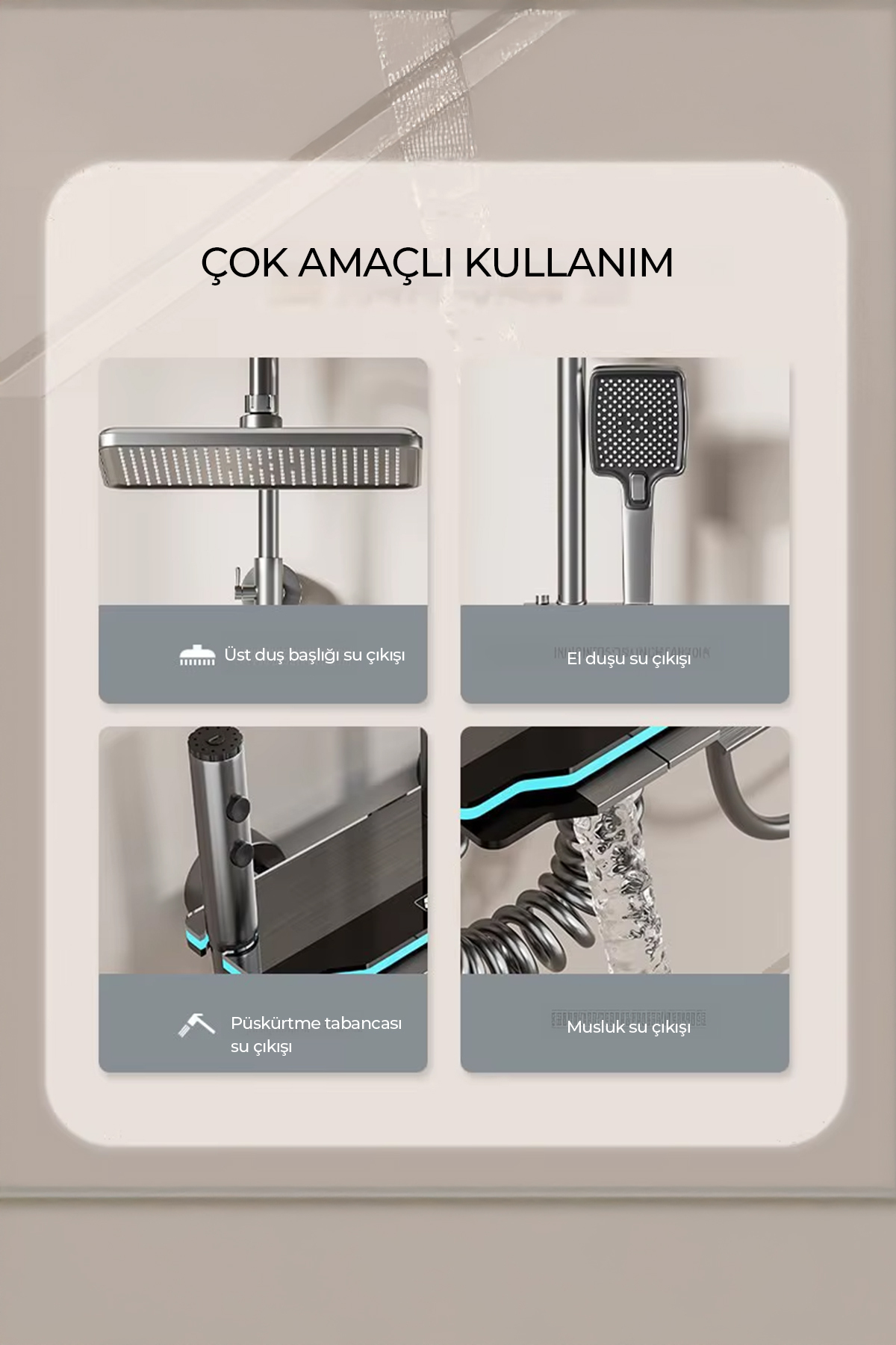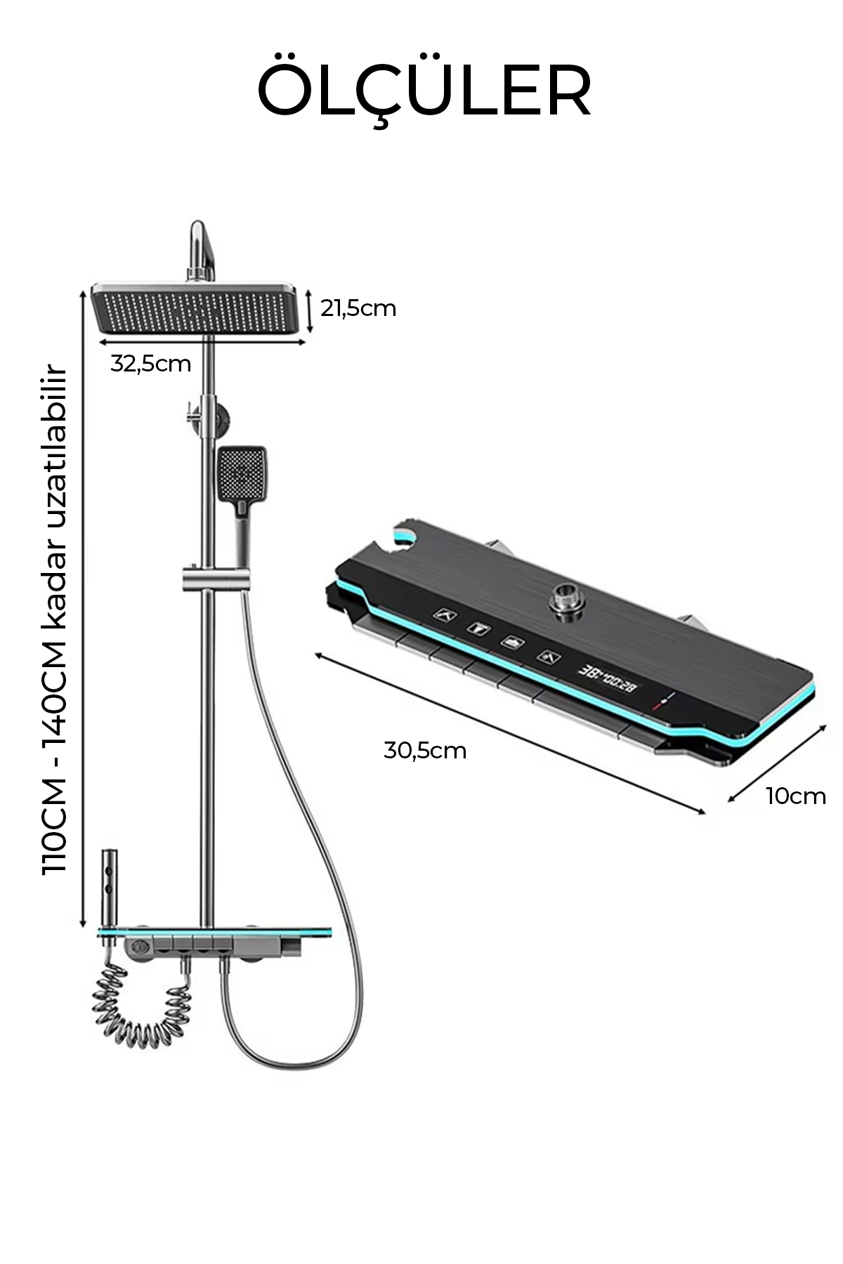 Featured Features ✔ Digital temperature and time indicator ✔ Air pressurized powerful water flow ✔ Concealed bottom water outlet ✔ Rain shower head + hand shower ✔ Stainless, durable and long-lasting construction ✔ Stylish, modern and minimalist design ✔ Easy cleaning and practical use 2 YEARS WARRANTY hose length 148 cm Digital Bathroom Shower System is an ideal choice for those who want comfort, technology and aesthetics together.