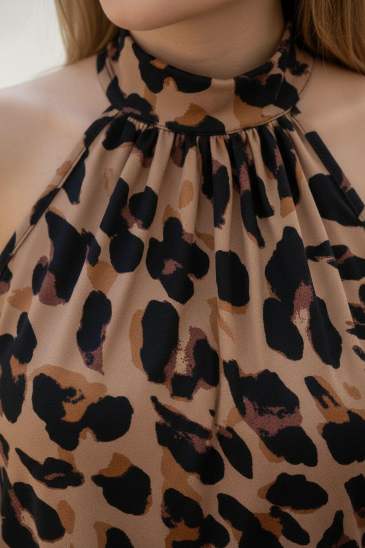 Upright Neck Sleeveless Leopard Pattern Single Jersey Blouse - Leopard