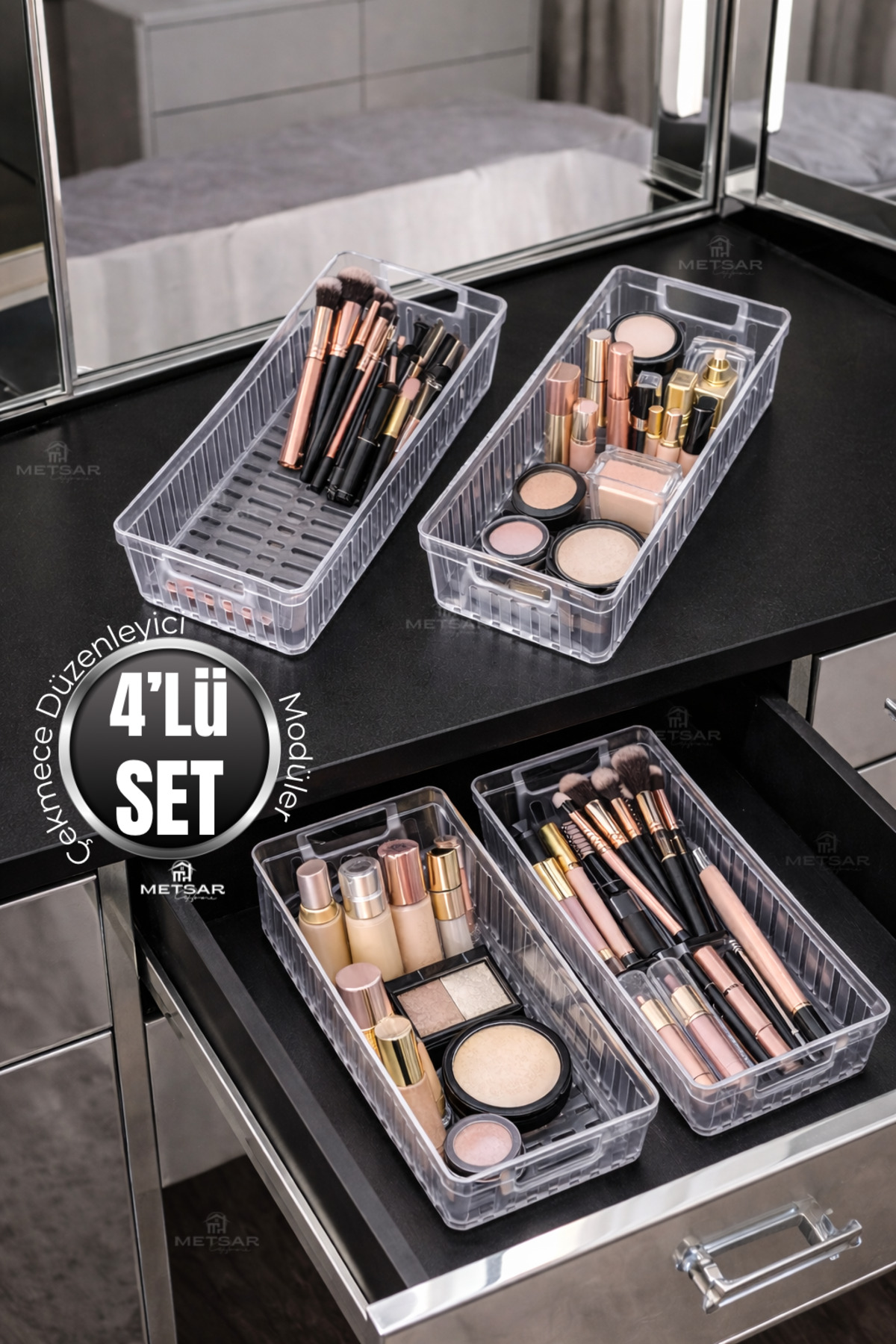 4-piece transparent mega size makeup organizer allows you to keep your makeup tidy and easily accessible.